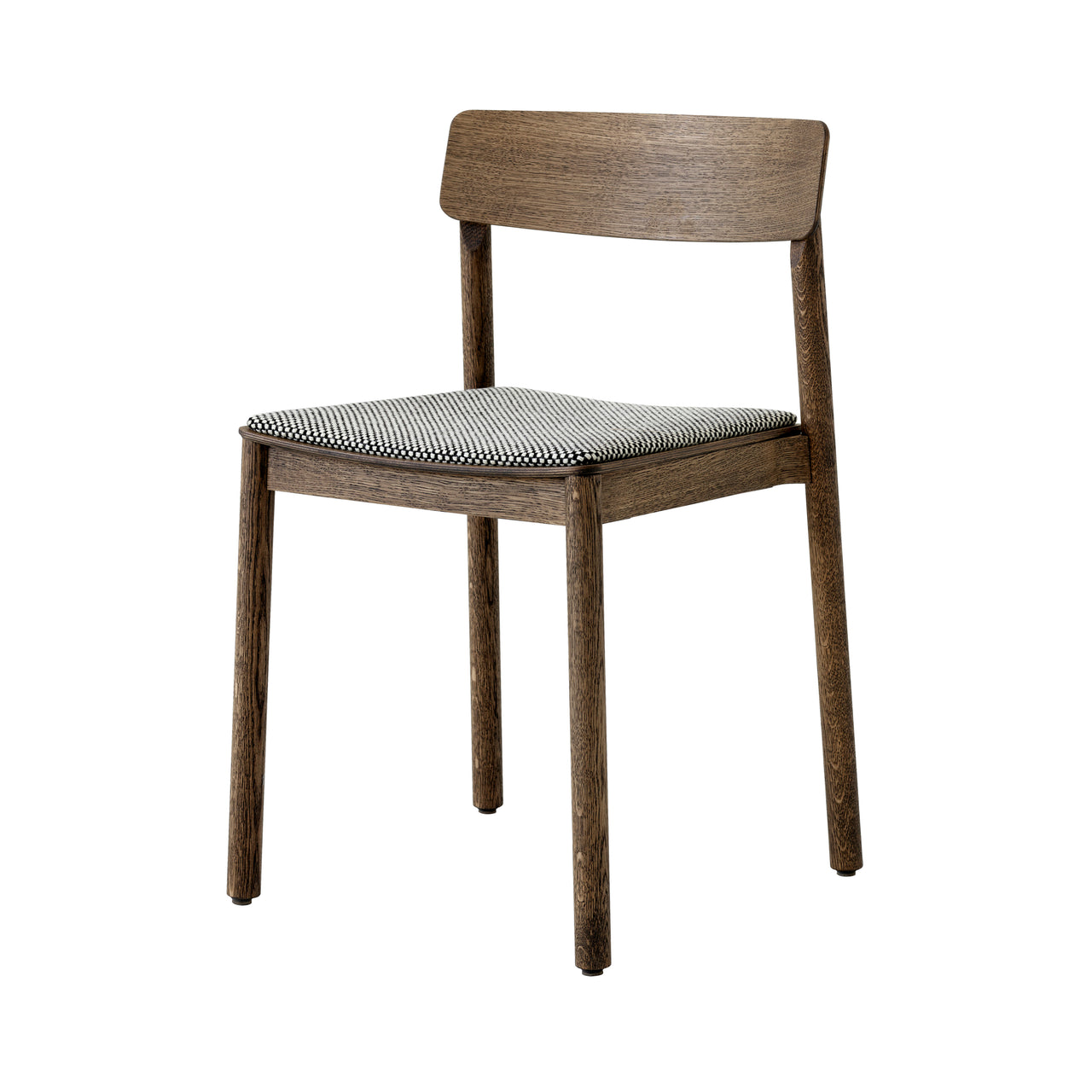 Design duo Thau & Kallio add a chair with an upholstered seat to &Tradition’s range named after Copenhagen’s Betty Nansen Theatre, originally a wood pavilion built in 1857. Made from sustainably sourced, solid timber with a formpressed veneer backrest, the minimalist side chair comes in a black or natural lacquer finish. Stock variants with black or cognac silk leather seats are on offer as well as a variety of custom fabric and leather options.