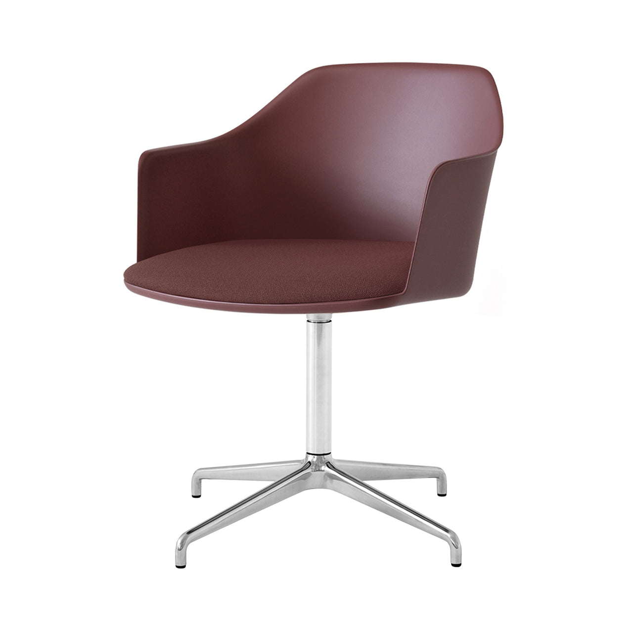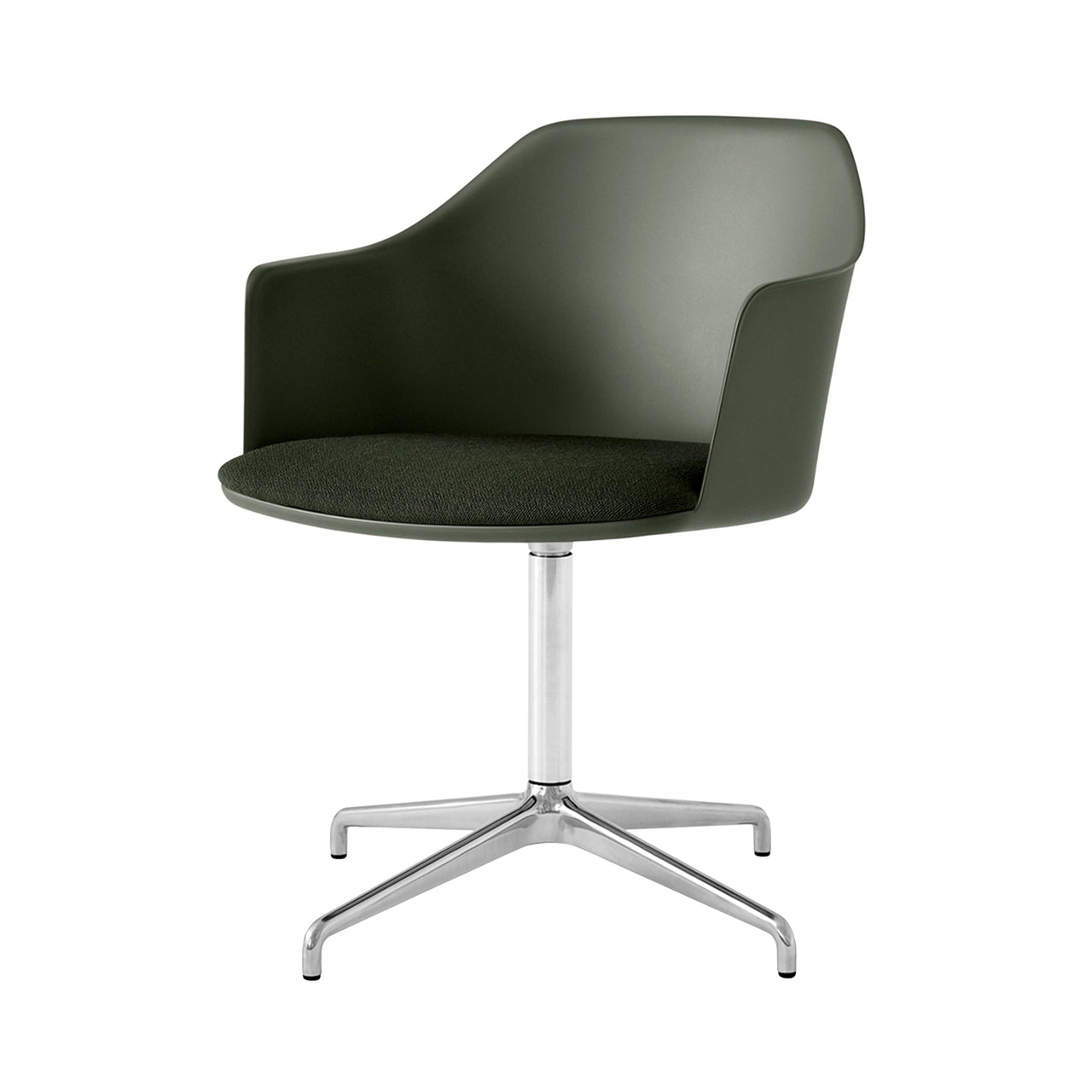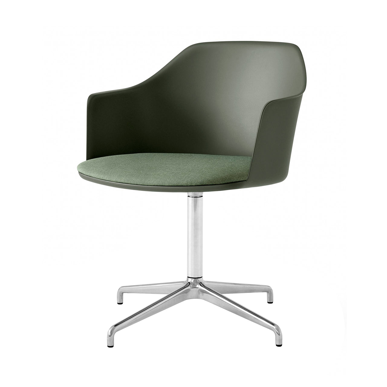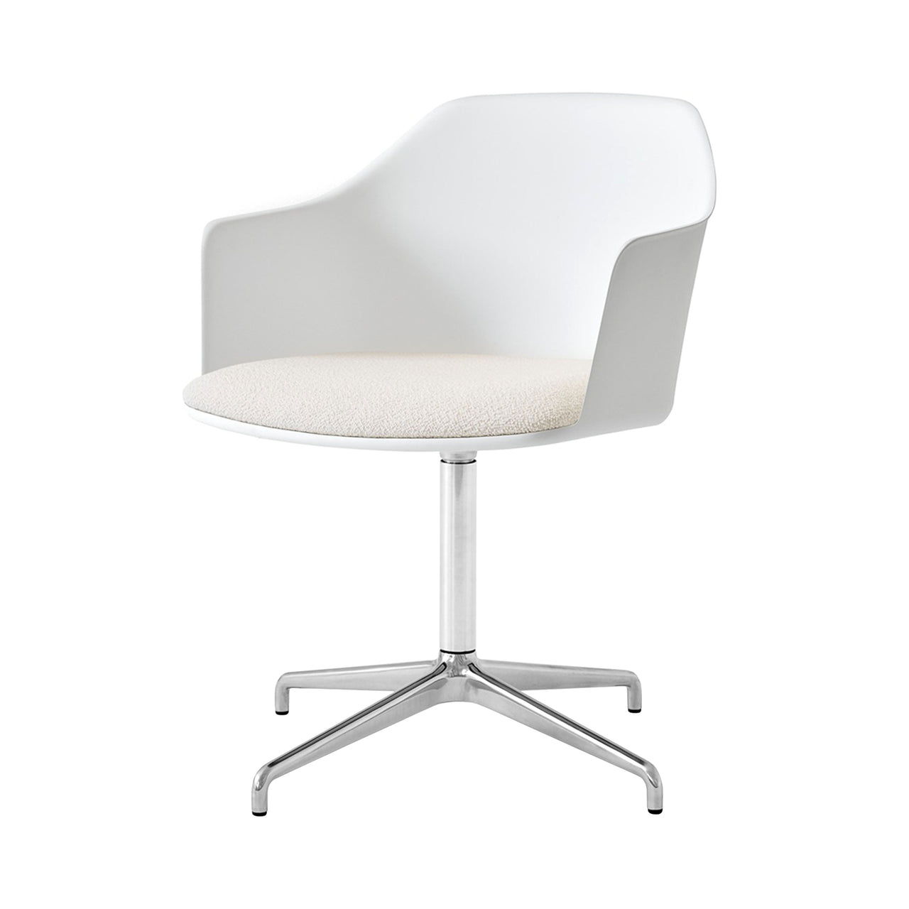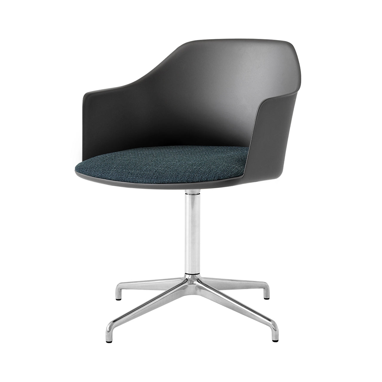 A swivel base in polished aluminum adds extra shine as well as practical utility to Hee Welling’s sustainable shell armchair with a custom-upholstered seat. Rely's molded shell is made from 100% recycled plastic, with contours that curve around the body comfortably and extend out along the side to provide optimal back support. Choose from fine textile and leather selections for the foam-fill cushion, to pair with &Tradition's range of chair options in neutral tones or select accent hues.