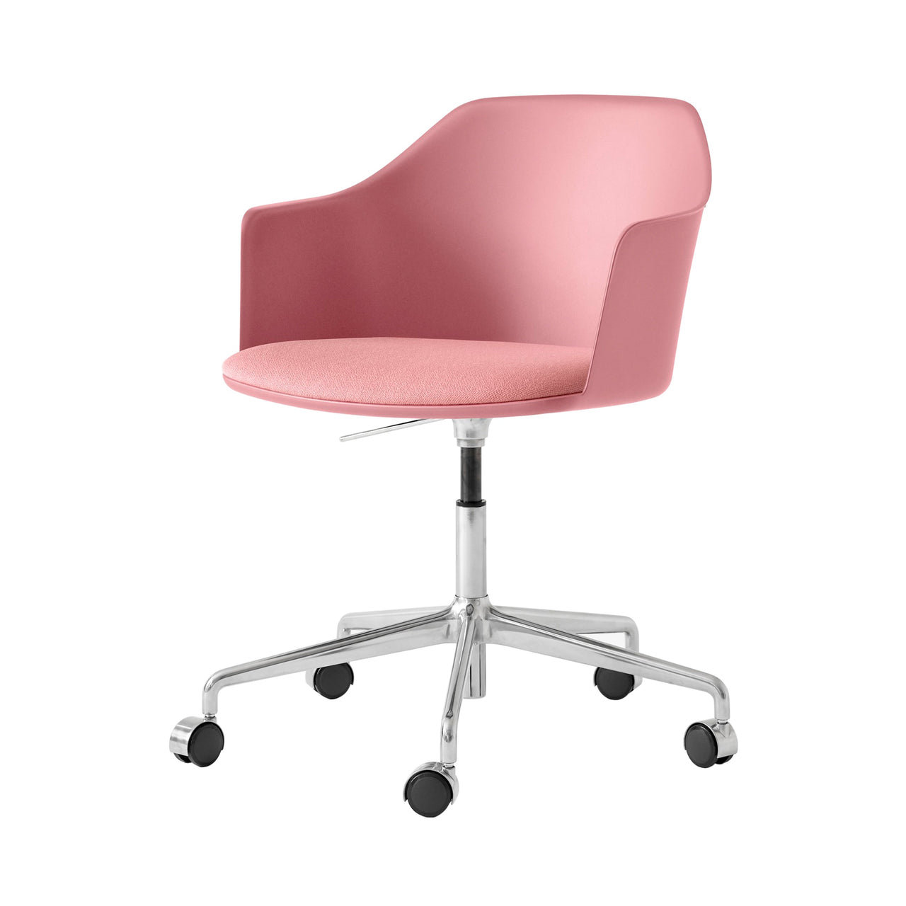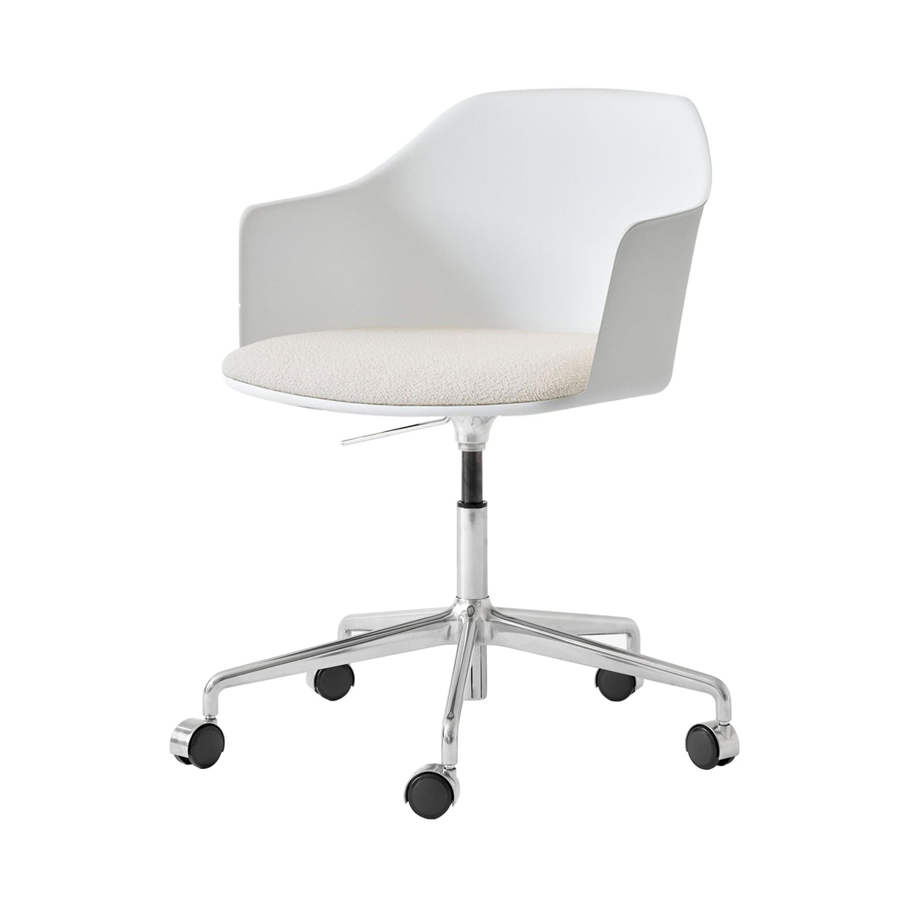 &Tradition pulls out all the stops with this upholstered-seat Rely model equipped with convenient automatic gas lift as well as a 5-star rolling base with castors in gleaming aluminum. Designer Hee Welling's sustainable take on iconic Danish molded seating is made from 100% recycled polypropylene, curving around the body and extending out along the sides for comfortable back support. A wealth of fine fabric and leather options for the HR foam-fill seat complements the silvery polished base finish.