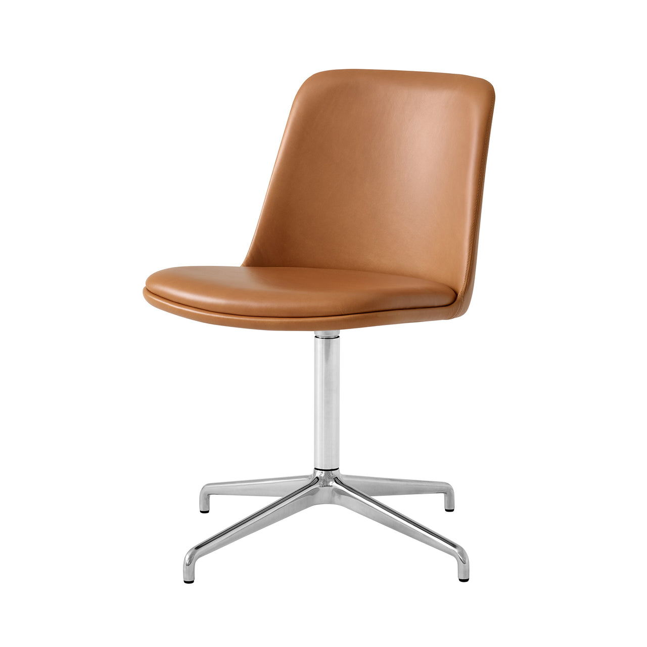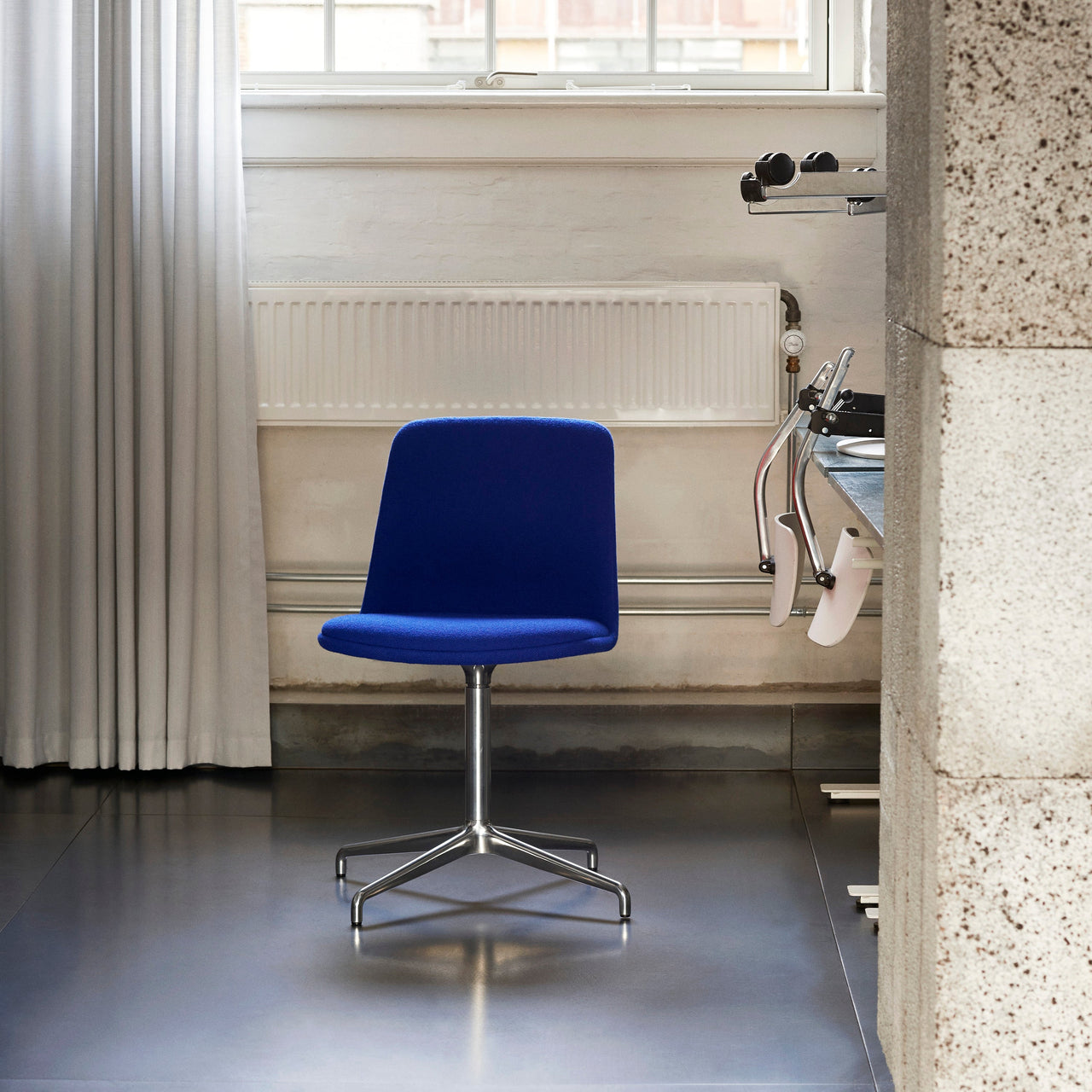 Custom-upholstered with a matching seat cushion, this variant of Rely is paired with a handy swivel base. Designer Hee Welling’s breakthrough shell chair made of 100 percent recycled plastic underpins the choice of premium fabric or leather over a layer of HR foam to offer ergonomic comfort as well as a strikingly made-to-order appearance. Made of extruded aluminum, the swivel base comes in a chrome, bronzed or powder-coated black finish.