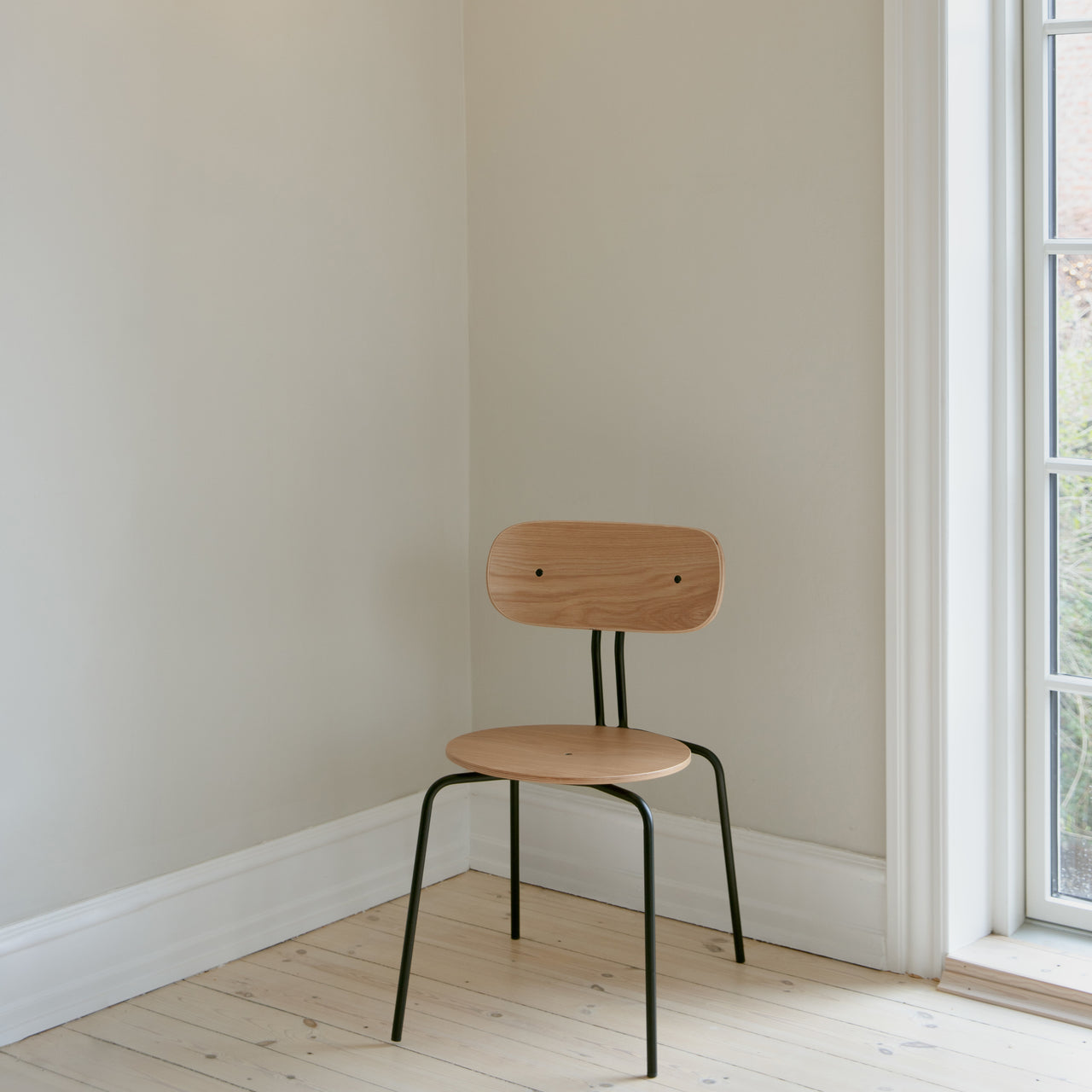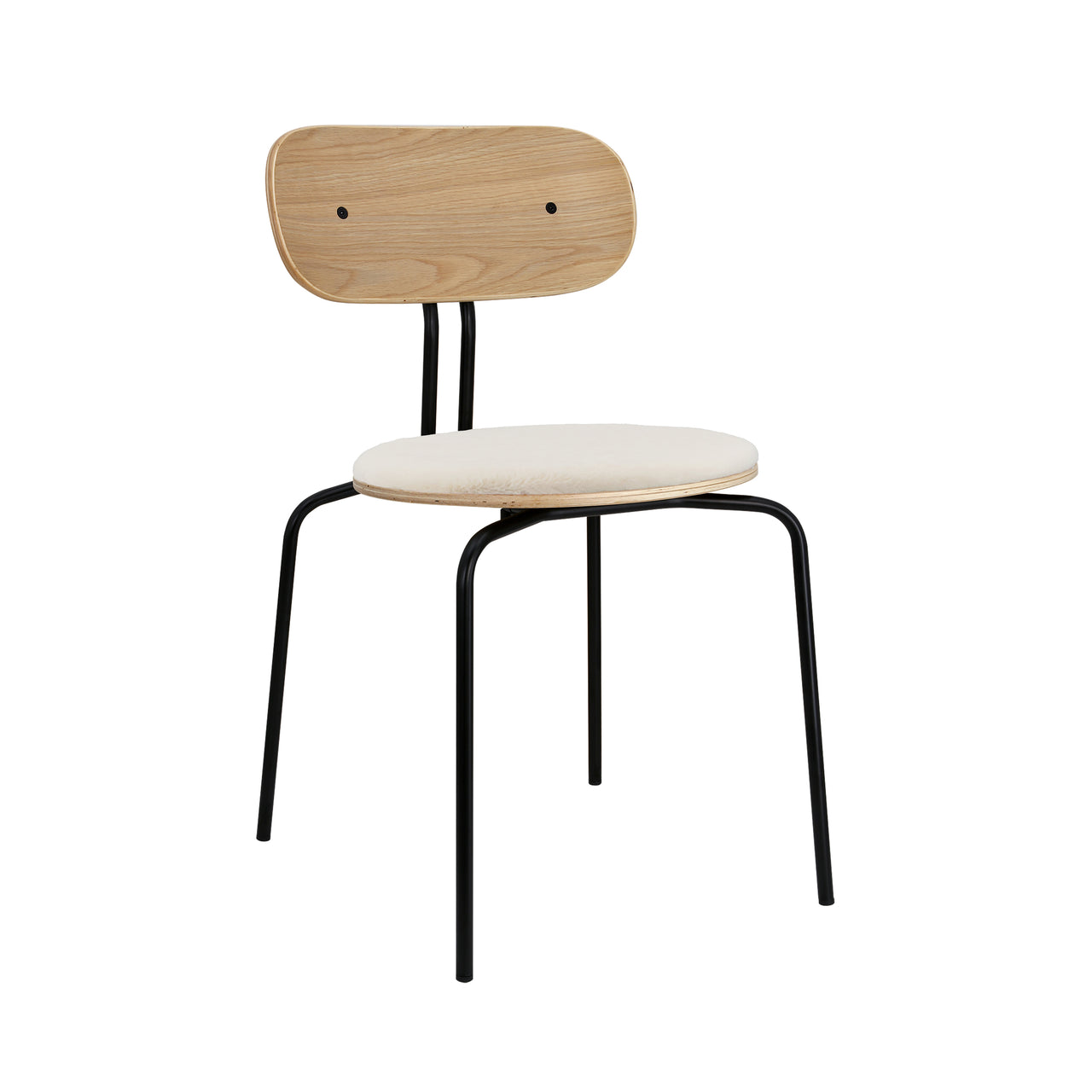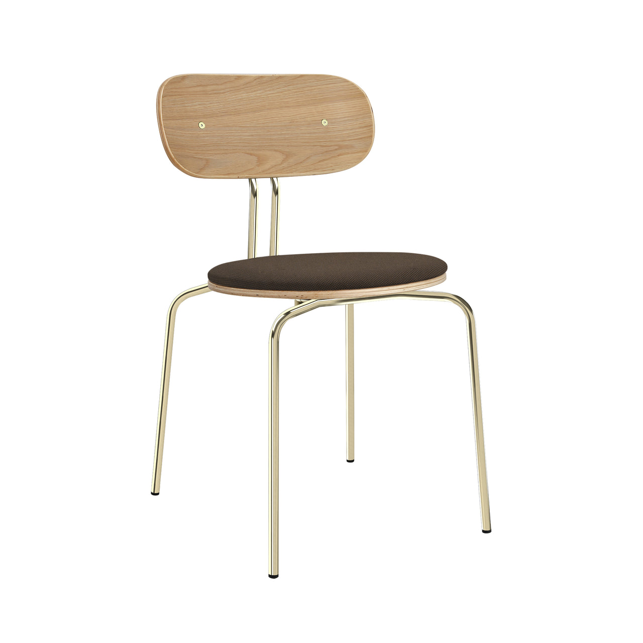 The Curious Chair is a stackable seating option crafted from oak veneer, available with brass or black legs. Designed by Luigi Vittorio Cittadini, it offers an optional seat cushion in 17 colors of 100% recycled Horizons fabric. This chair is suitable for various settings, including dining areas, dressing tables, and living rooms.