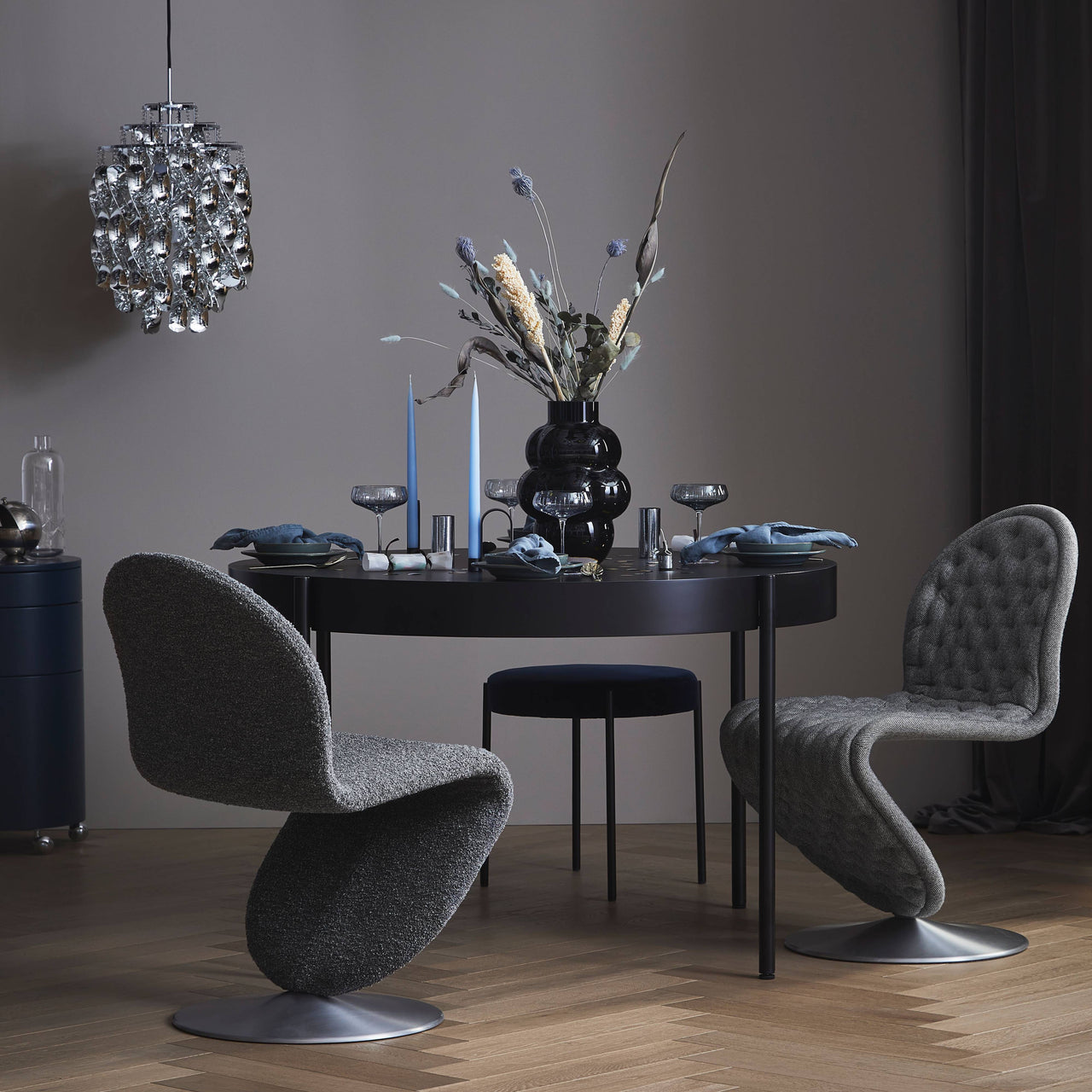 Plush tufted upholstery denotes the deluxe version of Verner Panton’s iconic S-shaped dining chair. System 1-2-3 swivel seating fulfills his desire “to design furniture that grows up out of the floor—to turn (it) into something organic and never with four legs." With either a brushed aluminum disc or polished chrome butterfly base and its sinuous foam-padded form, Panton’s 1973 view toward the future lives on as a timeless paragon of style.
