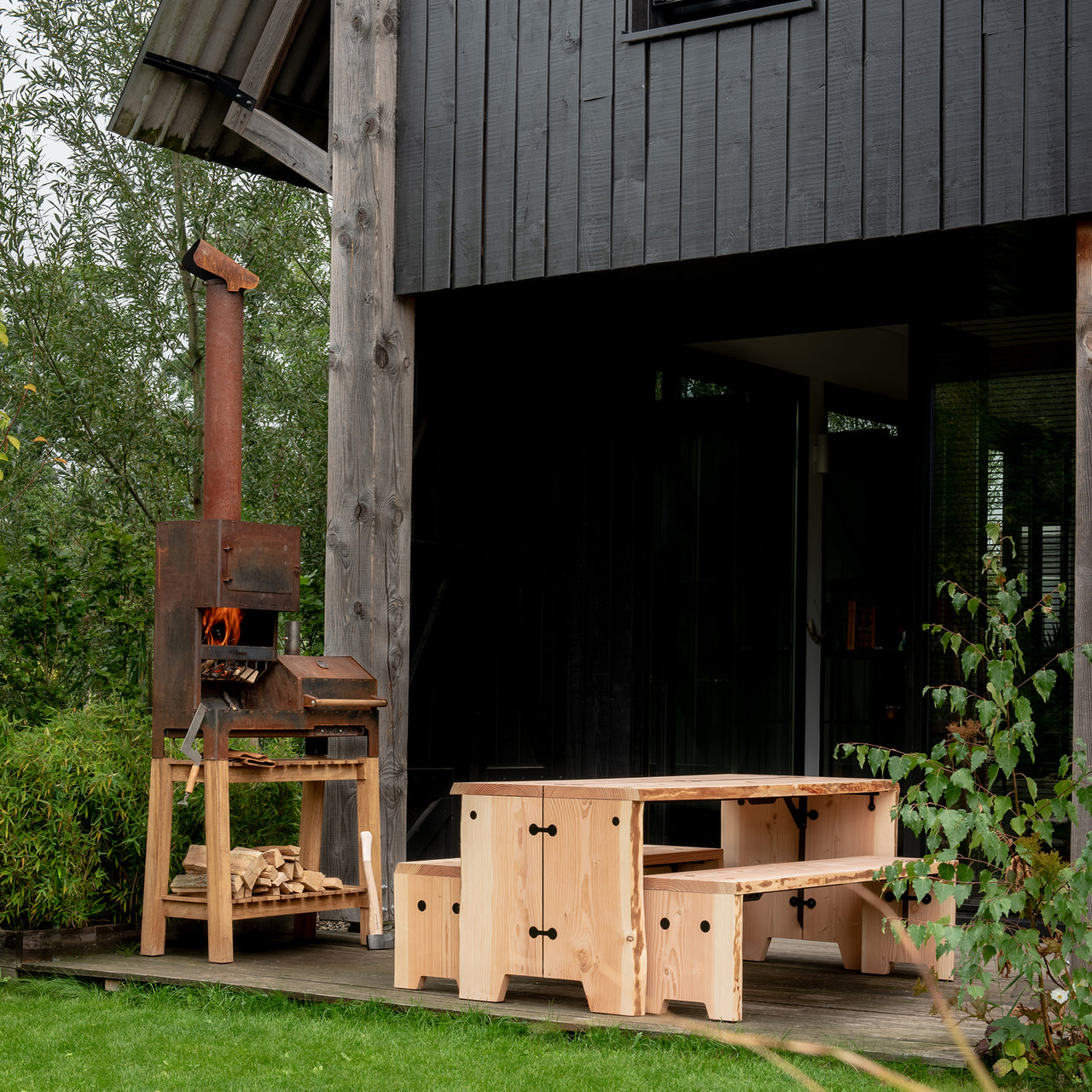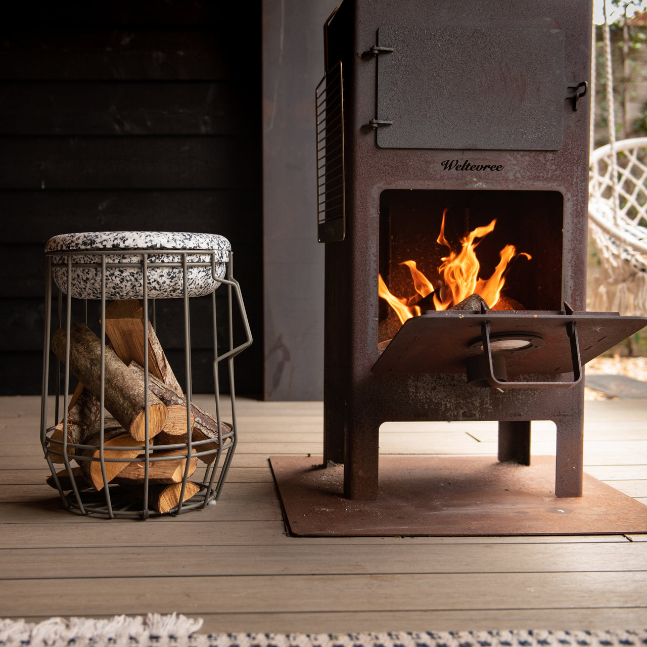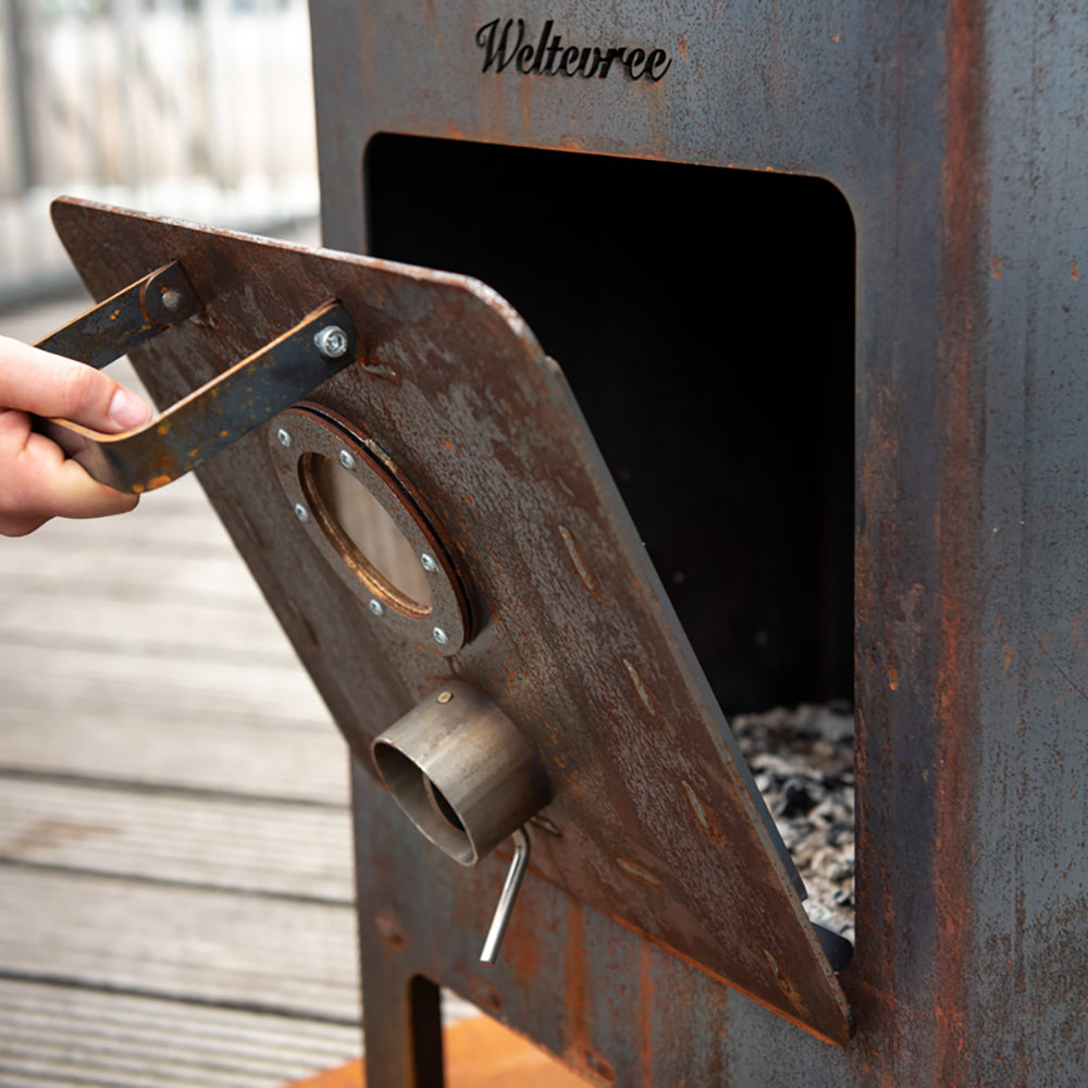 Weltevree offers several add-ons to improve the efficacy of Outdooroven and Outdooroven XL. Extra Meter Pipe is an extension for the chimney that safely allows extra ventilation. That causes a stronger draft effect which improves heat distribution for less cooking time. (The extension is easily added since it fits perfectly onto the standard Outdooroven pipe.) Chimney Cowl protects the oven pipe against rain and also orients the draft in the optimal direction in windy conditions. Magnetic Thermometer accurately relates when the oven reaches the desired cooking temperature.
