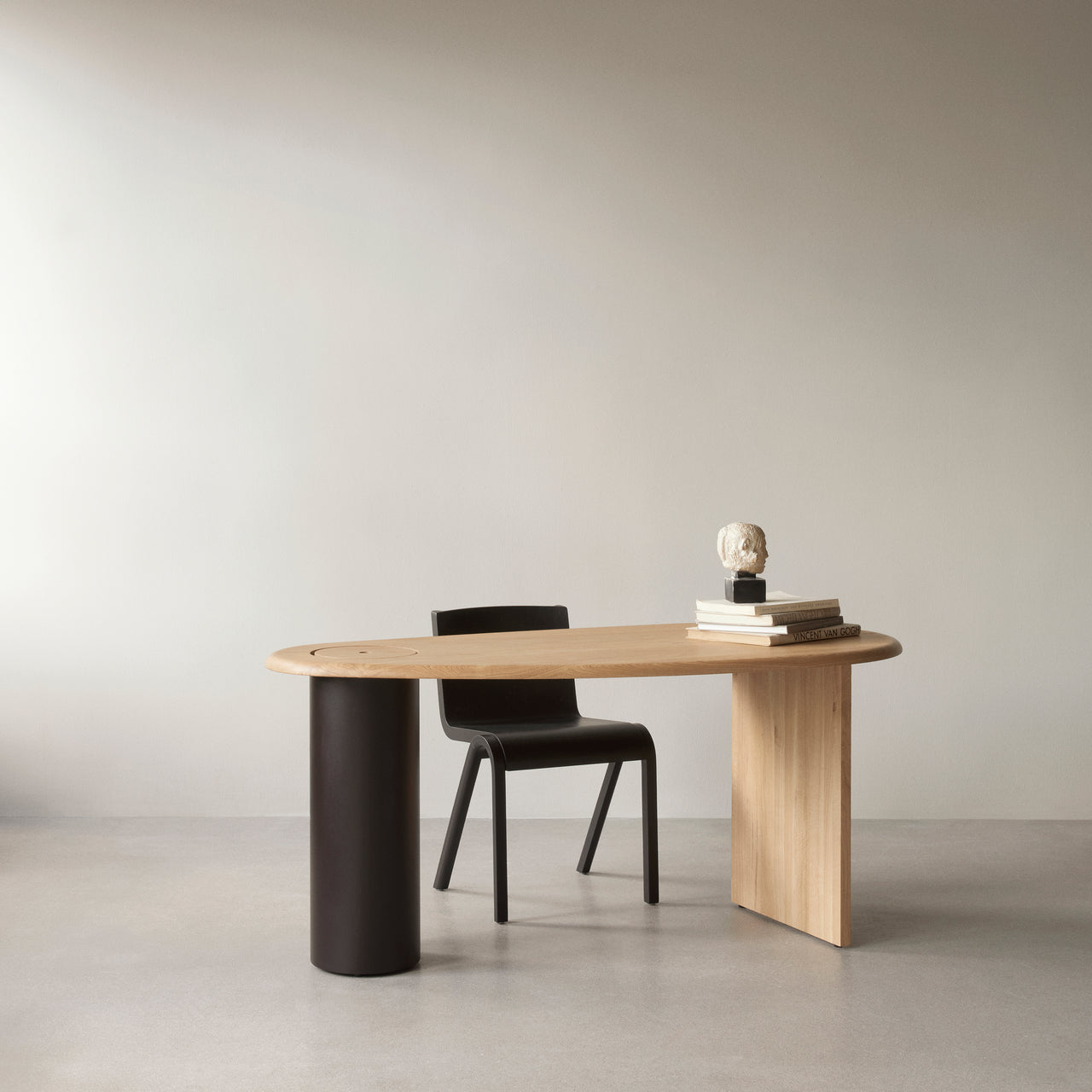 Named after the path of passing celestial bodies in the sky, Eclipse's oval breaks the mold of the usual desktop. Crafted in solid oak, the sweeping expanse is fitted with a lid that lifts to reveal a hidden storage bucket in the metal column leg, allowing the surface of UK designer Fred Rigby's desk to stay clutter-free whether it's placed in the middle of a room or up against a wall.