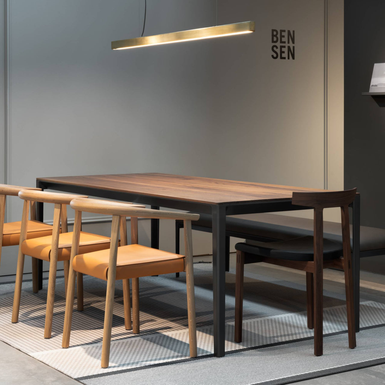 Able's thin beveled edge lends a sense of visual lightness to the range of dining tables from Bensen, the Canadian design group founded in 1981 by Niels Bendtsen, a native of Denmark who originally learned his trade by apprenticing with his father, a Danish furniture designer. Fashioned in cast aluminum, the table frame is as sleek as it is strong—yet it's also remarkably lightweight. With varied available sizes, Able tabletops are offered in wood, marble and Polaris.