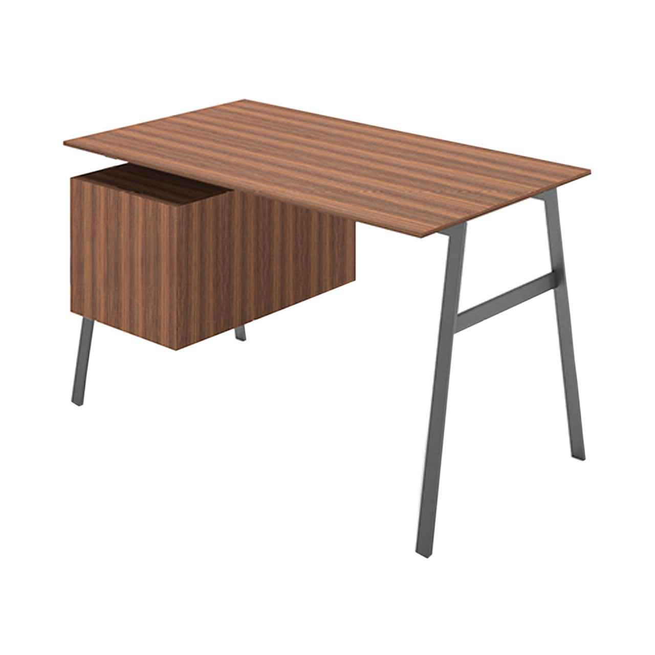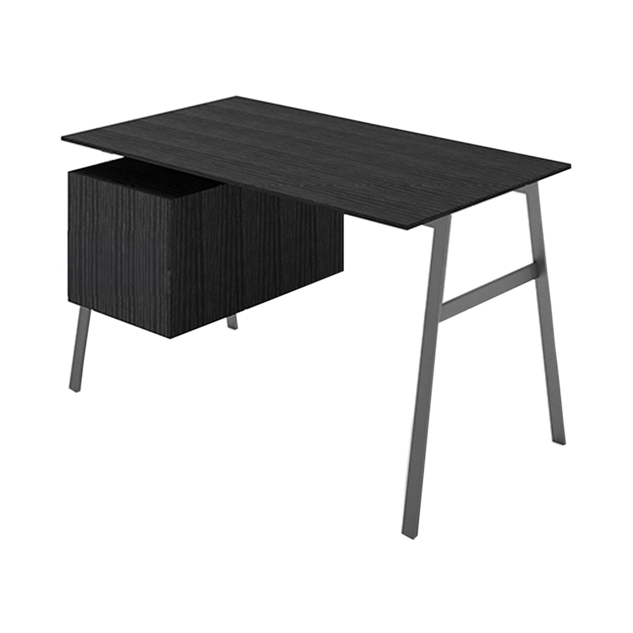This desk features a floating drawer design that creates an open appearance. The file drawer fits both letter and legal-size files and includes a concealed compartment to keep cables and accessories organized. The drawer fronts come in wood veneers or high-gloss lacquer options.