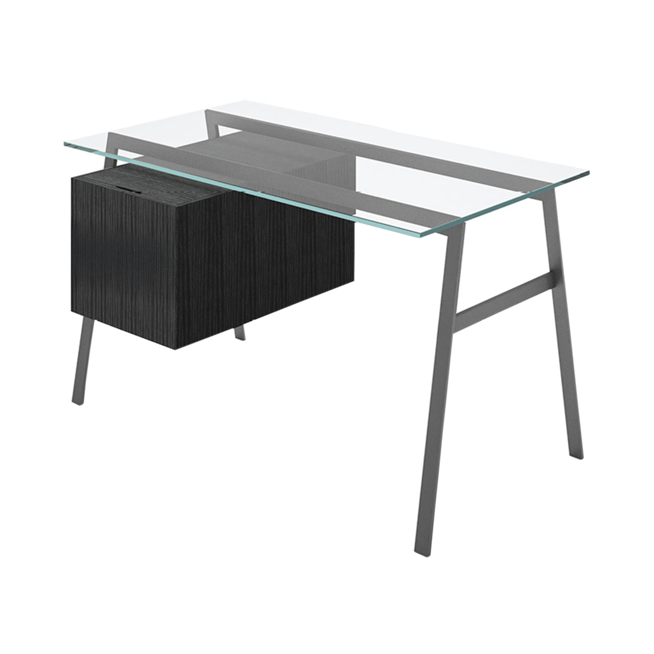 The Homework 1 Desk features a tempered glass top and a file drawer positioned on the left side, designed to hold both letter and legal-size files. The drawer is equipped with soft-close runners for smooth operation and includes a concealed cable management compartment to keep the workspace organized. The desk is supported by sturdy steel legs, available in mirror-finished chrome, powder-coated gunmetal, or powder-coated white, ensuring durability and a clean look.