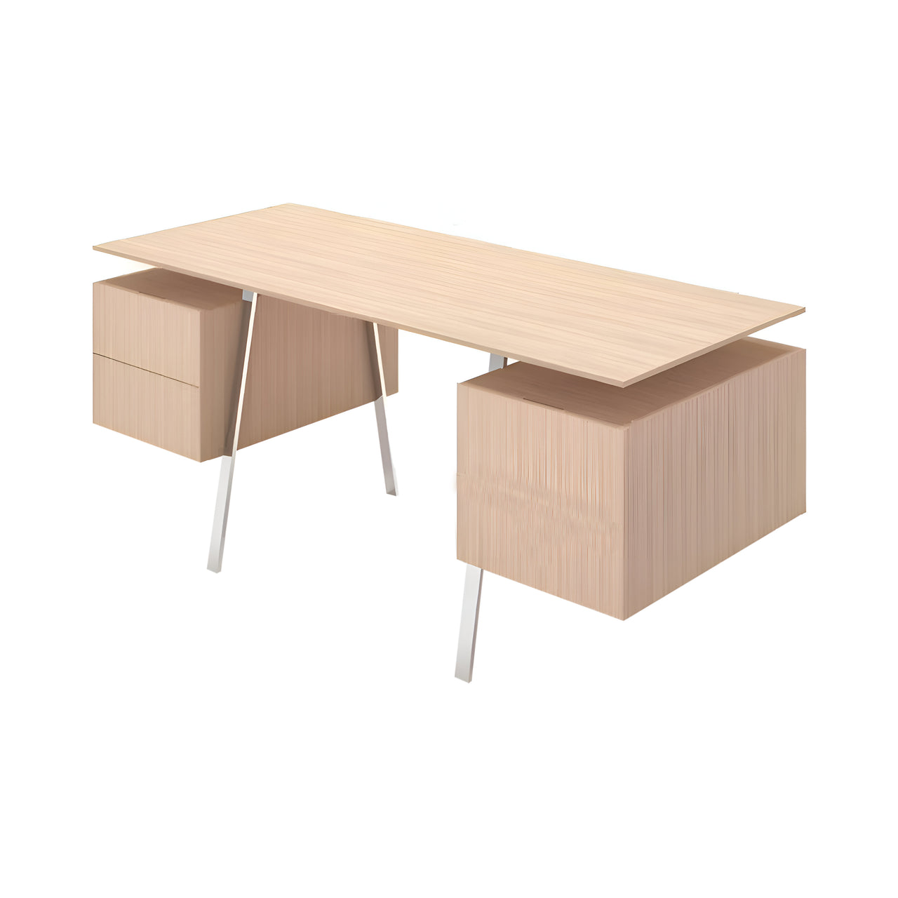 In a capacious desk configuration with a right-handed file drawer and left double drawers, Bensen’s larger Homework 2 proves itself a design-worthy workhorse. Within its exceedingly sturdy metal frame, the cantilevered wood storage elements appear to float underneath a clear glass or wood desktop. Drawers available in either carefully matched veneers or ultra high-gloss polyurethane are equipped with soft-close runners and a cable-management space and the file drawer can be easily adjusted to both letter and legal size.
