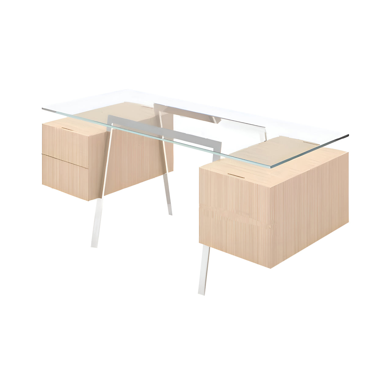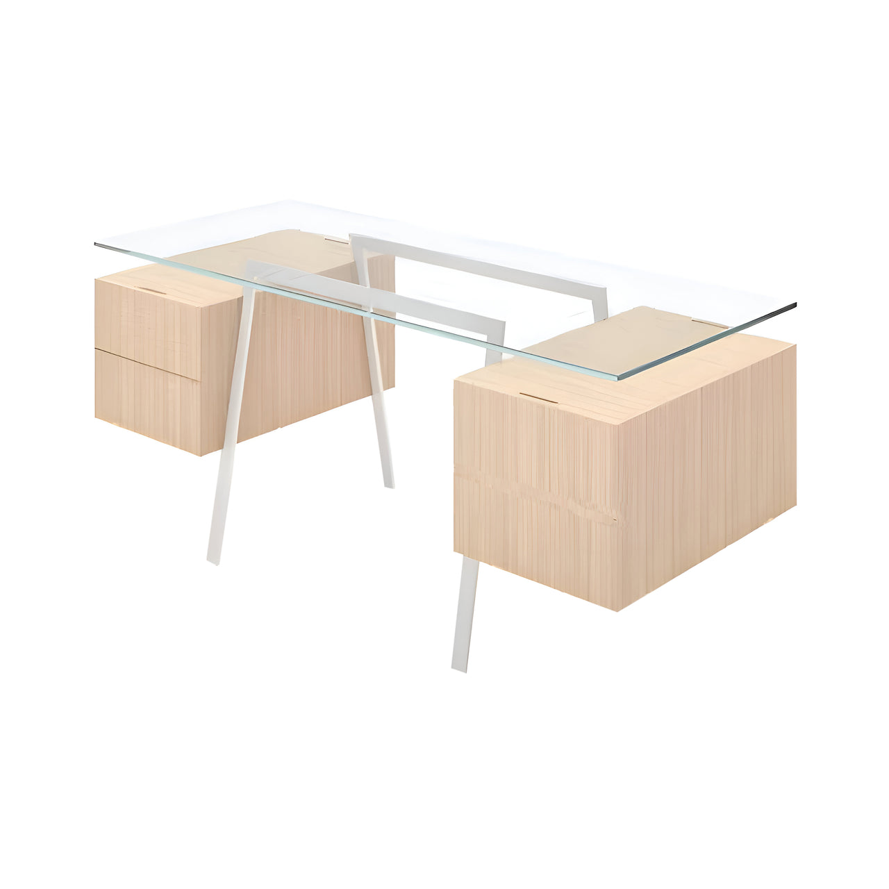 In a capacious desk configuration with a right-handed file drawer and left double drawers, Bensen’s larger Homework 2 proves itself a design-worthy workhorse. Within its exceedingly sturdy metal frame, the cantilevered wood storage elements appear to float underneath a clear glass or wood desktop. Drawers available in either carefully matched veneers or ultra high-gloss polyurethane are equipped with soft-close runners and a cable-management space and the file drawer can be easily adjusted to both letter and legal size.