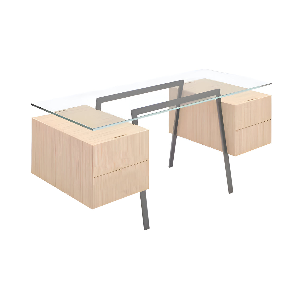 This version of Homework 2 offers expanded storage with 2 sets of double drawers but still retains the clean-lined look of the Bensen desk series. The cantilevered drawers almost appear to float within the frame and thoughtful touches include soft-close runners and cable-management compartments. Assembling this sturdy desk is a simple task with only a few bolts needed and, when finished, it's designed to seen from all sides. Finish choices abound, with drawers in either wood veneer or ultra high-gloss polyurethane. Choose desktop in matte-lacquer wood finishes to match the drawers or durable tempered glass.