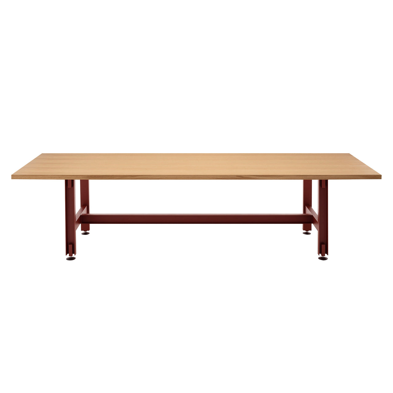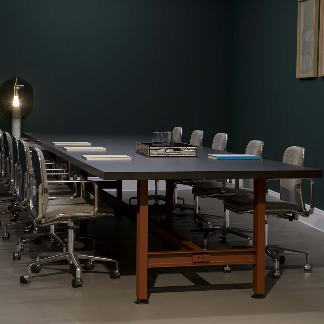 “The working environment is no longer about meeting rooms, task chairs and desk systems,” says Established & Sons director Sebastian Wrong. In turn, designer Konstantin Grcic conceives his multitasking Beam Table, equally at home in an artisan workshop, a gallery, or a live-work space. Based on a durable construction icon, rolled steel I beams form the structure, coated in a fine-textured powder coat in either black or red oxide and sitting on adjustable round feet that help protect the floor beneath. (Optional lockable swivel castors are available.) The expansive solid-lipped tabletops are offered in matte oak veneer, high-pressure laminate in black and in black Fenix, a heat- and scratch-resistant, premium surface material.
