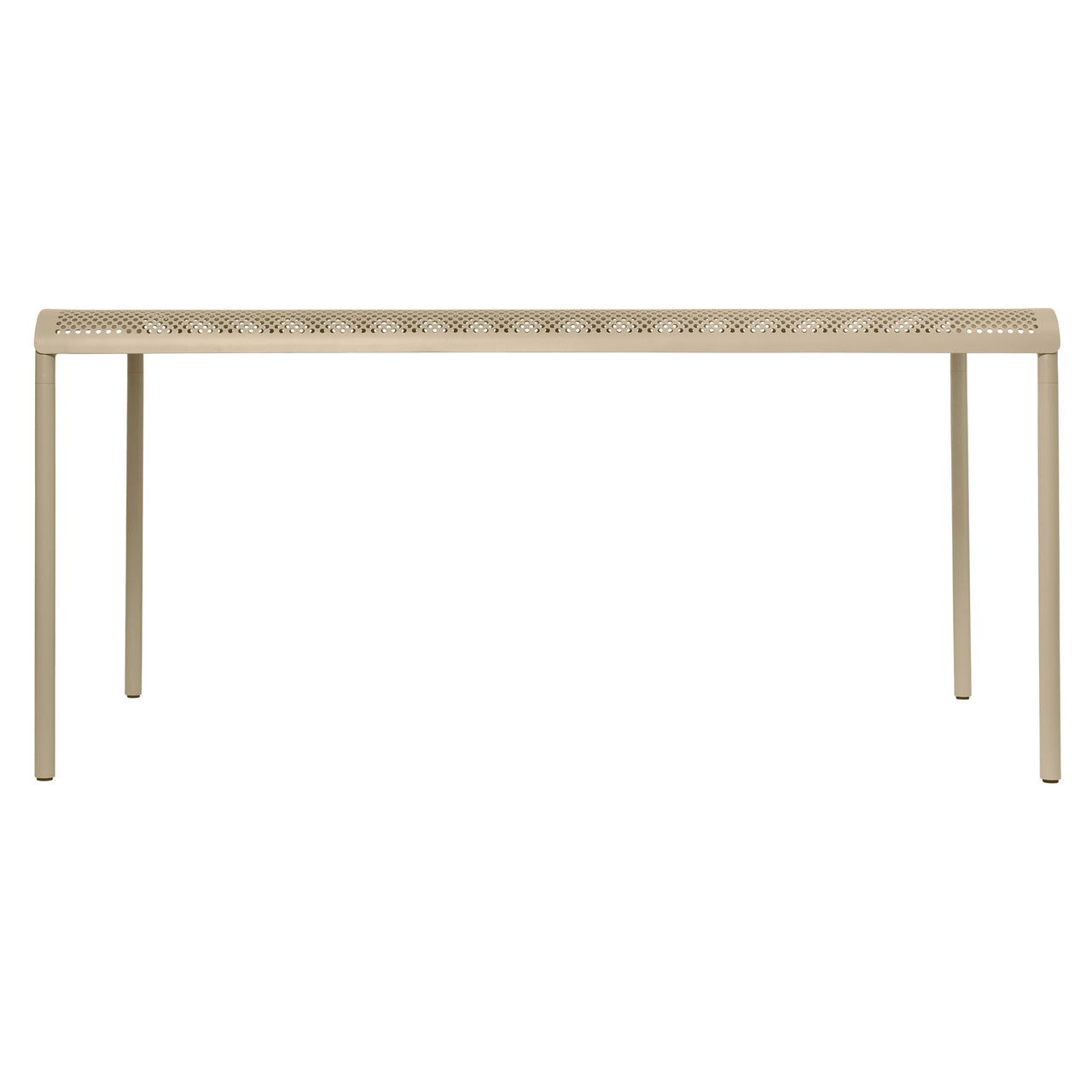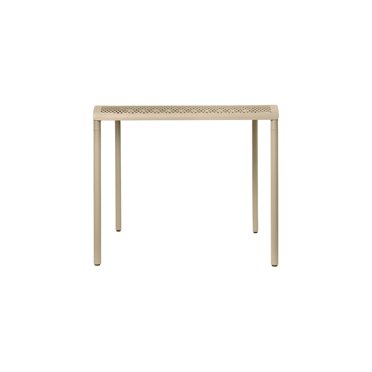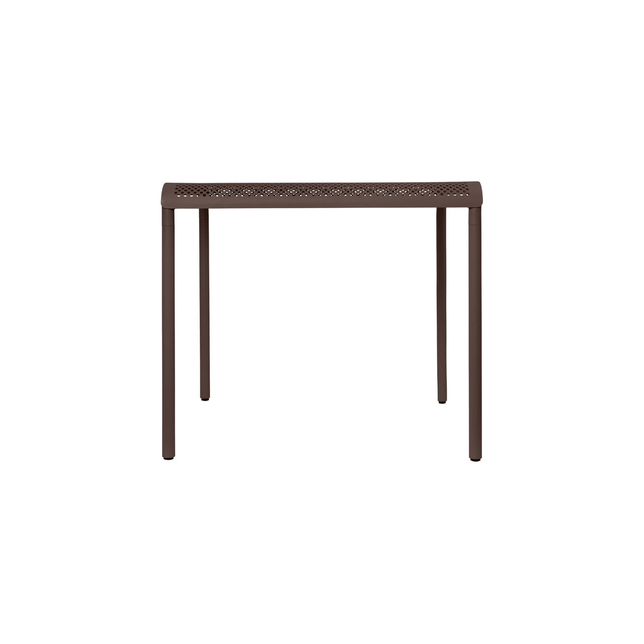 Perforated sections on the tabletop allow water to drain easily, helping the table dry quickly after rain. Made from powder-coated galvanised steel, it is built for long-term outdoor use. The table is available in two sizes and comes in Cashmere, Dark Chocolate, and Tea Green finishes.