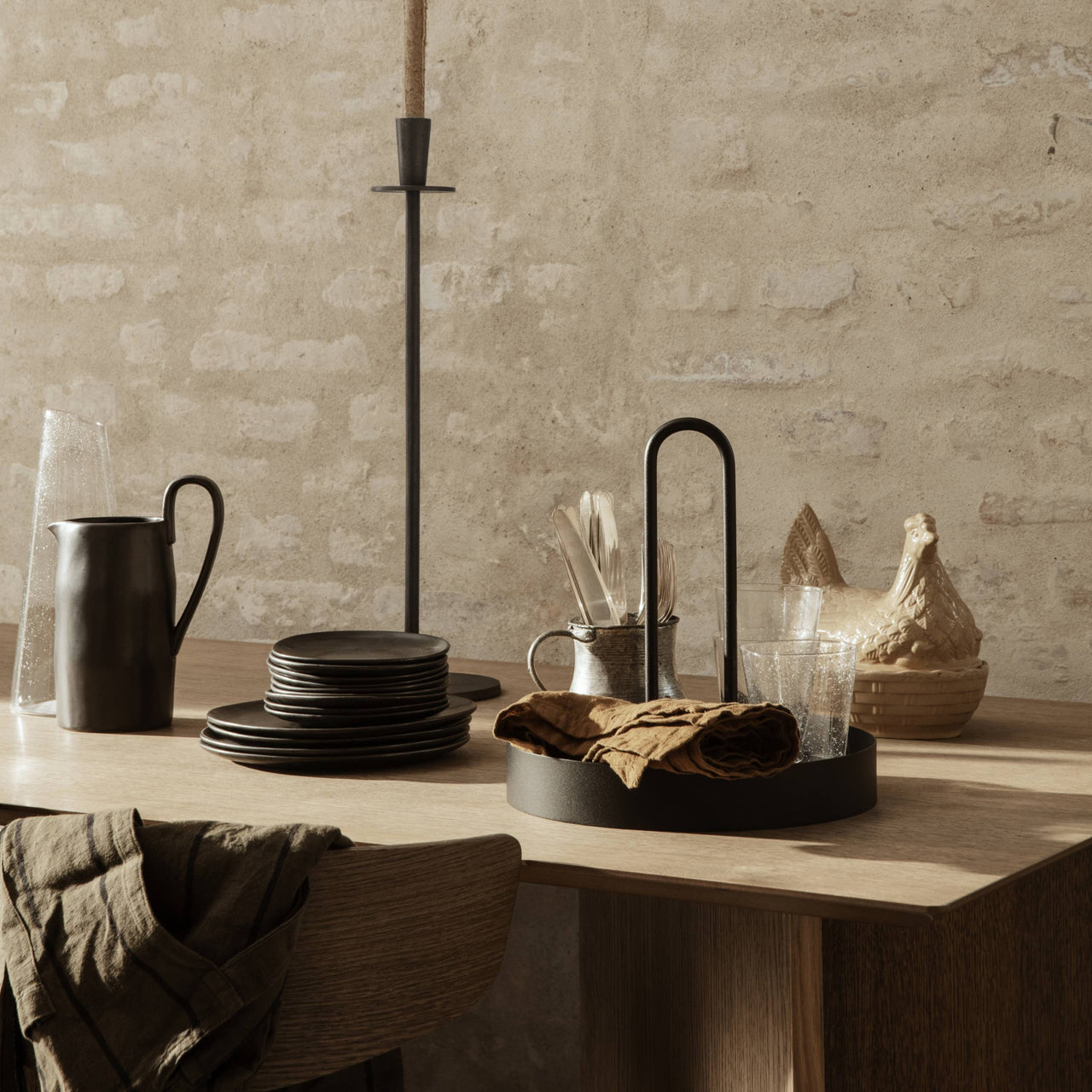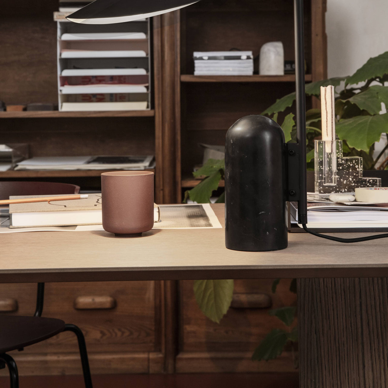 With its wood-veneer base, this version of Mingle takes on a solid, sculptural dimension. Ferm Living’s dining table is crafted in sustainably sourced oak and the V-shaped legs come in a natural, dark or black finish. Available in 3 sizes to suit differing spaces, the tabletop comes in a choice of oak to match the base, a contrasting wood finish or in a hi-tech matte linoleum.