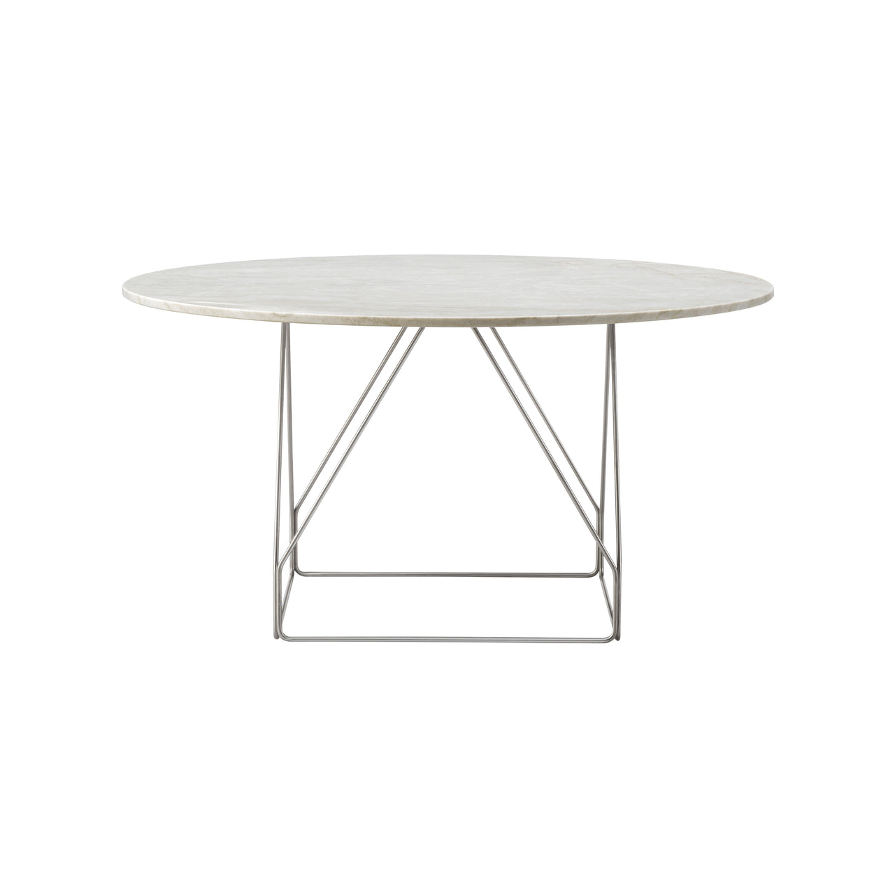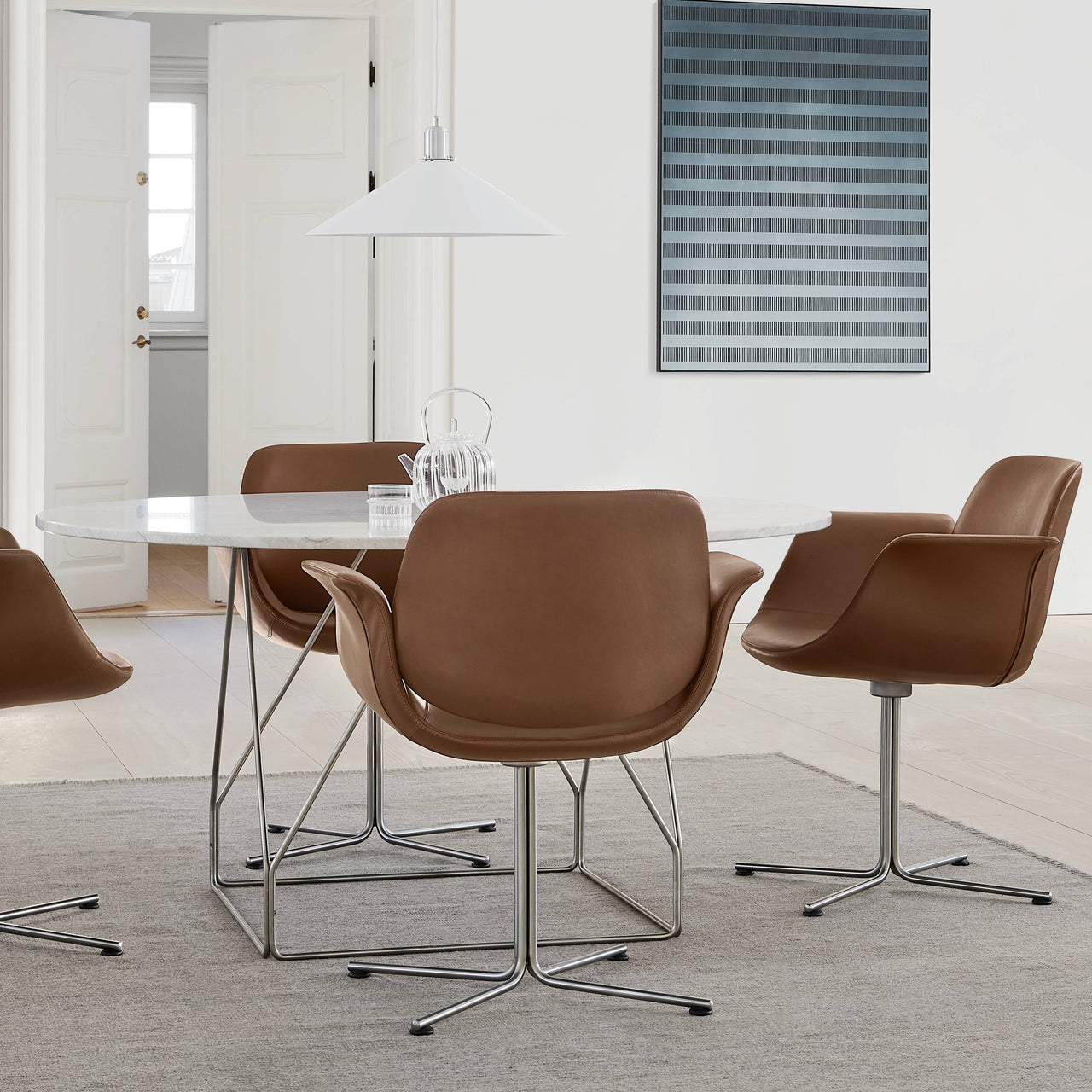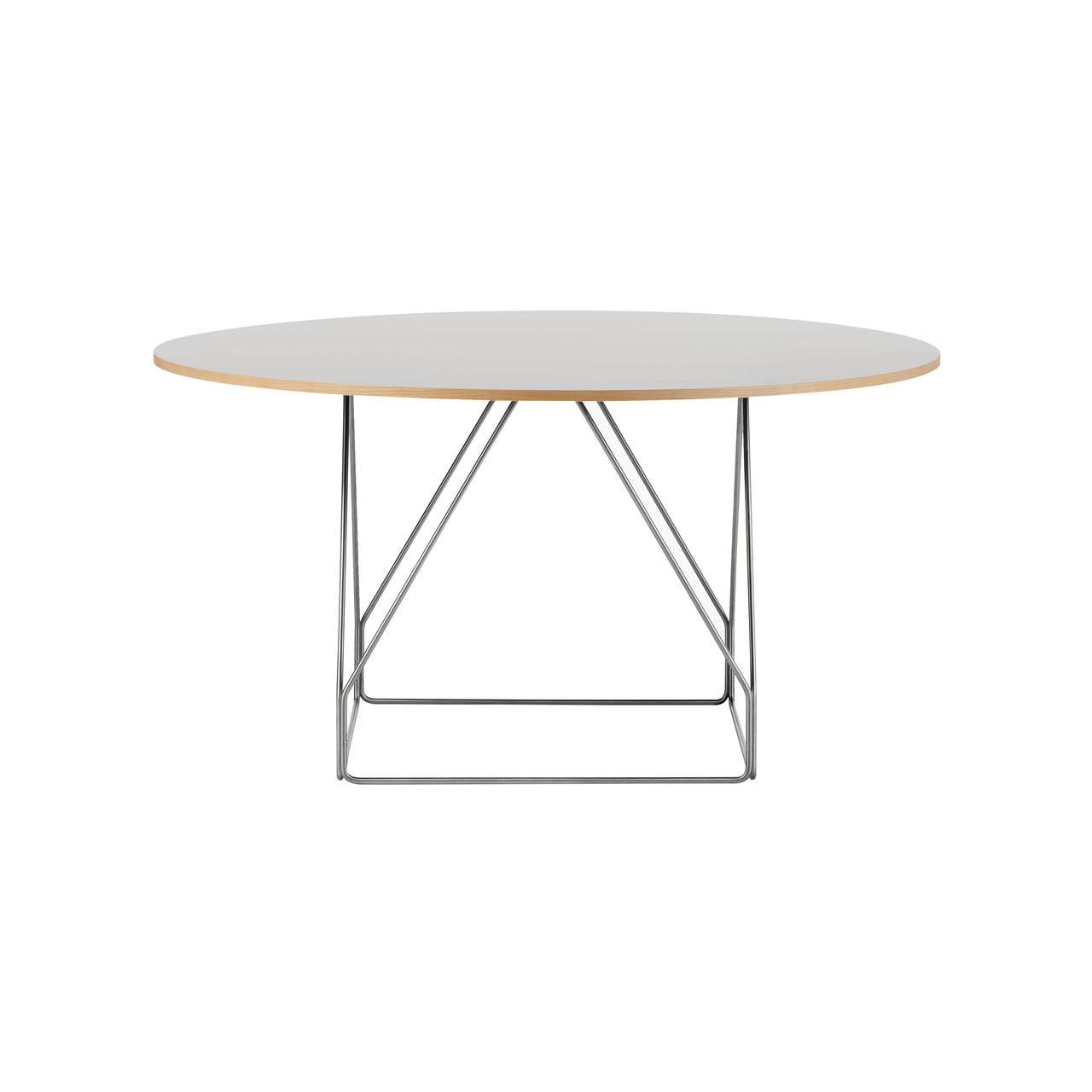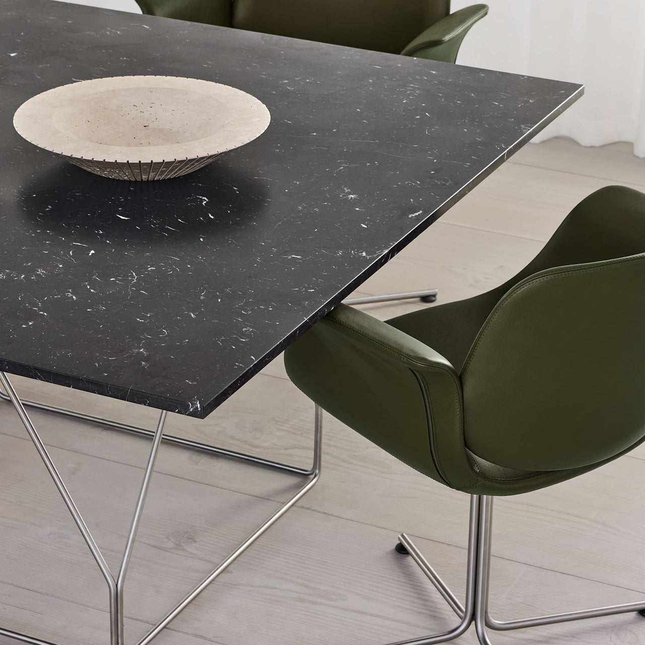 Jørgen Gammelgaard’s enduring 1984 design reflects his desire to create a simple, elegant piece with a supportive structure that would not limit the seating around the table. Providing remarkable stability as well as an intriguing graphic aesthetic, JG Table features a base in stainless steel or powder-coated finish with the choice of a round or square tabletop in varieties of solid stone or in a durable matte linoleum.
