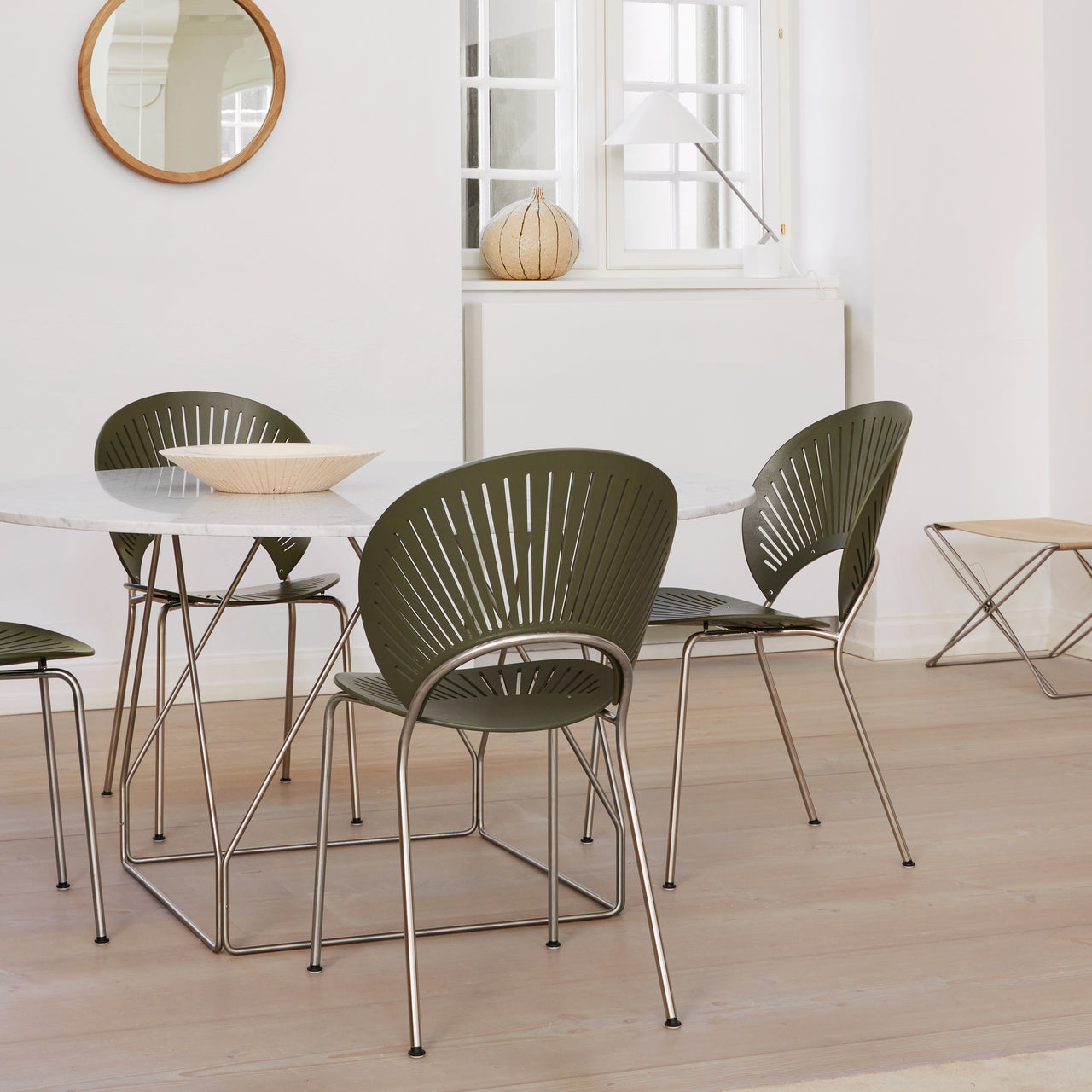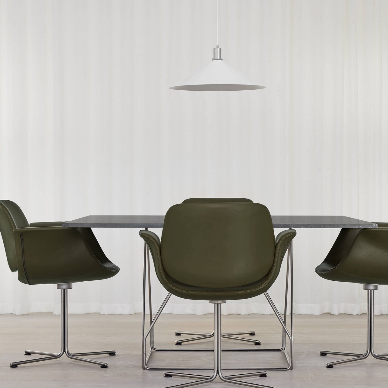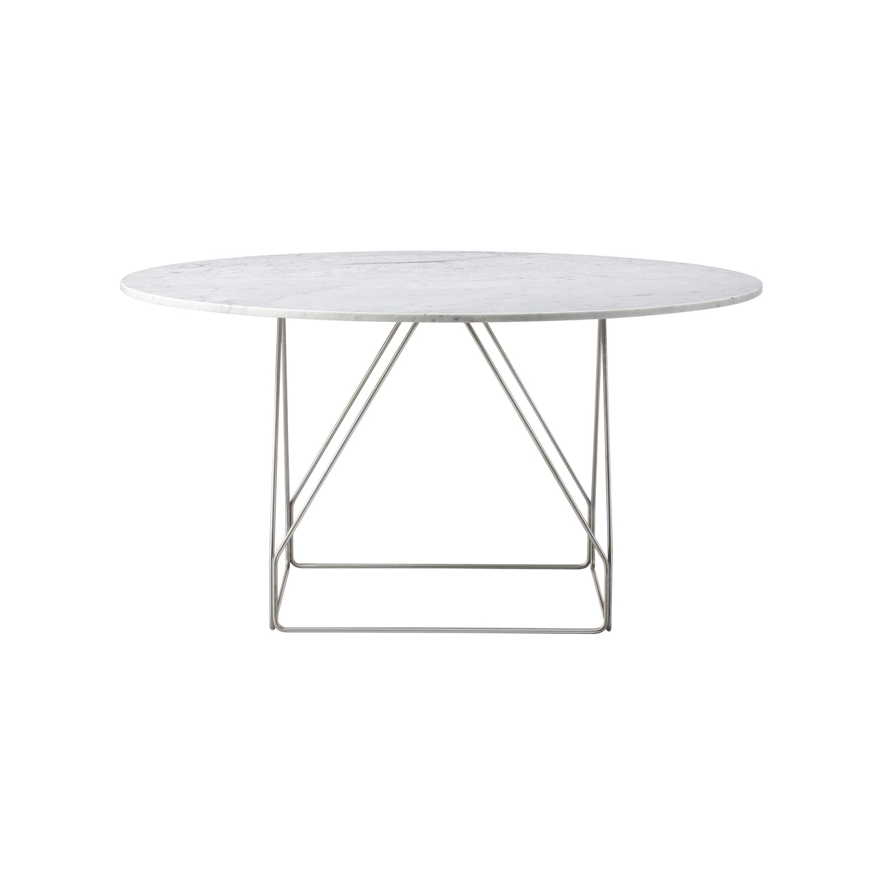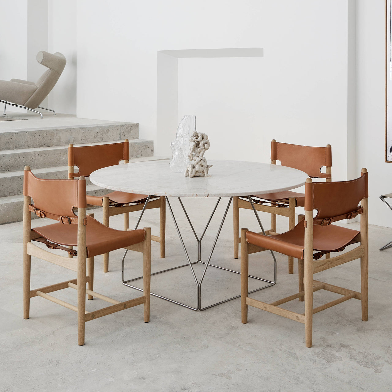 Jørgen Gammelgaard’s enduring 1984 design reflects his desire to create a simple, elegant piece with a supportive structure that would not limit the seating around the table. Providing remarkable stability as well as an intriguing graphic aesthetic, JG Table features a base in stainless steel or powder-coated finish with the choice of a round or square tabletop in varieties of solid stone or in a durable matte linoleum.