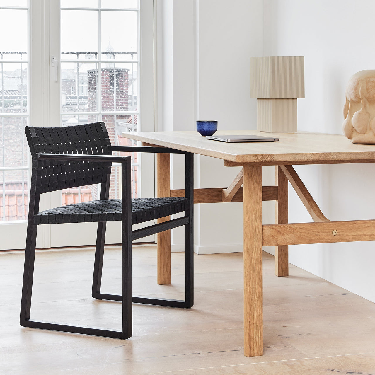 Børge Mogensen’s 6284 Table from 1958 embodies his desire for longevity in a restrained aesthetic, made from the finest selection of solid oak available in a variety of finishes. Inspired by the functional, utilitarian approach of the Shaker movement, his aim was to create beautiful, distinctive furniture by emphasizing simple horizontal and vertical lines and surfaces. That restrained manner imbues the structural beauty of the versatile table’s angled leg support and joinery with a modest appearance intended to create a sense of tranquillity.