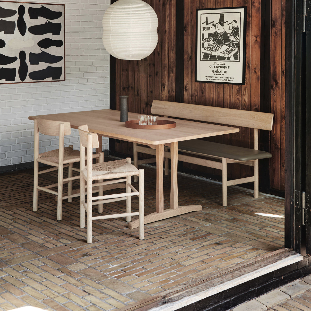Unveiled back in 1947, seminal Danish designer Børge Mogensen’s C18 is one of his enduring variations on a theme of practical and simply elegant tables for everyday living. Made of solid oak in a range of finishes, the dining table has a trestle treatment with brass fittings that patinate beautifully. Thoughtfully retracted leg construction with no obstruction in the corners makes room for virtually any chair to be used and versions also offer extension via 1 or 2 leaves.