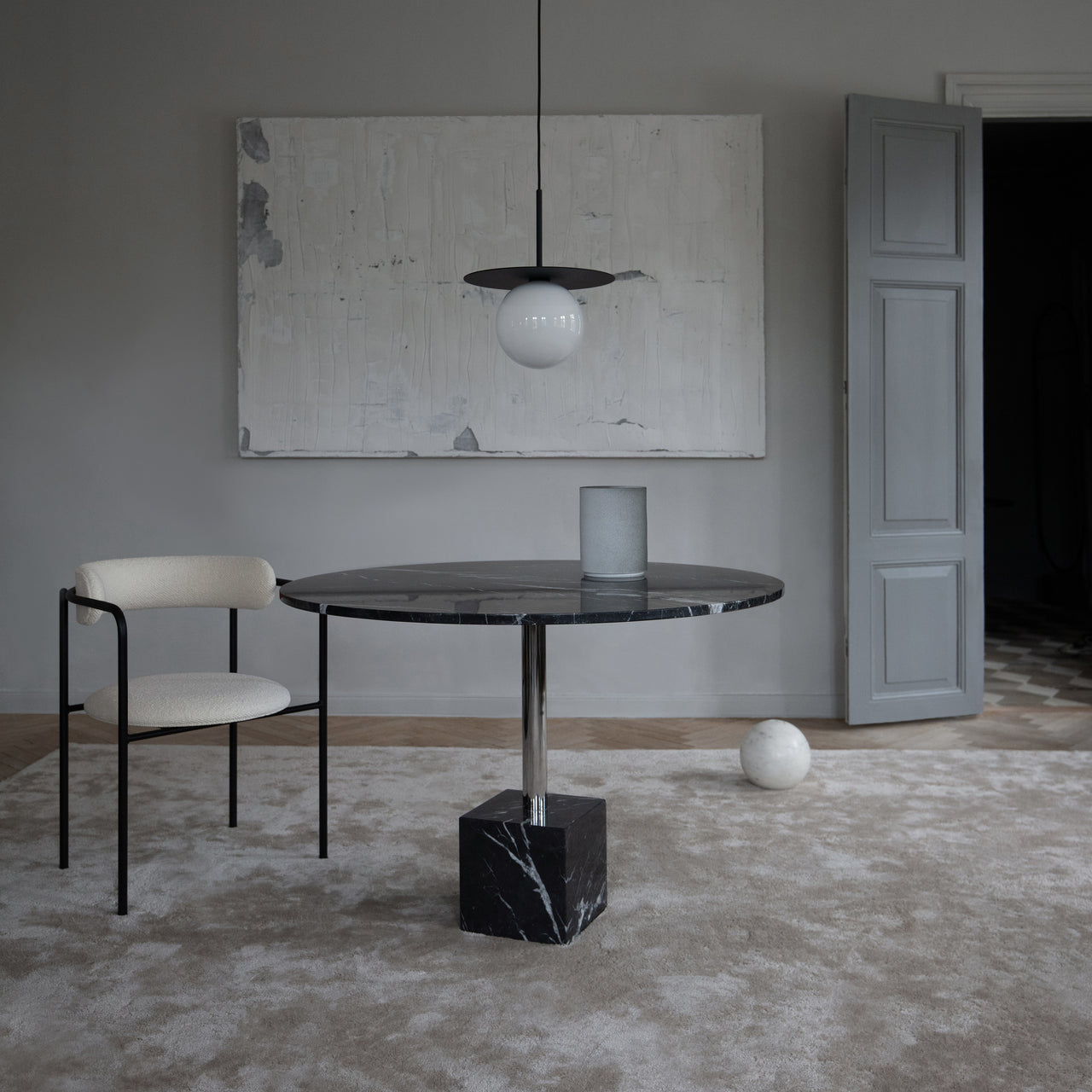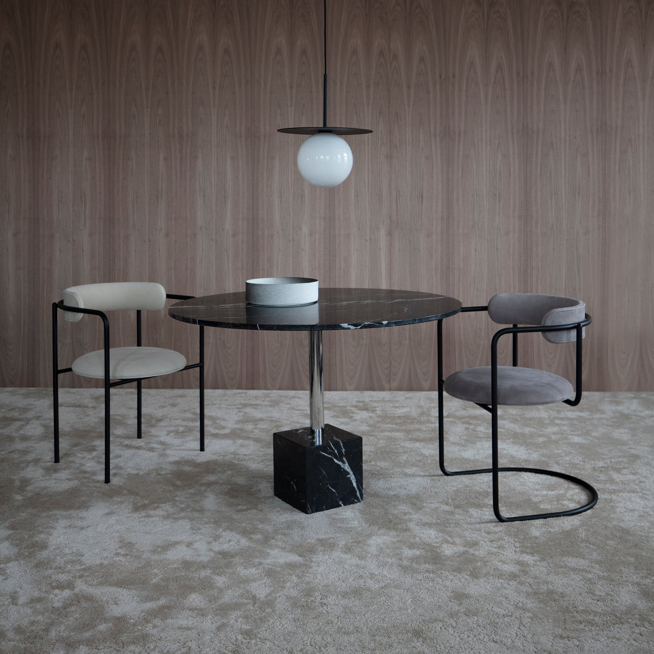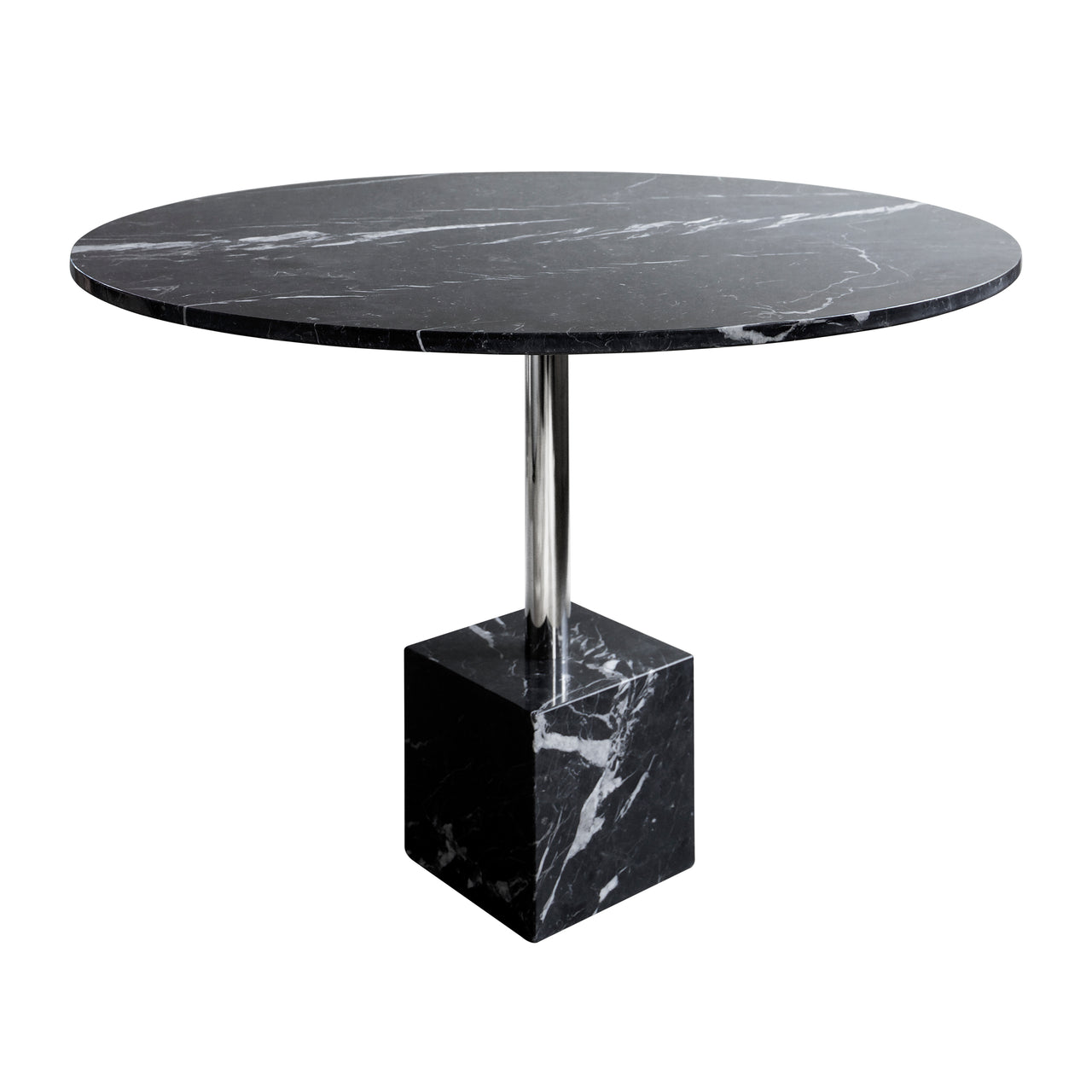 Knockout’s splendid dining table version features a square geometric base and matching round surface in select European marble with a honed satin finish. With its center metal stem offered in matching black, white or with the additional gleam of a chrome finish, the table takes pride of place in both public and residential contexts.