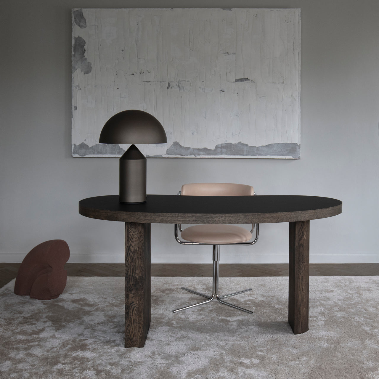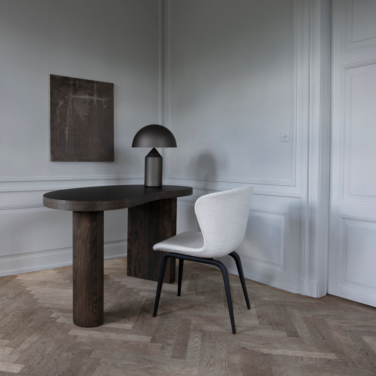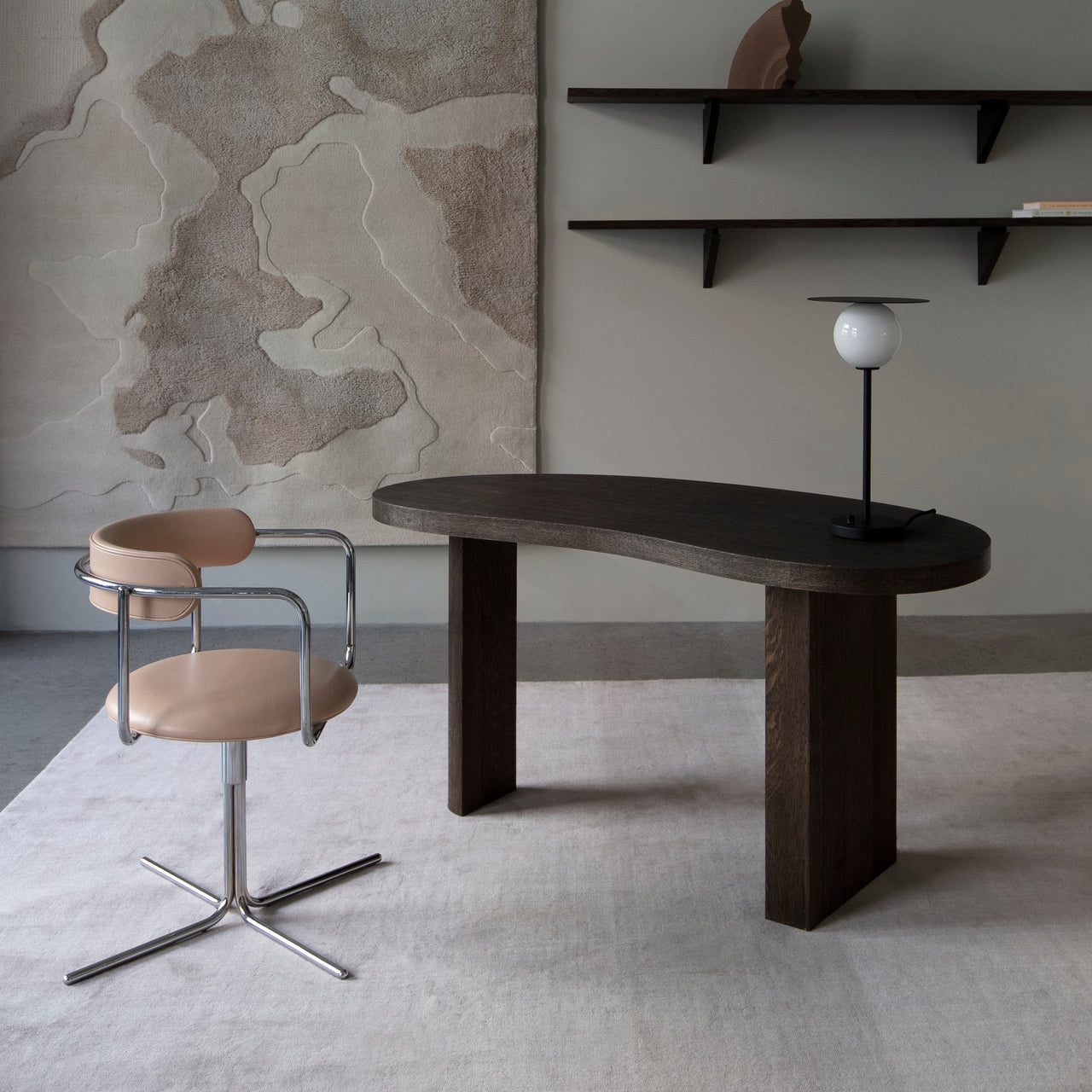 The MS Bean Desk Table is inspired by mid-century modern design, featuring an organic bean-like shape. Its distinct character comes from a mix of wood and laminate in two-tone combinations. The tabletop is available in monochrome wood veneer and supported by solid FSC-certified wood legs. The minimalist design, coupled with contrasting materials, gives it a sleek yet inviting feel.