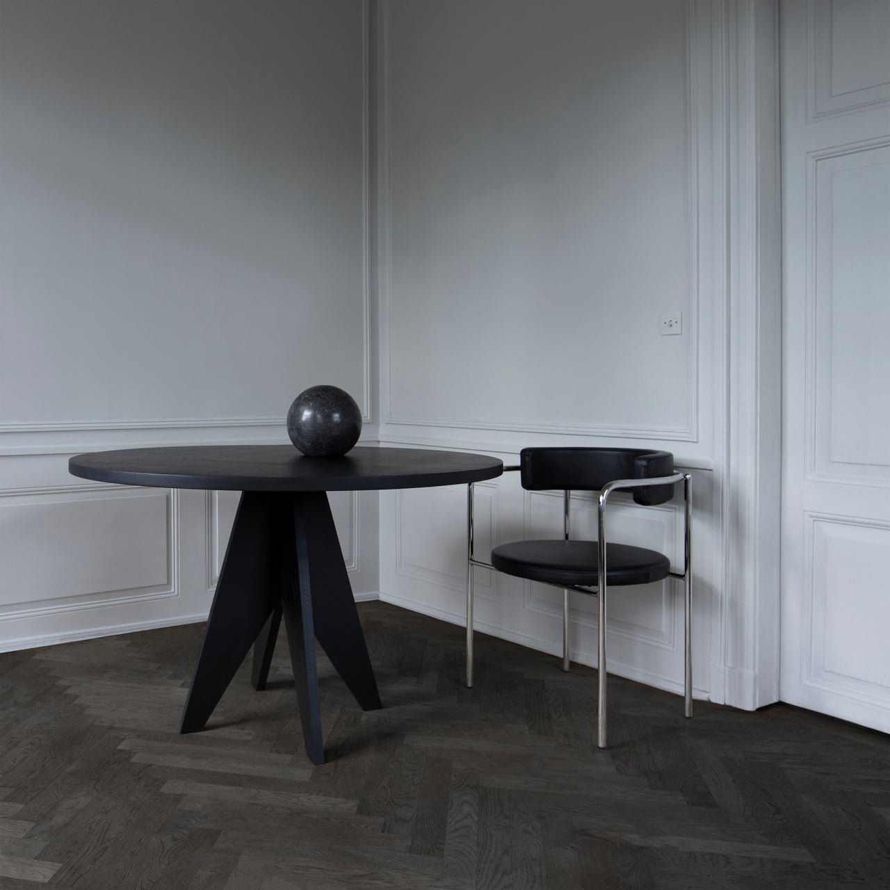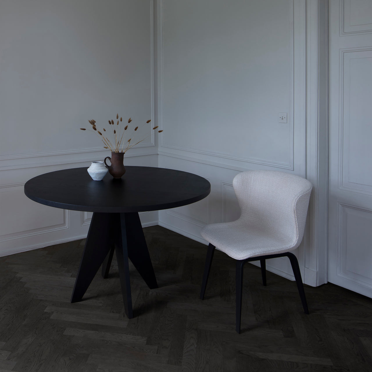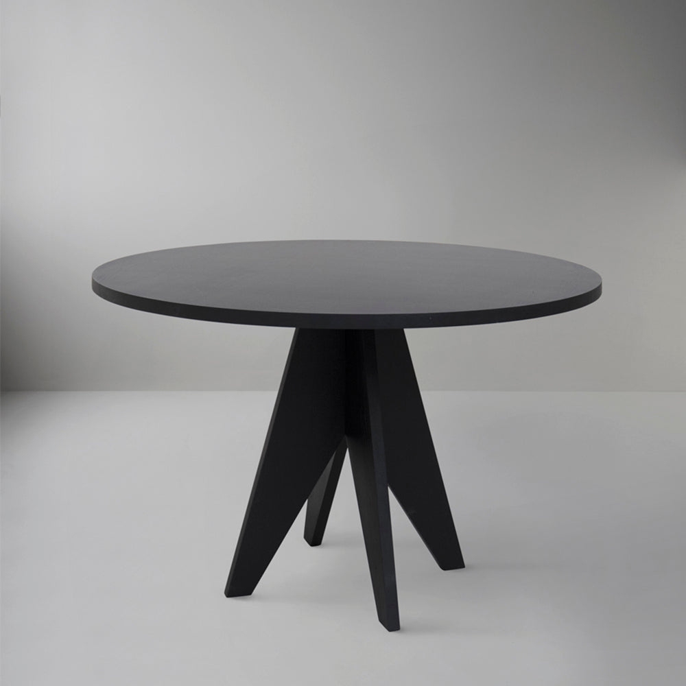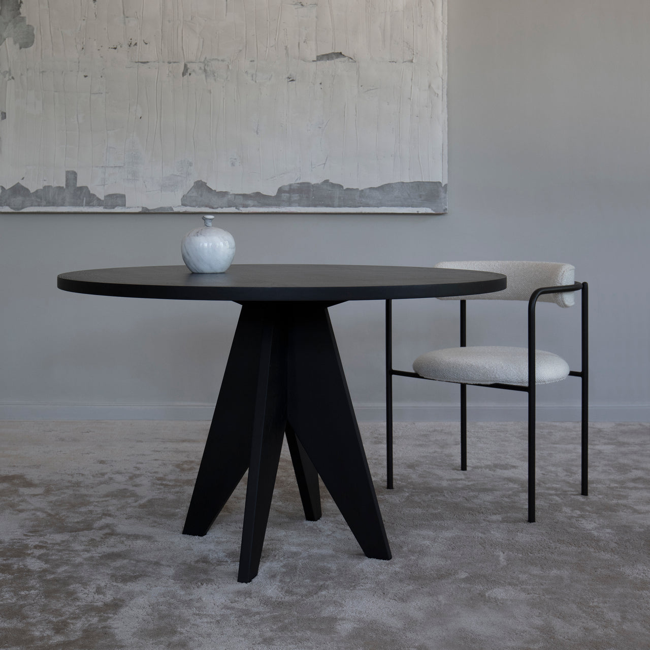 While following in the Scandinavian craft tradition, Pose Round offers a Modernist take as its elegant centered frame supports the tabletop and creates ample open space for sitting. The legs coalesce in a characteristic waist which gives the supports a rounded elegance, standing in contrast to the sturdiness of the solid oak. Available in a choice of 4 sizes and varied finishes.