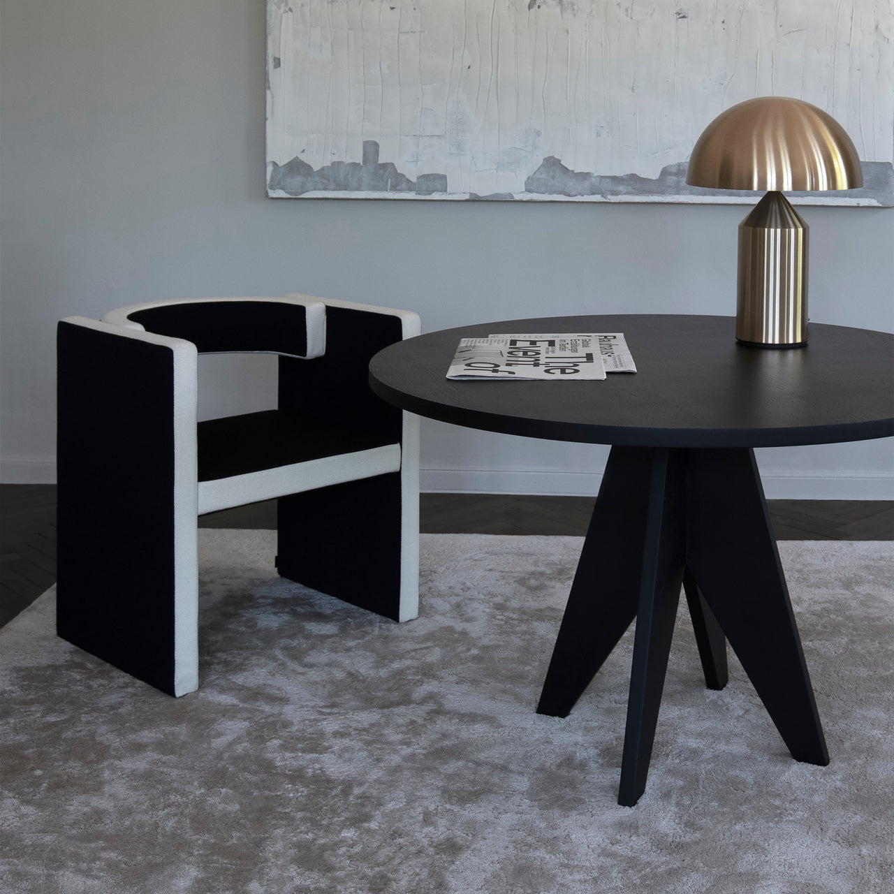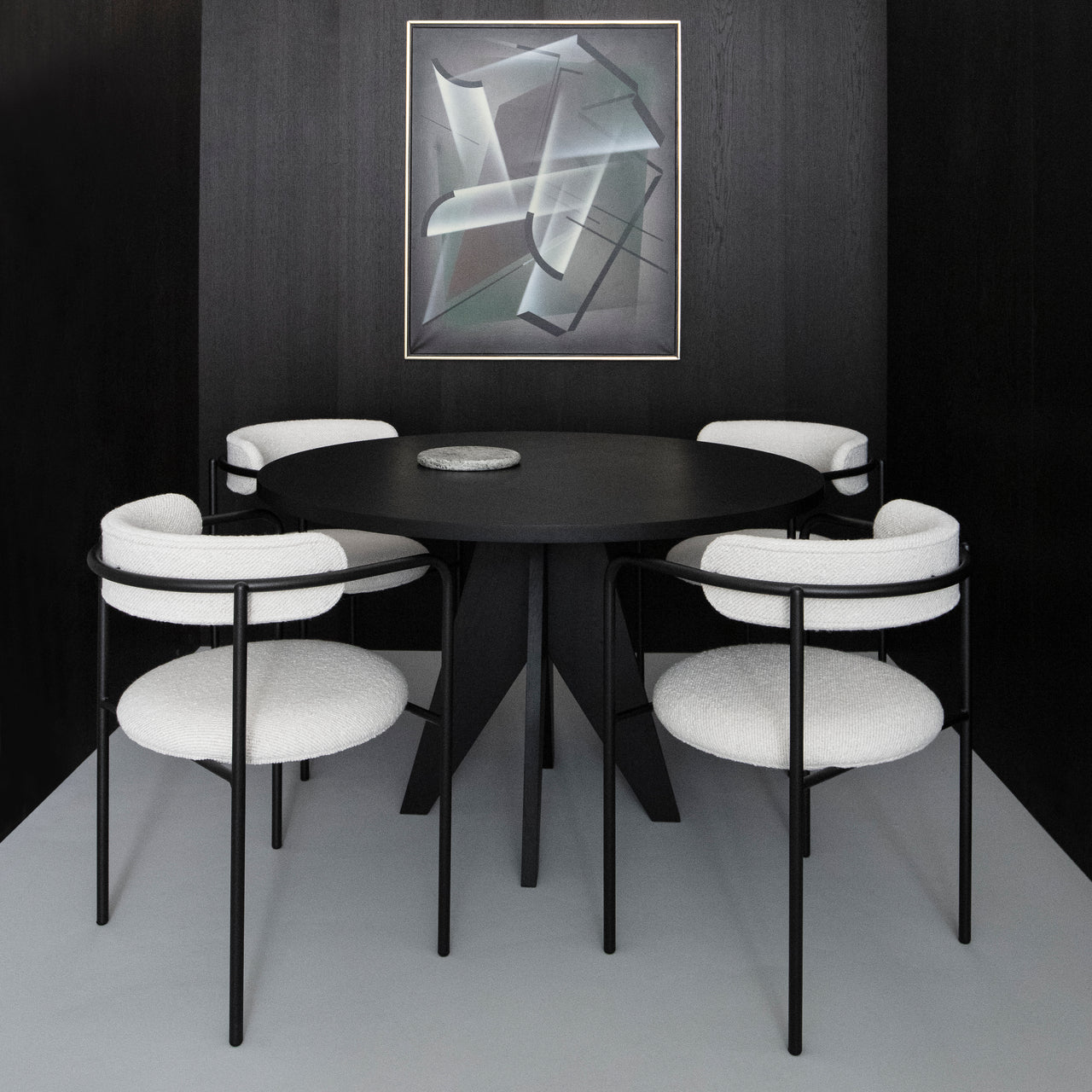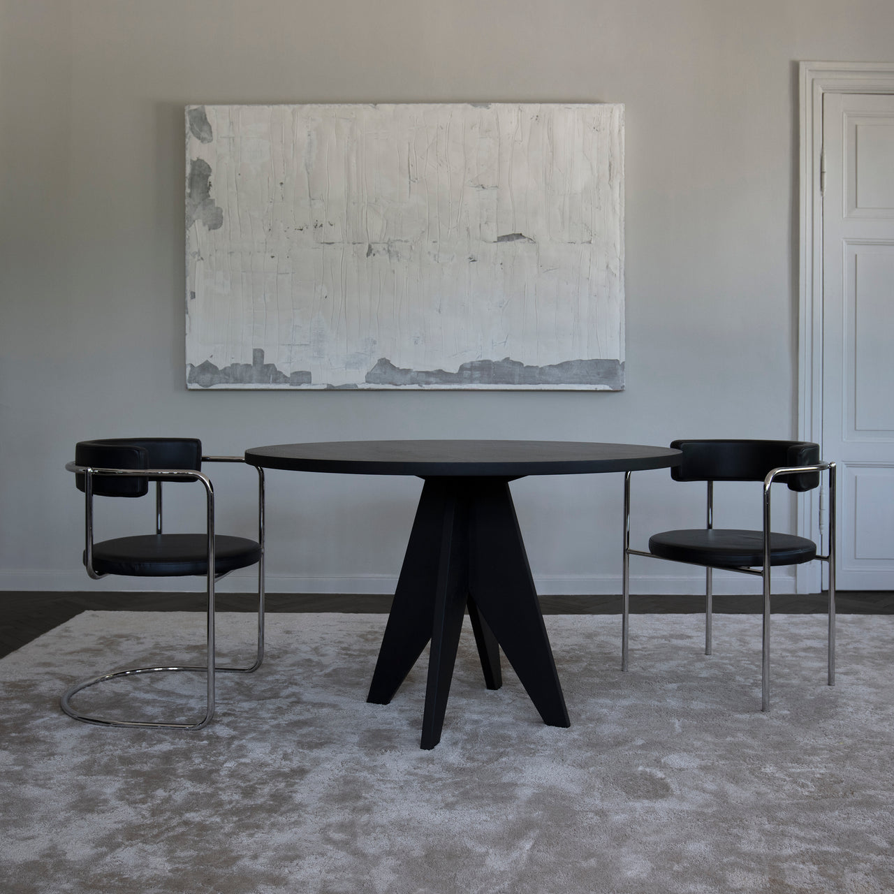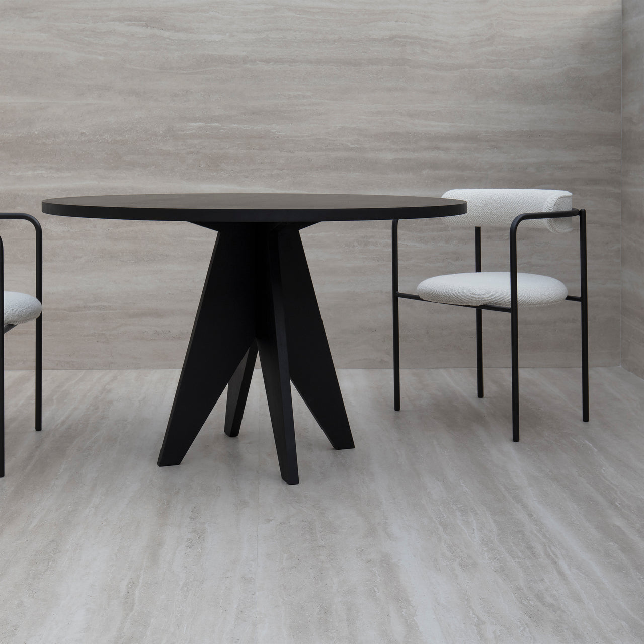 While following in the Scandinavian craft tradition, Pose Round offers a Modernist take as its elegant centered frame supports the tabletop and creates ample open space for sitting. The legs coalesce in a characteristic waist which gives the supports a rounded elegance, standing in contrast to the sturdiness of the solid oak. Available in a choice of 4 sizes and varied finishes.