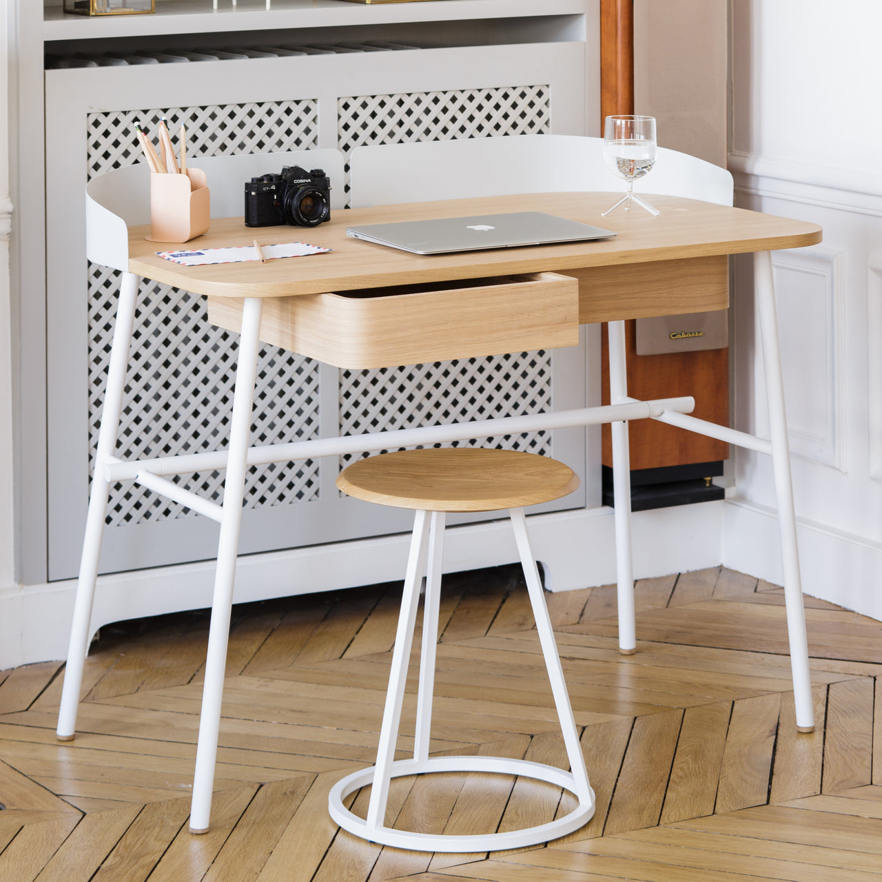 Designed by Pierre-François Dubois for the French brand Hartô, Victor is a stylish desk especially suited to smaller working areas. Structured with a matte-finish painted metal frame, it has a roomy oak-veneered desktop and 2 large drawers for stashing papers and work necessities. A matching metal divider at the back provides a colorful accent as well as keeping pens and other small items from falling on the floor.