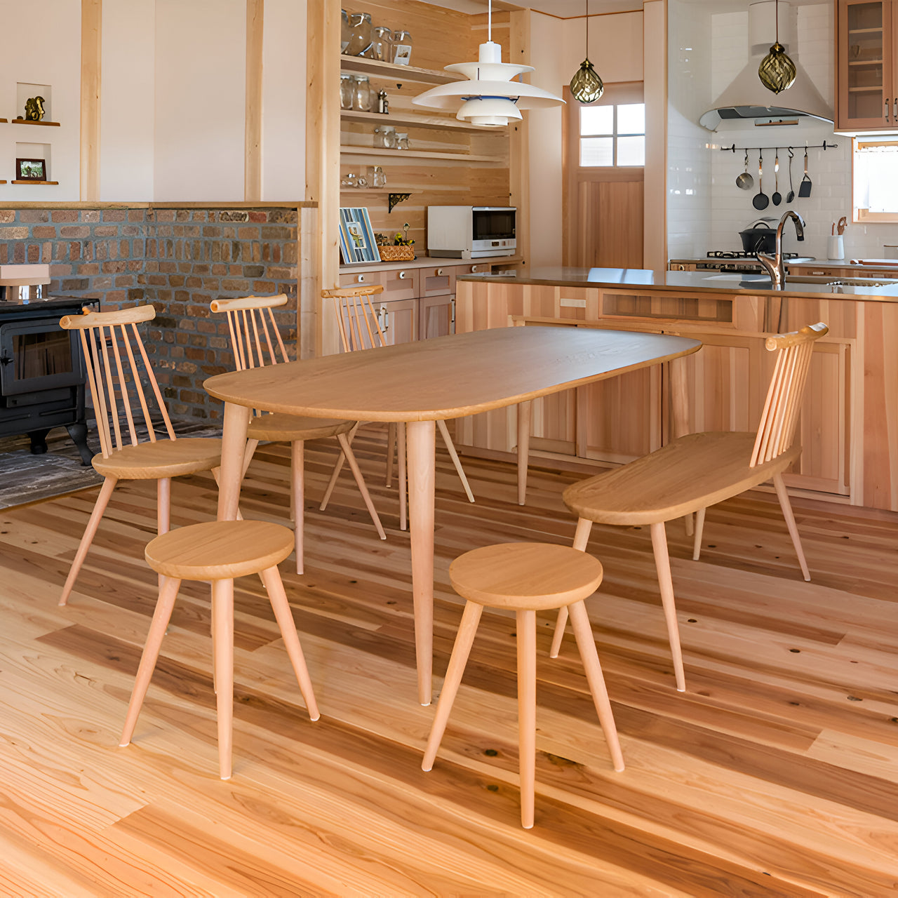 The Kinoe Dining Table features a Japanese chestnut wood tabletop, valued for its distinctive grain and lightweight qualities. Supported by sturdy Japanese beech legs, the table highlights the natural character of the wood. Available in 2 sizes, it suits a variety of spaces, offering practicality and showcasing the beauty of its materials.