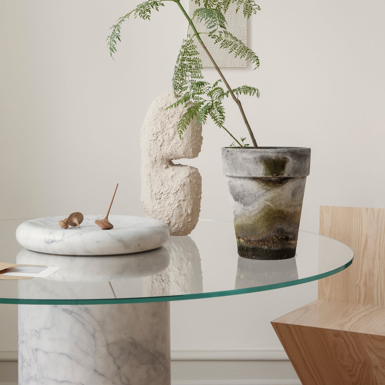 A visual illusion intriguingly tempers the effect of Castore, a monumental glass and marble dining table from Italian architect, sculptor and designer Angelo Mangiarotti. The transparent round top rests on a massive pillar and it seems only a small marble bowl is holding it in place—its rounded contours adding a welcome sensual note.