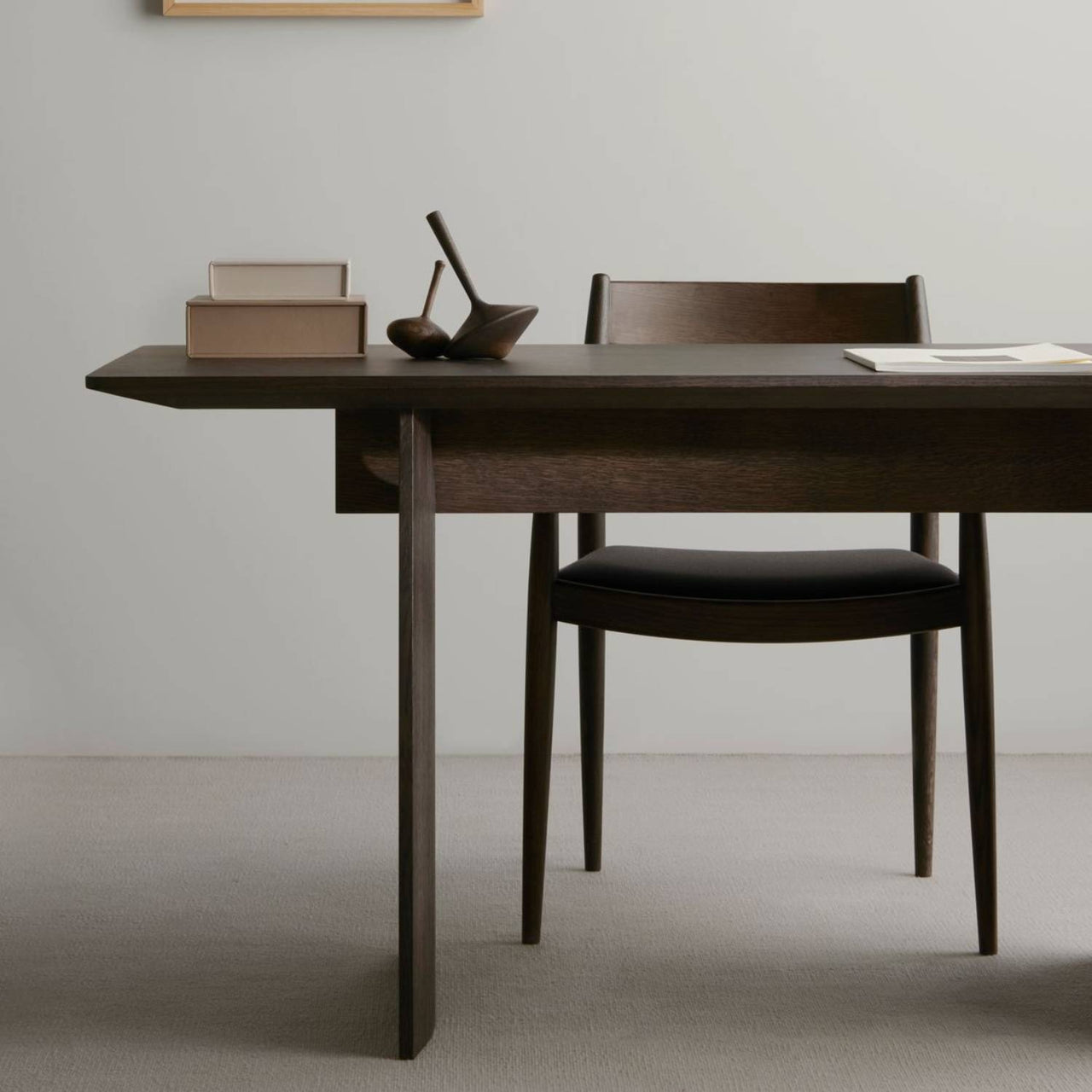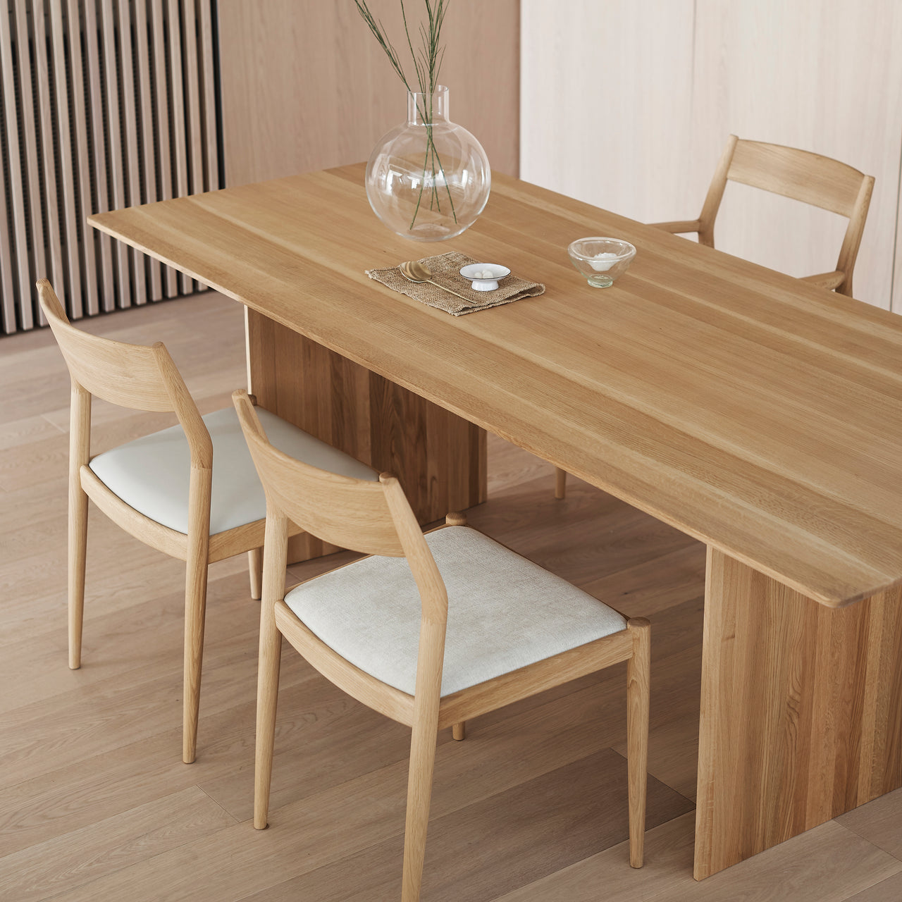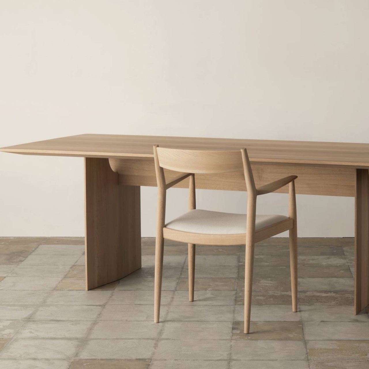 Kinuta N-DT01 plays with notions of sheer mass and negative space when viewed from different angles. Dead-on, the broad solid-oak planking suggests a Constructivist influence while from the side those same supports appear ultra-thin. Collaborating with Karimoku, Norm Architects’ take on multidimensional design gains further leverage from the dining table’s flawless finishing.