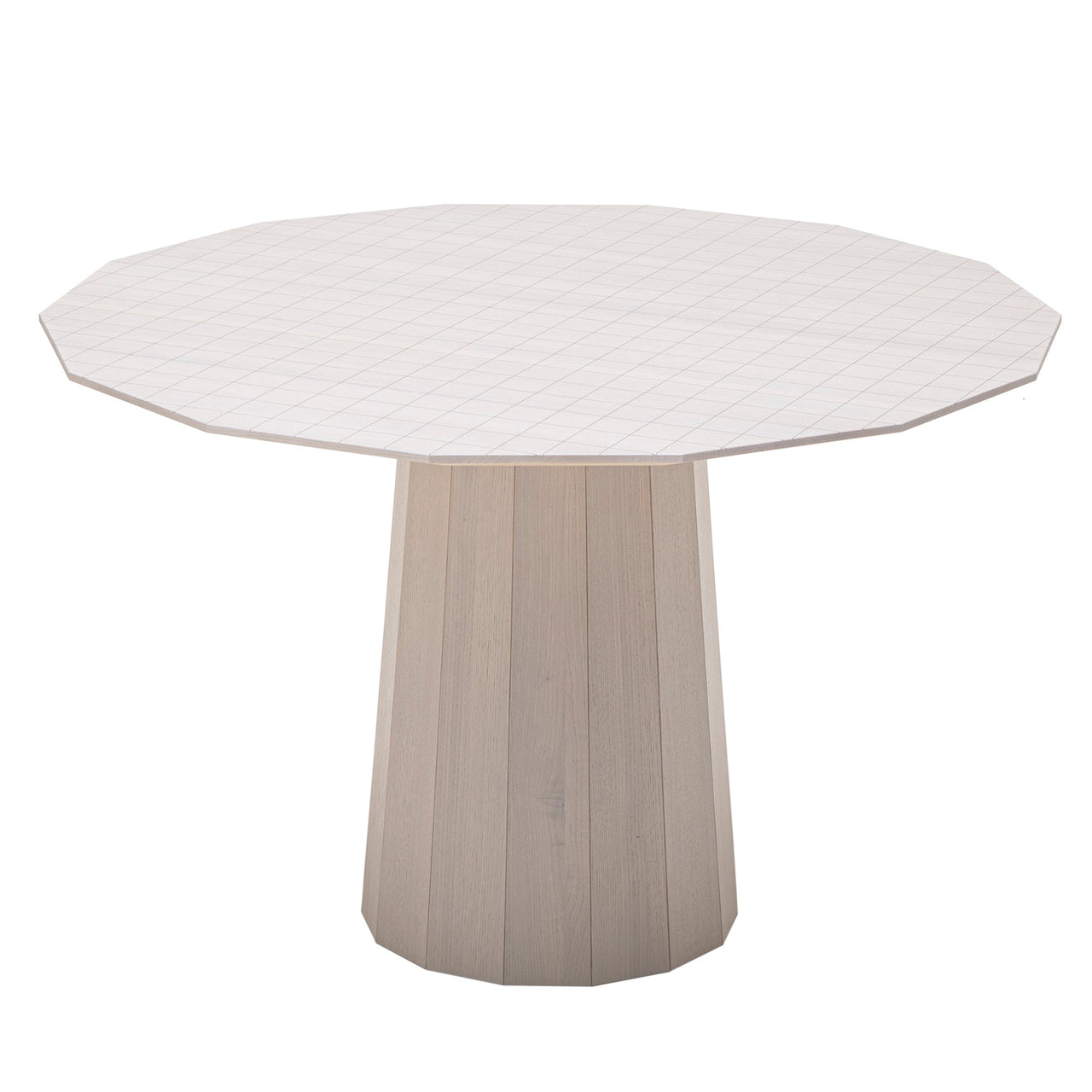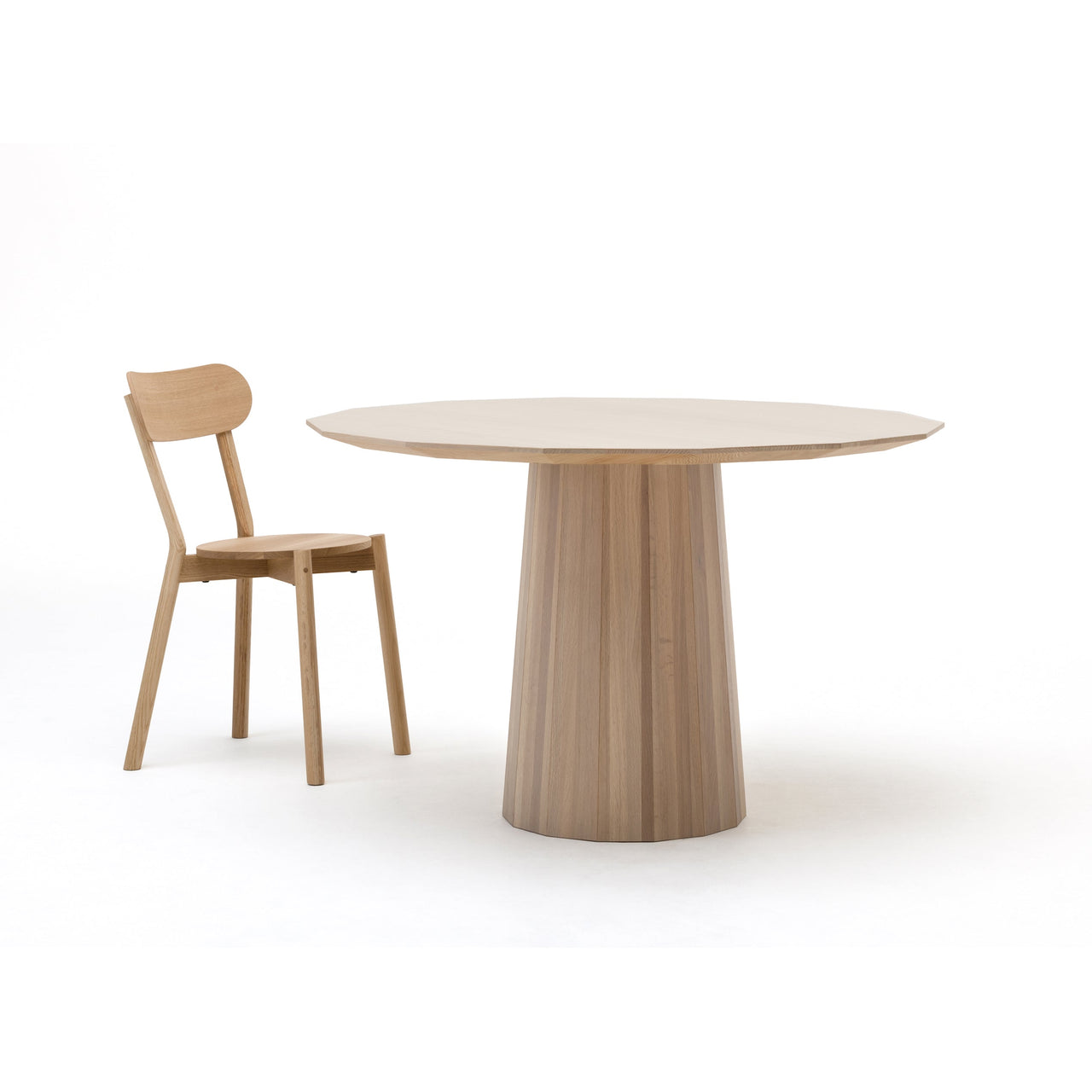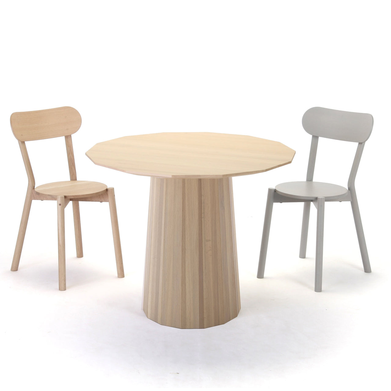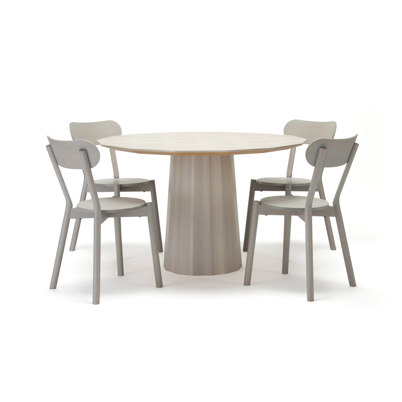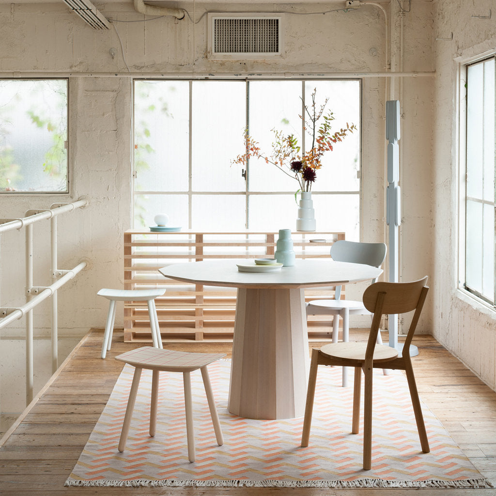 Dine in on this! The Colour Wood Dining Table from Japanese heritage brand Karimoku New Standard expands the multi-hued series from design rock stars Scholten & Baijings. To seat 4-6, this novel 14-sided round table follows similar lines, with the same distinctive barrel-like pedestal made of small-diameter oak wood (long underused and chosen to preserve and revitalize Japanese forests). Two versions illustrate the company's renowned craftsmanship an essential unadorned version in slightly whitened natural wood and a transparent pale grey model with the signature printed dot pattern. Those transparent washes of color and graphic dots infuse traditional craft techniques with contemporary design verve.