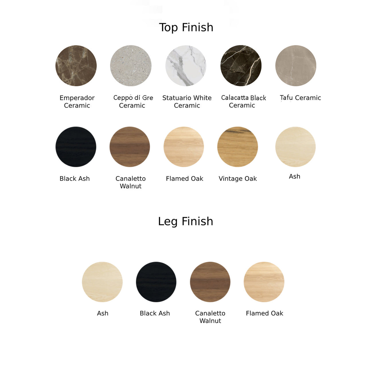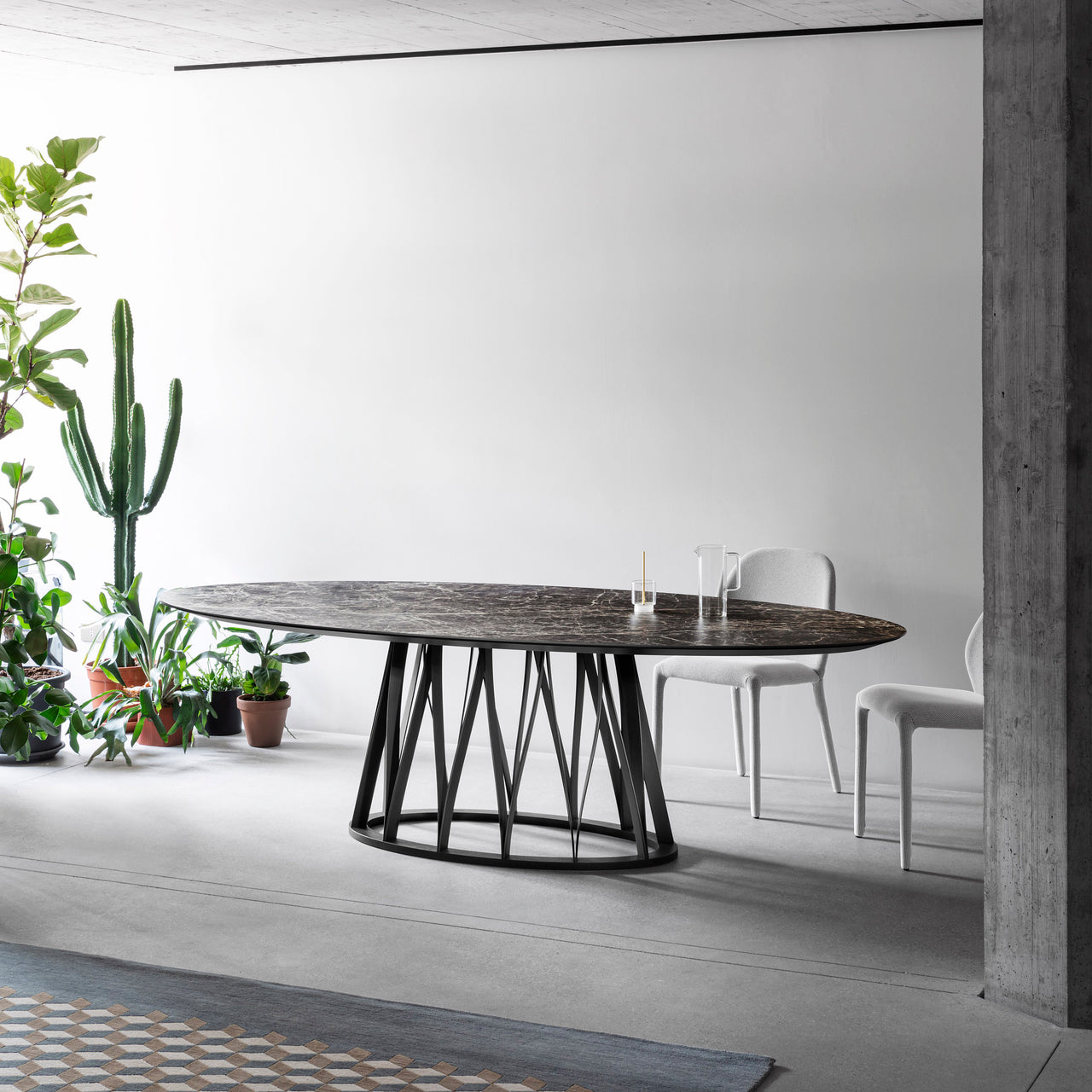 The look of designer Florian Schmidts oval dining table was inspired one day by the accordion folds of his collapsible wood yardstick. Expanding on the notion, Accos solid-wood geometric structure gives the table a solid base but retains an elegantly airy appearance. Available in varied finishes of walnut, oak or ash, its topped with an oval in either wood or several travertine-like ceramic selections. Made in Italy by Miniforms.