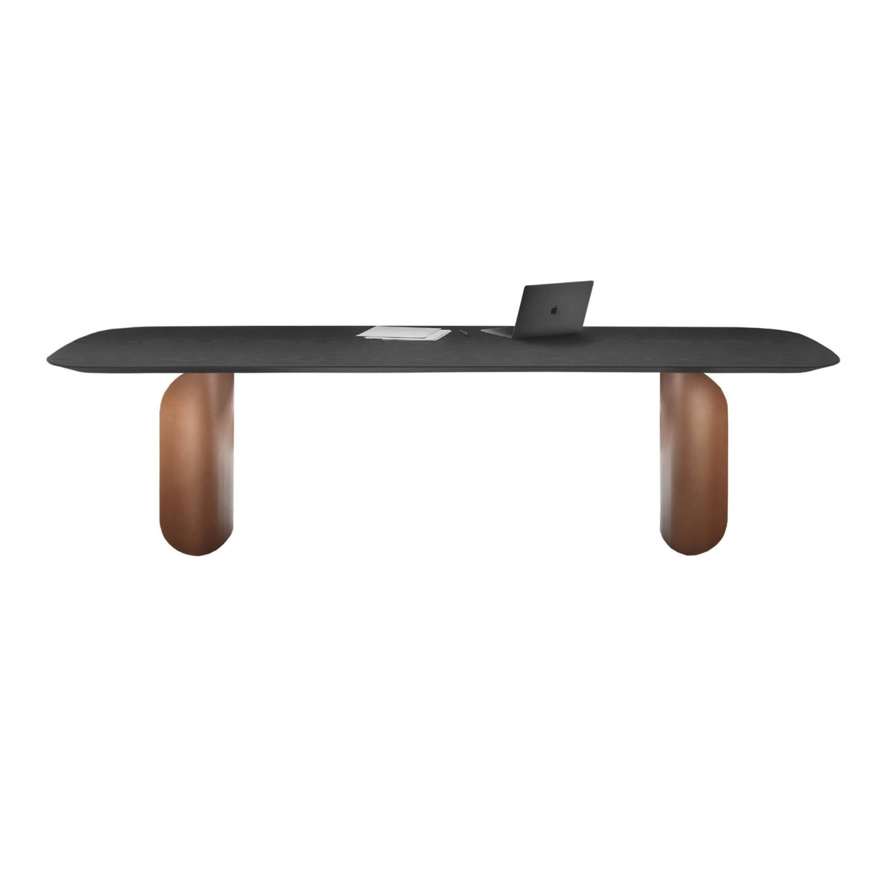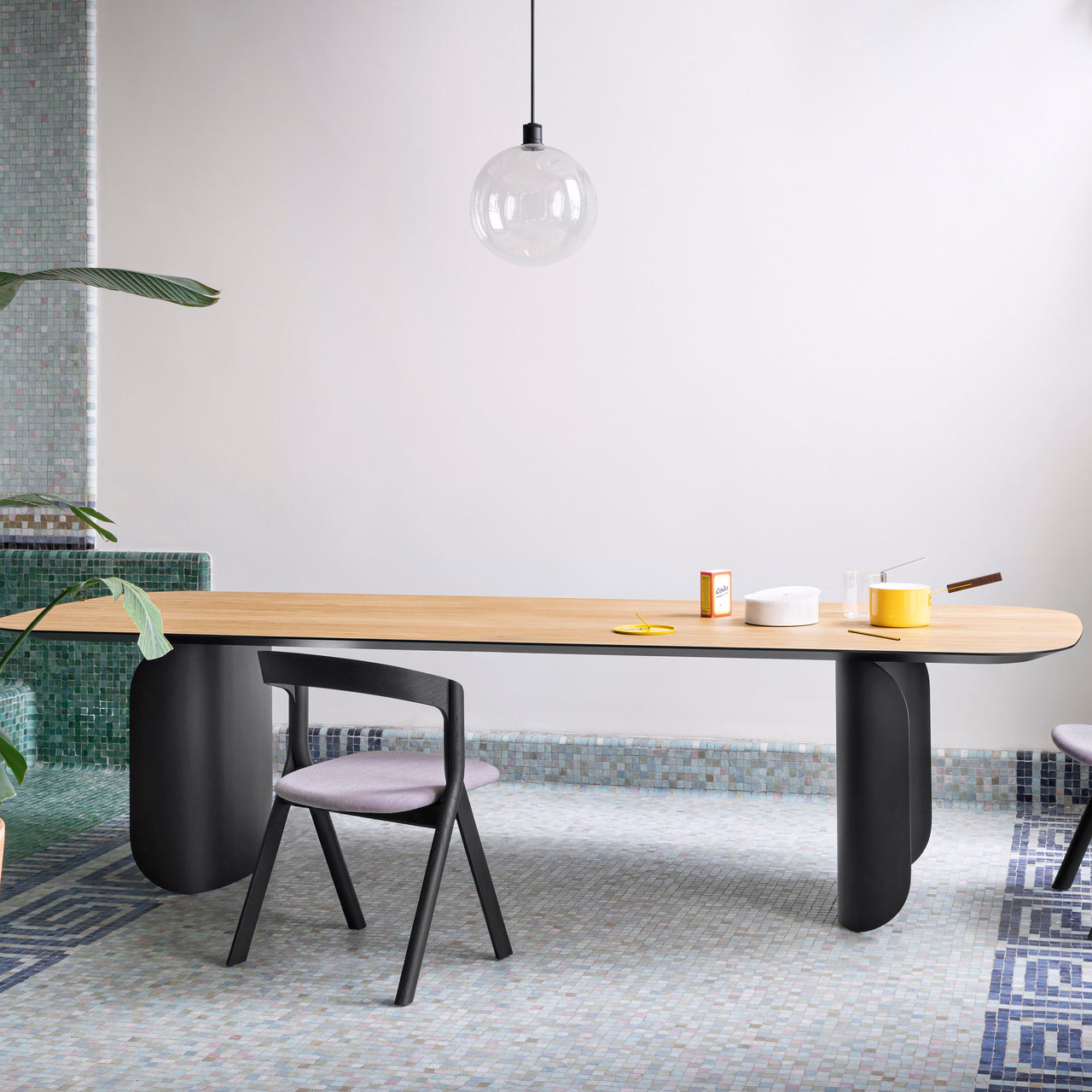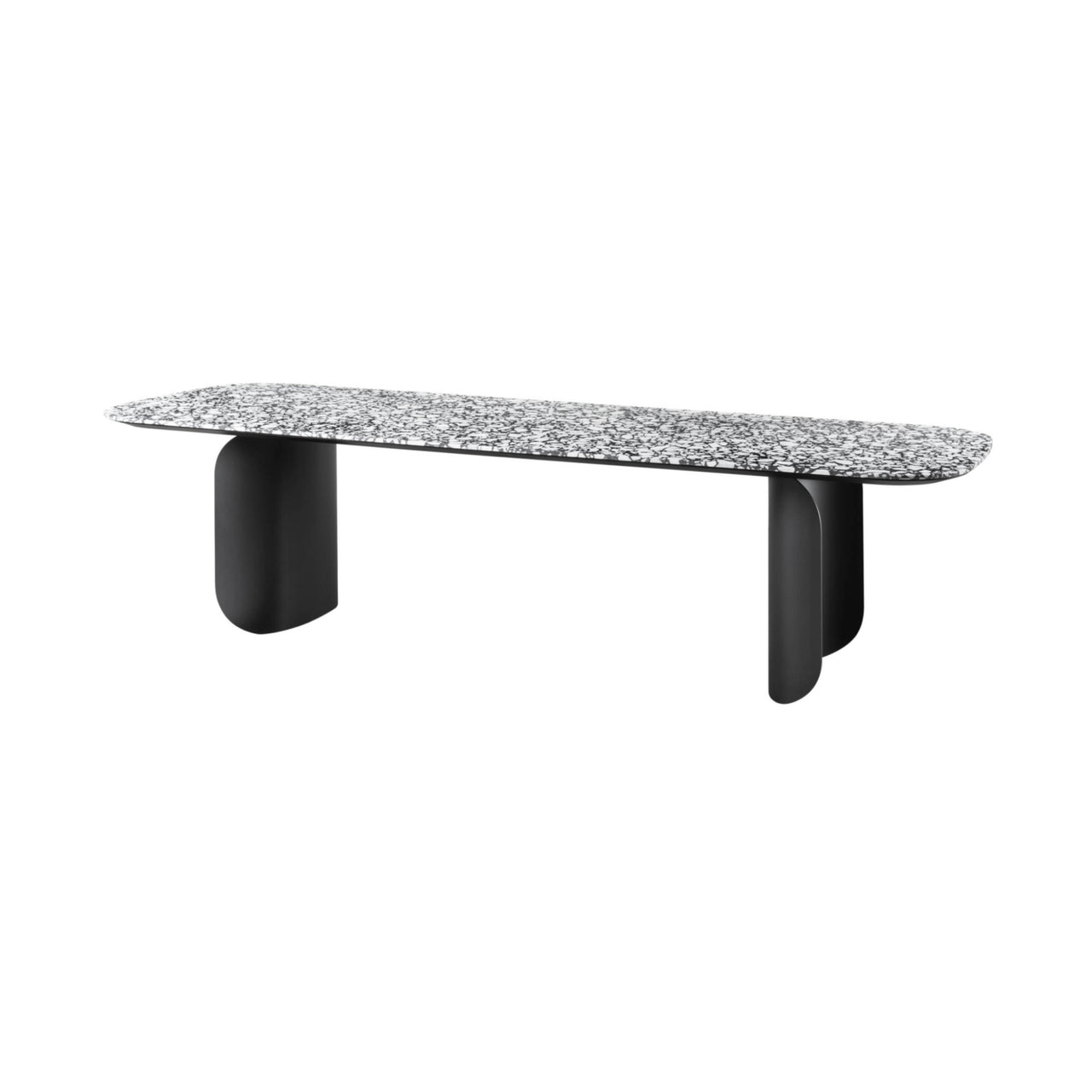 In a medium version to seat up to 6 persons, Miniforms adapts Barry, with its "potato chip" metal legs that curl distinctively around themselves to form a dramatic fillip. Finished in a choice of lacquer or metallic finishes, the dual structure gives an intriguing contrast of proportions when paired with the sliver-like tabletop. With a range of surface choices in rich woodgrain, lacquer finish, a travertine-like ceramic or Palladio marble varieties, the table is a refined standout in either the home or office.