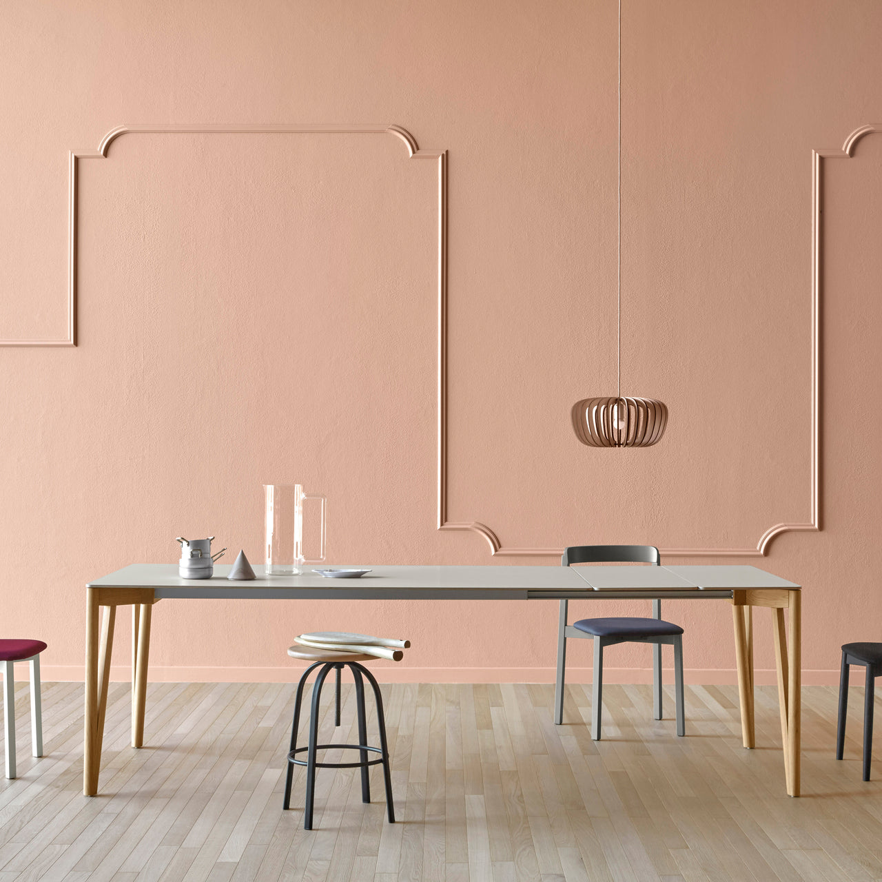 With 2 leaves to expand the table for extra guests, Decapos compact smaller version makes a versatile anchor for limited spaces. Designers Francesco Beghetto and Antonio Manaigo opt for a linear stylishness, with wood legs in a minimalist V-shape. The numerous tabletop options include glass, a travertine-like ceramic and Fenix laminate as well as rich wood varieties in Canaletto walnut, natural oak or black-stained ash. With a range of complementary wood varieties for the base, the table is adaptable to nearly any decor, superbly crafted in Italy by Miniforms.