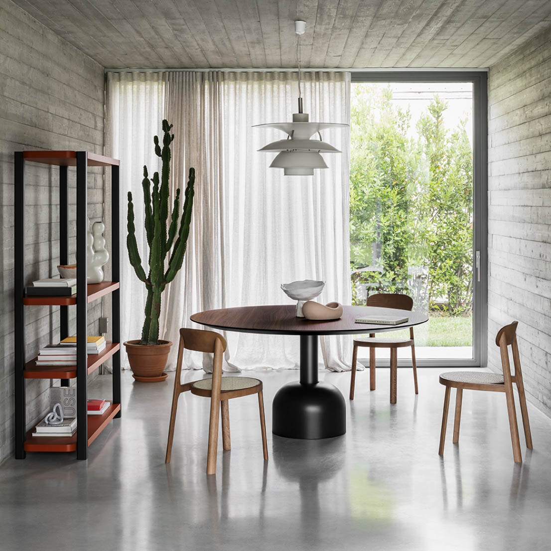 Miniforms' amusingly quirky dining table also adapts to a welcome large-sized version. Slightly resembling a barbell, Illo comes in an appropriately pumped-up range of finishes. Mix and match from Illo's brightly lacquered hues and rich wood grain options for the domed base, center column and tabletop.