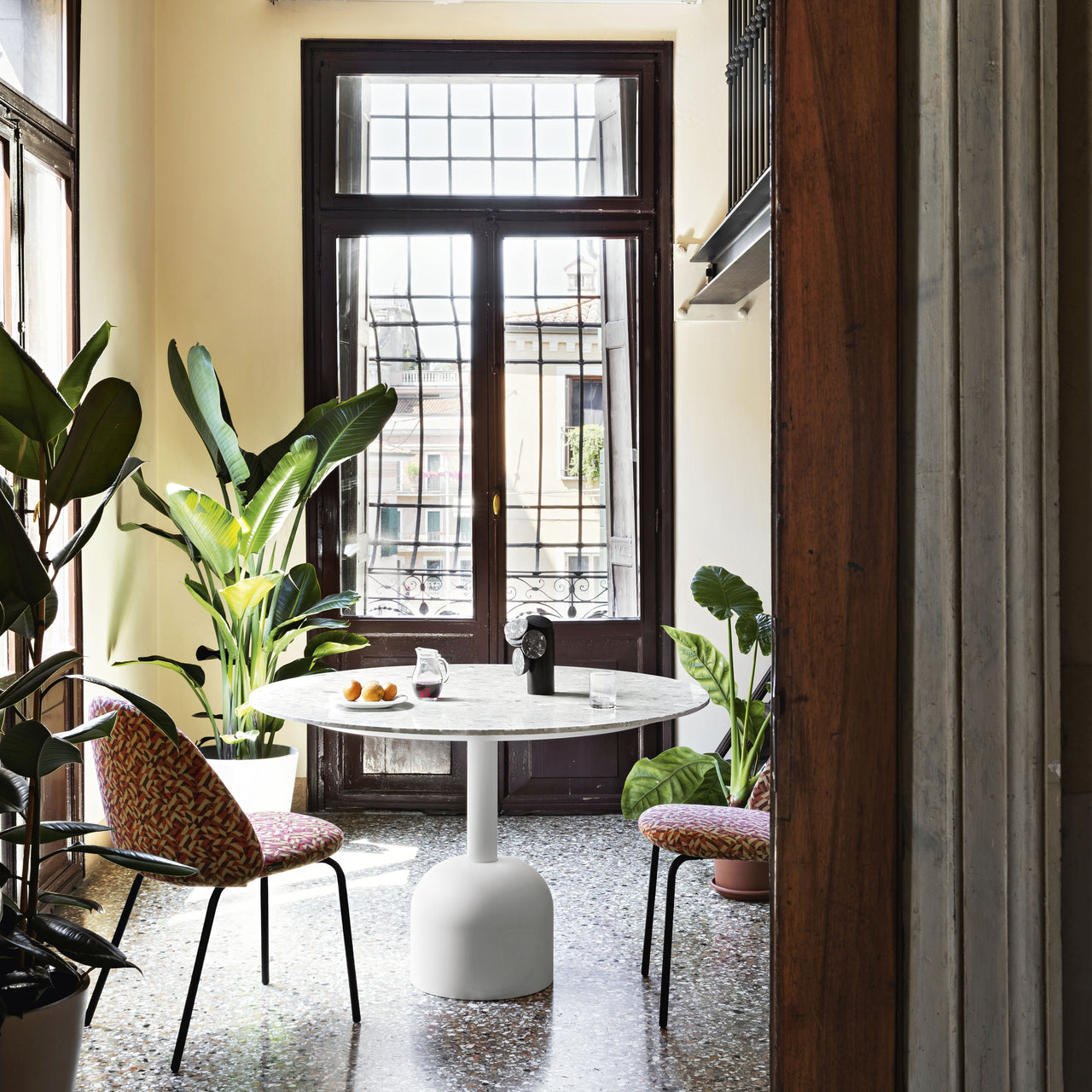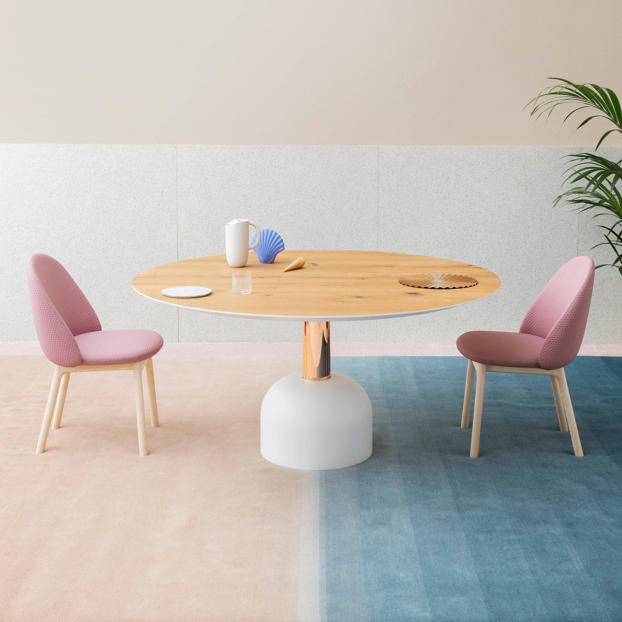 A bistro-size version of Miniforms' colorful Illo is perfect for dinner for 2 or to grace smaller living spaces. The quirky pedestal design with an overemphasized base and gleaming metal column recalls the Italian '80s and its Memphis design era. With Illo's signature mix of available finishes and colors that can be chosen to a heart's content, the round tabletop comes in a choice of smooth lacquer or tactile wood veneer.