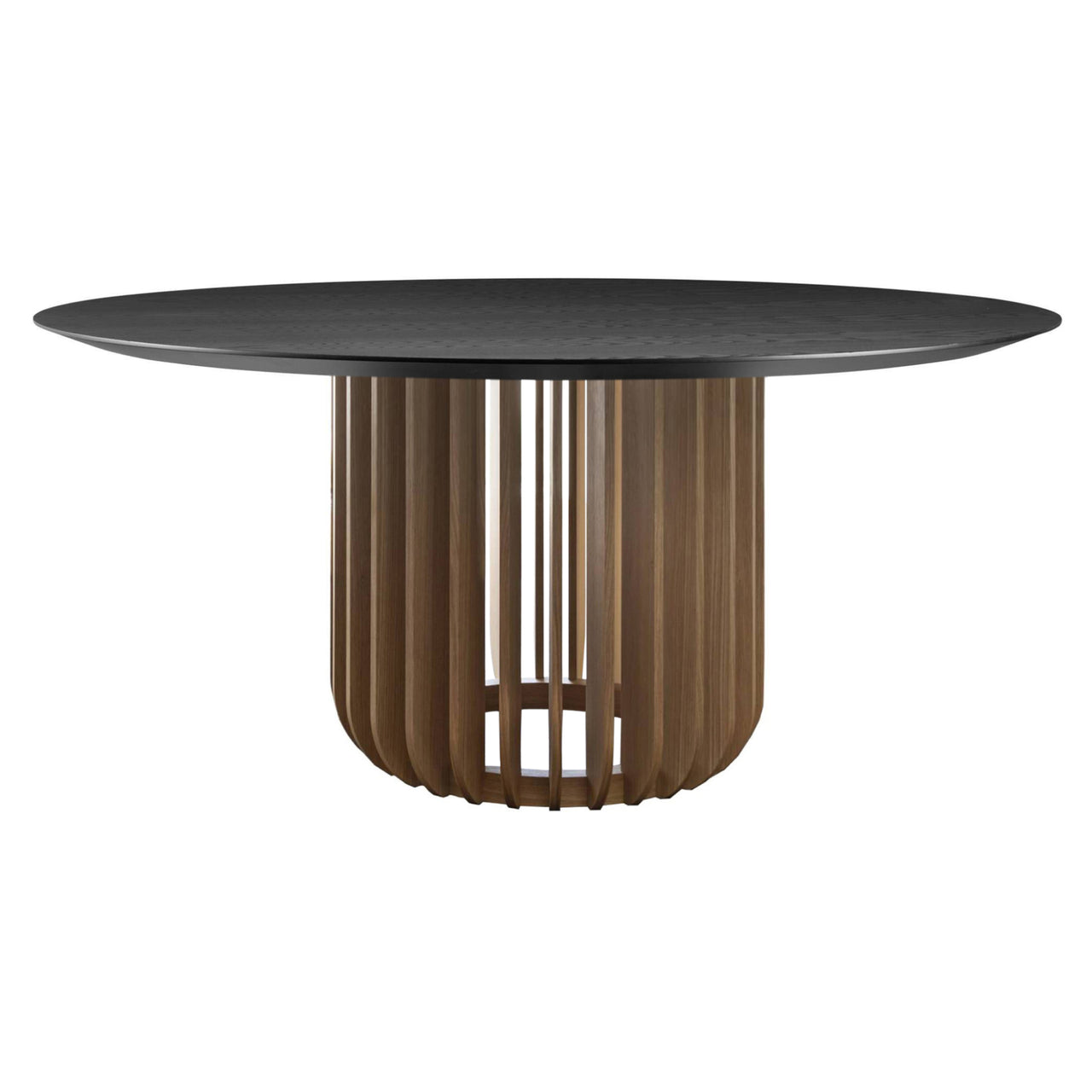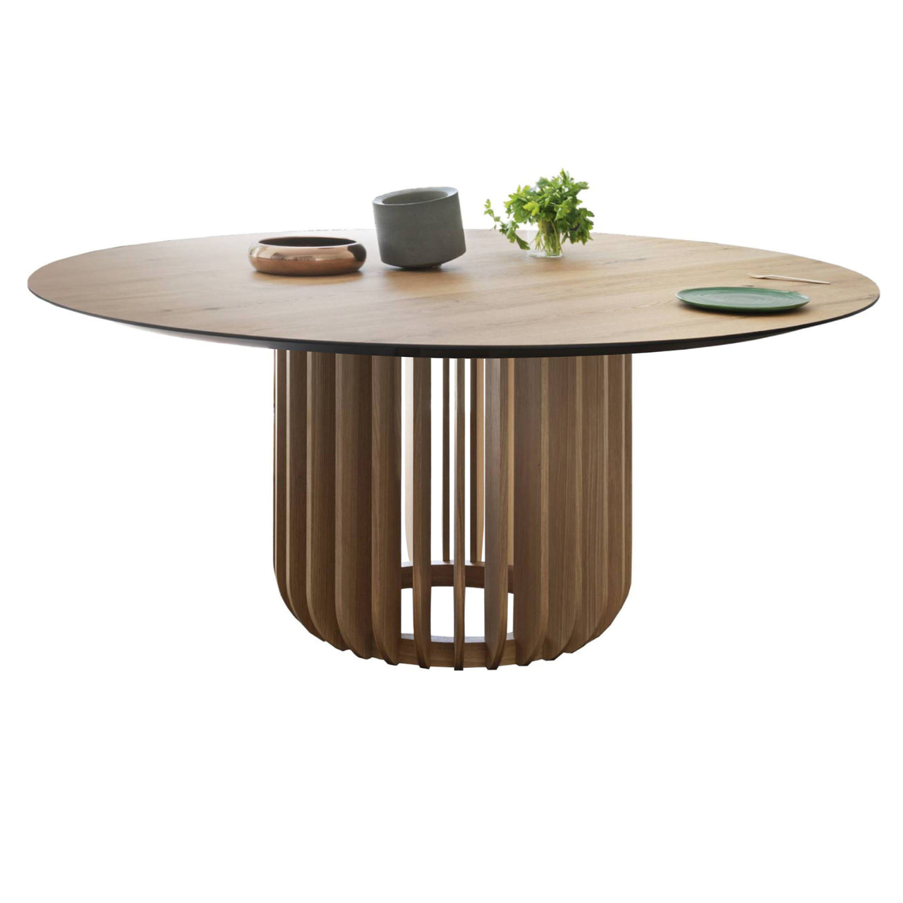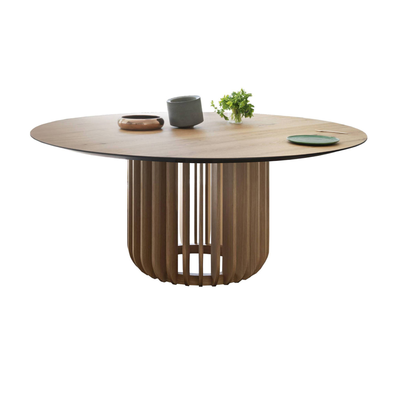 With a circular design said to be suggested by a juicer, this round dining table by E-ggs for Italian maker Miniforms nonetheless projects an atmosphere of appealing calm. Balancing positive and negative space with its encircling slatted wood base gives Juice a lightness that tempers its grand proportions. The impressive round tabletop comes in a selection of solid-wood finishes or a porcelain ceramic in a range of marbleized variations.
