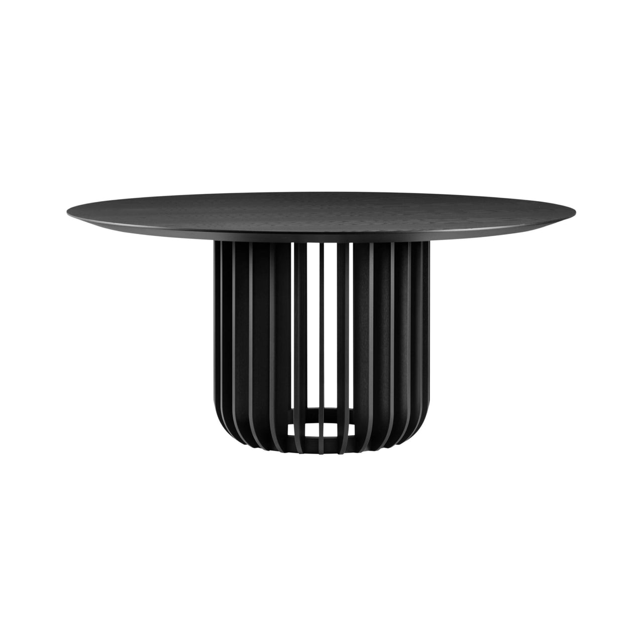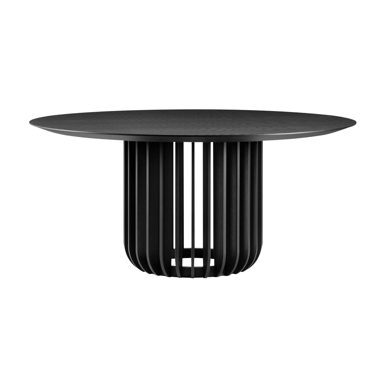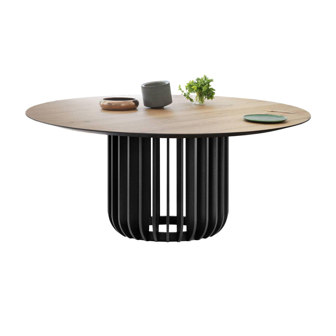 With a circular design said to be suggested by a juicer, this round dining table by E-ggs for Italian maker Miniforms nonetheless projects an atmosphere of appealing calm. Balancing positive and negative space with its encircling slatted wood base gives Juice a lightness that tempers its grand proportions. The impressive round tabletop comes in a selection of solid-wood finishes or a porcelain ceramic in a range of marbleized variations.