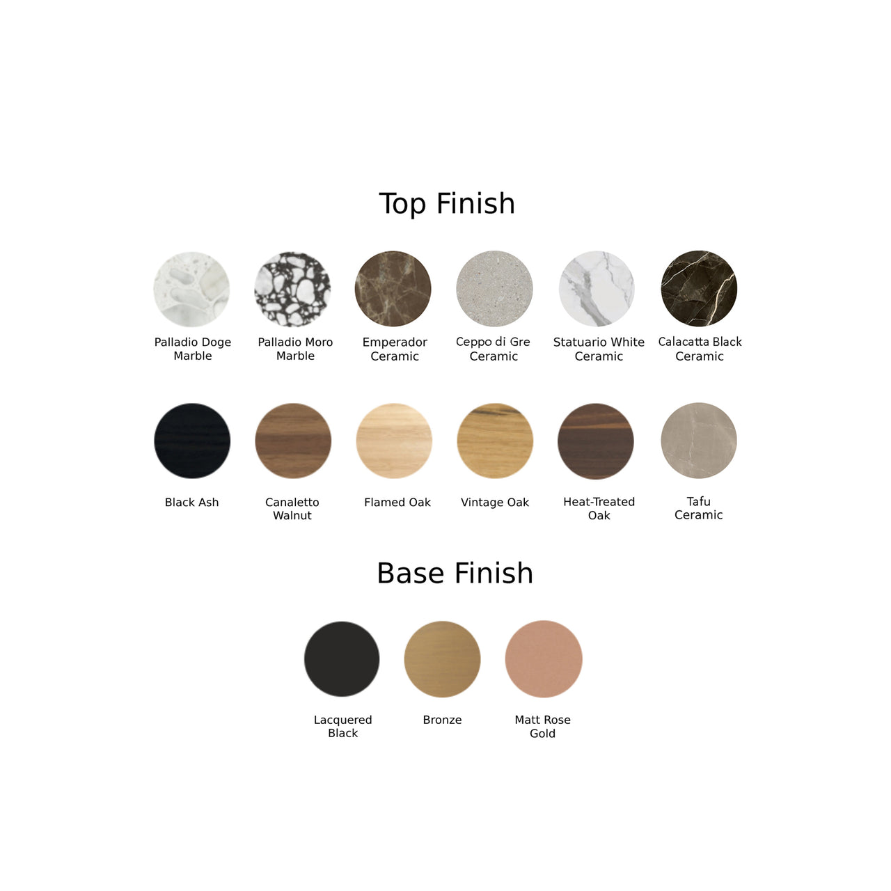 Ash, oak or walnut, lacquered metal, ceramic, marble