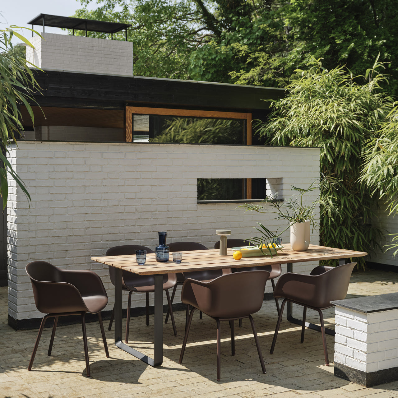 Bringing an elegantly geometric form to varied al fresco settings, 70/70 Table features a sweeping tabletop in sustainable FSC-certified Sapele mahogany, a durable hardwood suitable to the wear and tear of the outdoors. Refined details include slanted plywood edges of the slender table top and edged triangular shapes of its frame. Over time, the wood will lose some of its reddish glow, giving way to a grey-tone patina or treat with wood oil to enhance the wood’s natural color.