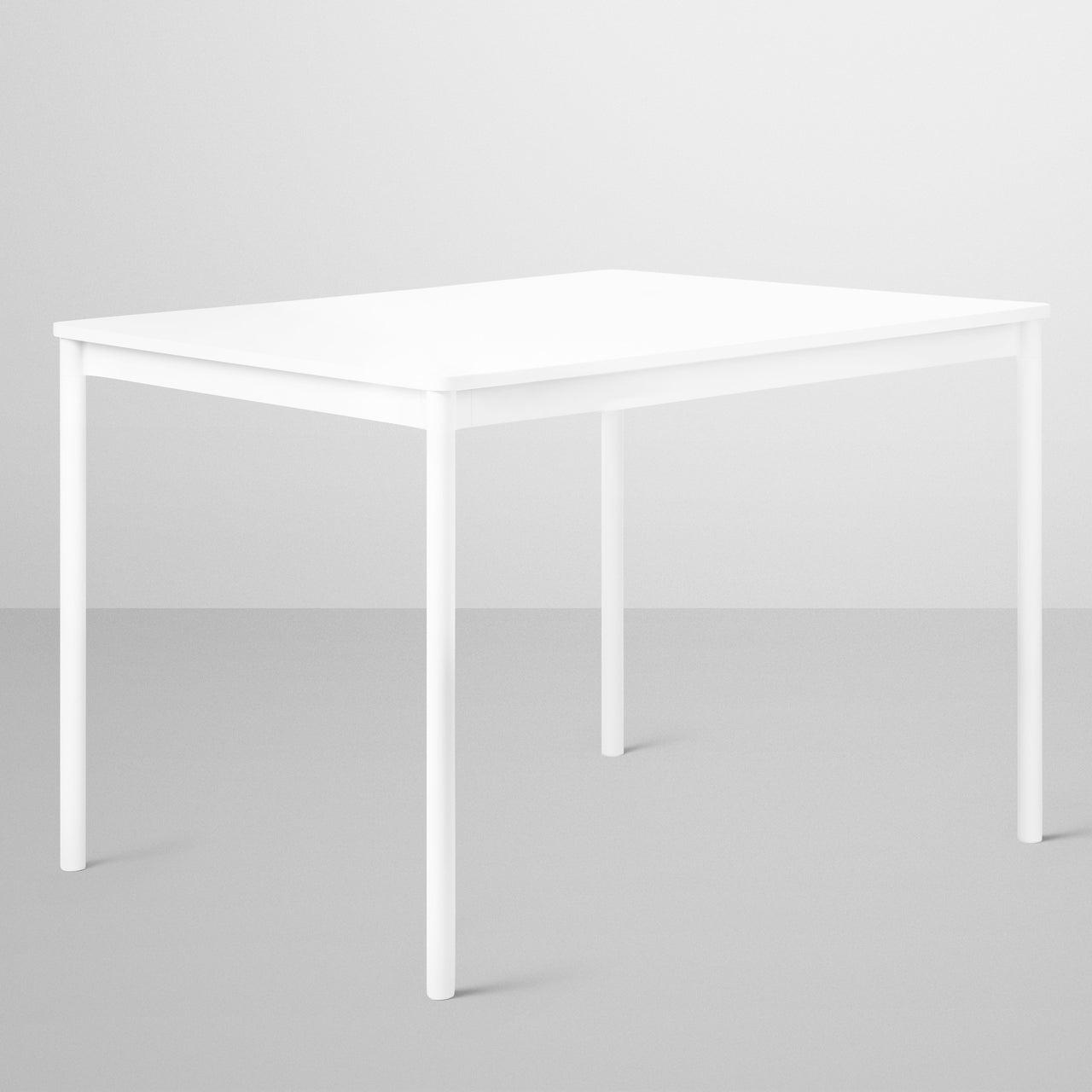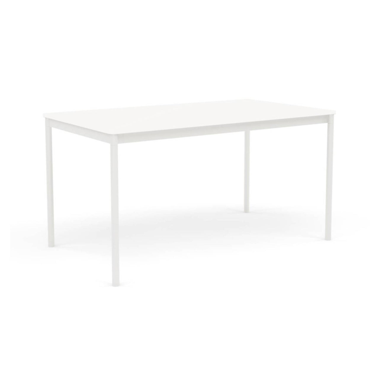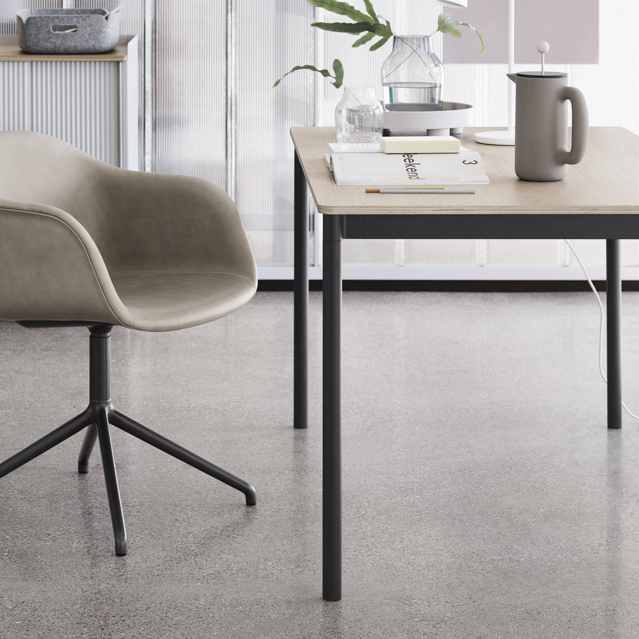 Base more than lives up to its name. In a play on the archetypal table shape, Finnish talent Mika Tolvanen wanted a design with character yet versatile enough for any interior environment. Slim and lightweight, yet able to stand up to high-use areas, the acrylic-painted extruded aluminum frame is achieved through breakthrough technology that increases the metal's structural strength. Matte laminate or black lino tabletop is available with a choice of edge finishing. This smallest of the Base series from Danish house Muuto works practically anywhere, from an office common area to a residential dining room.