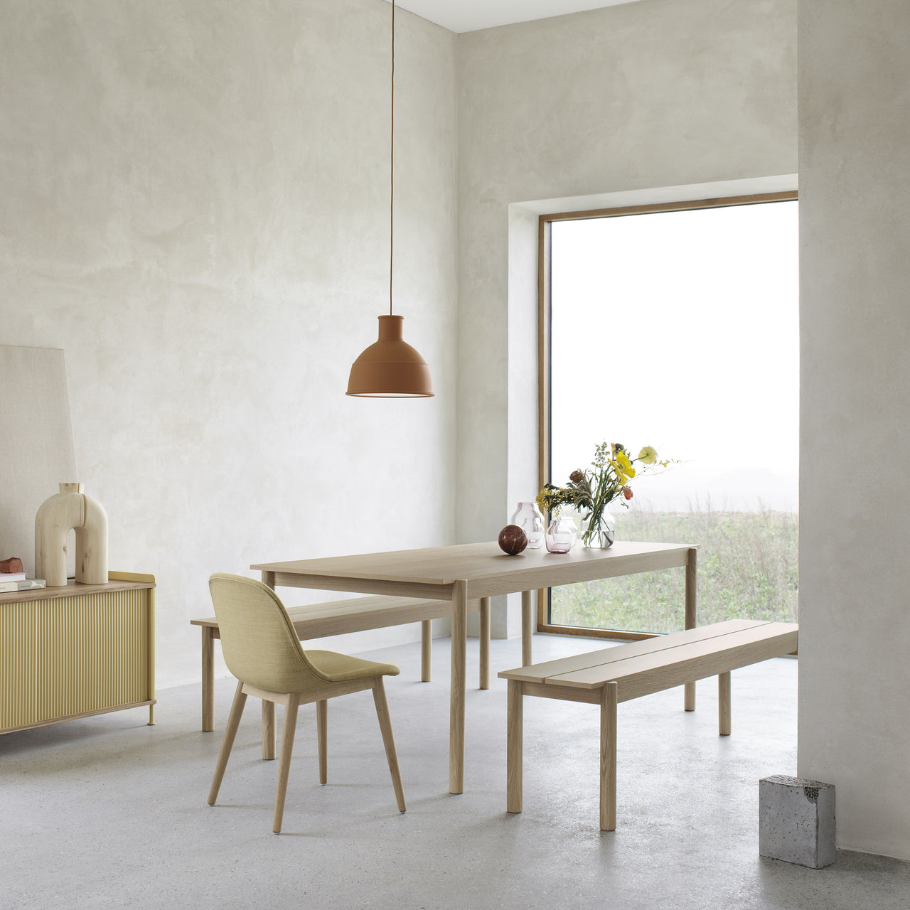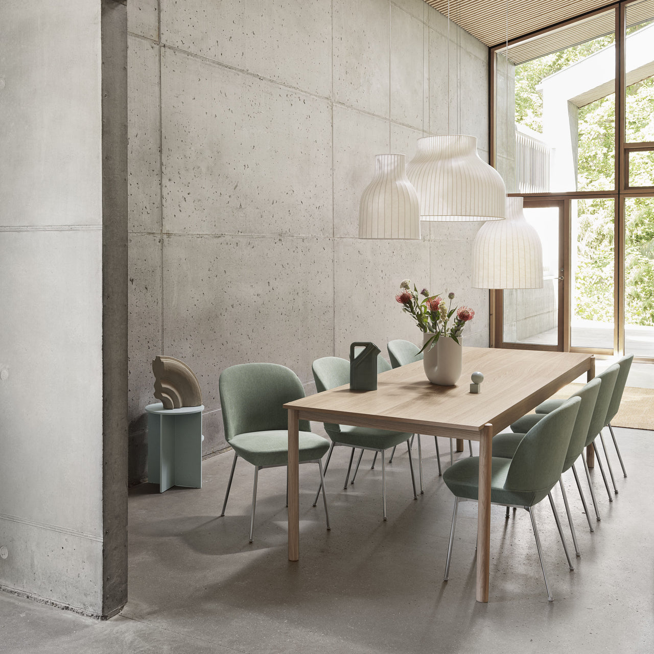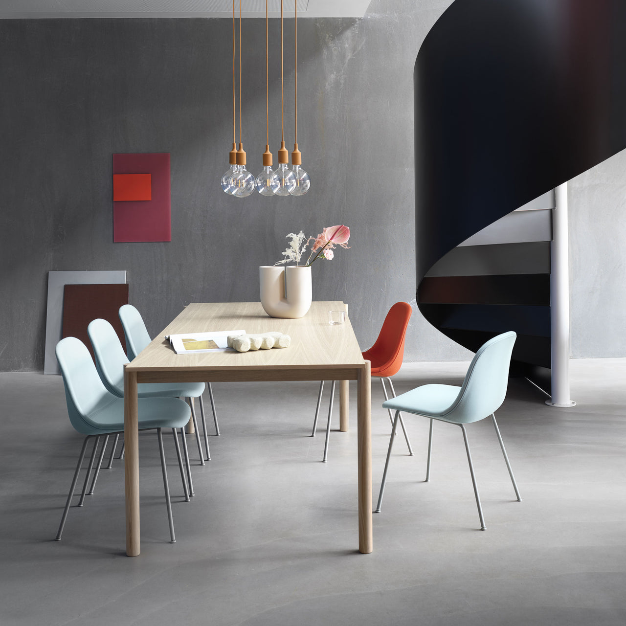Effacing yet design-worthy, Thomas Bentzen’s wooden table anchors a dining area with subtle style. His Copenhagen influence is felt in Linear’s juxtaposition of round table legs with its straight-lined proportions. Fashioned with tabletop in oak veneer and solid oak legs, Muuto’s table readily pairs with its complementary wooden bench or allows for myriad other chair choices.