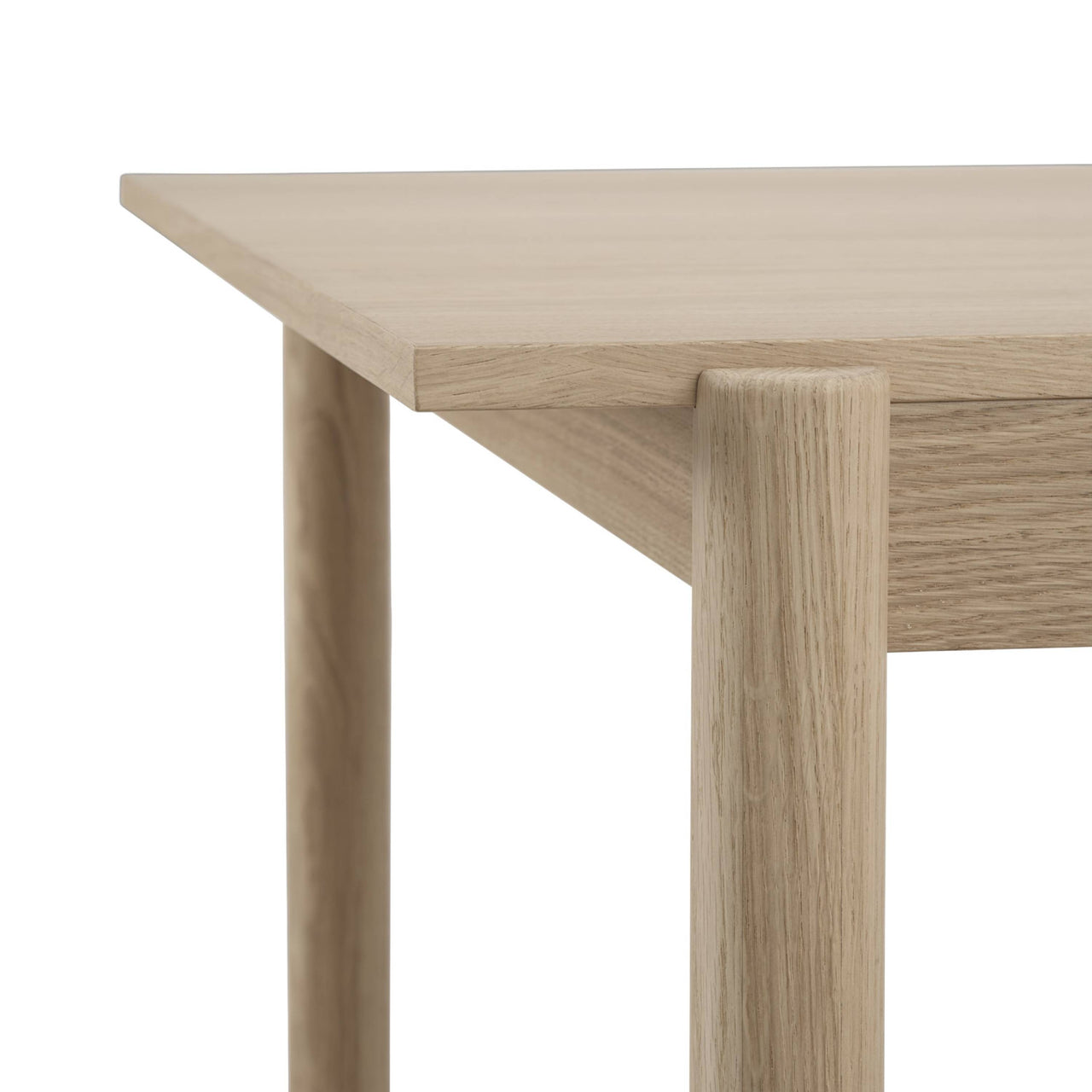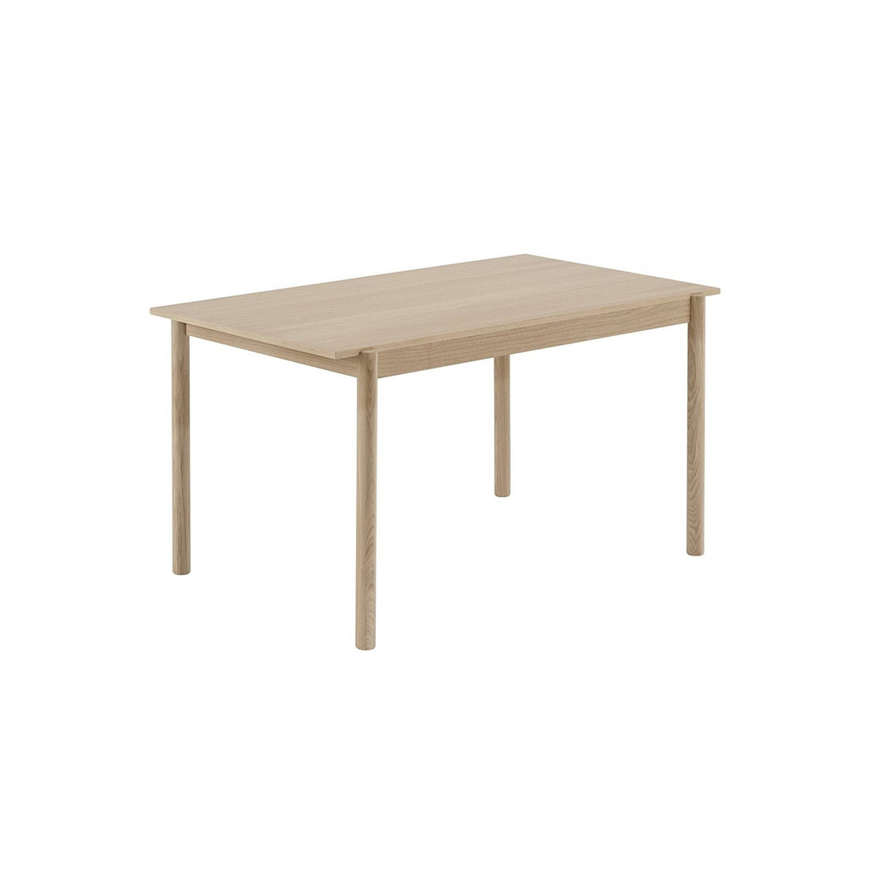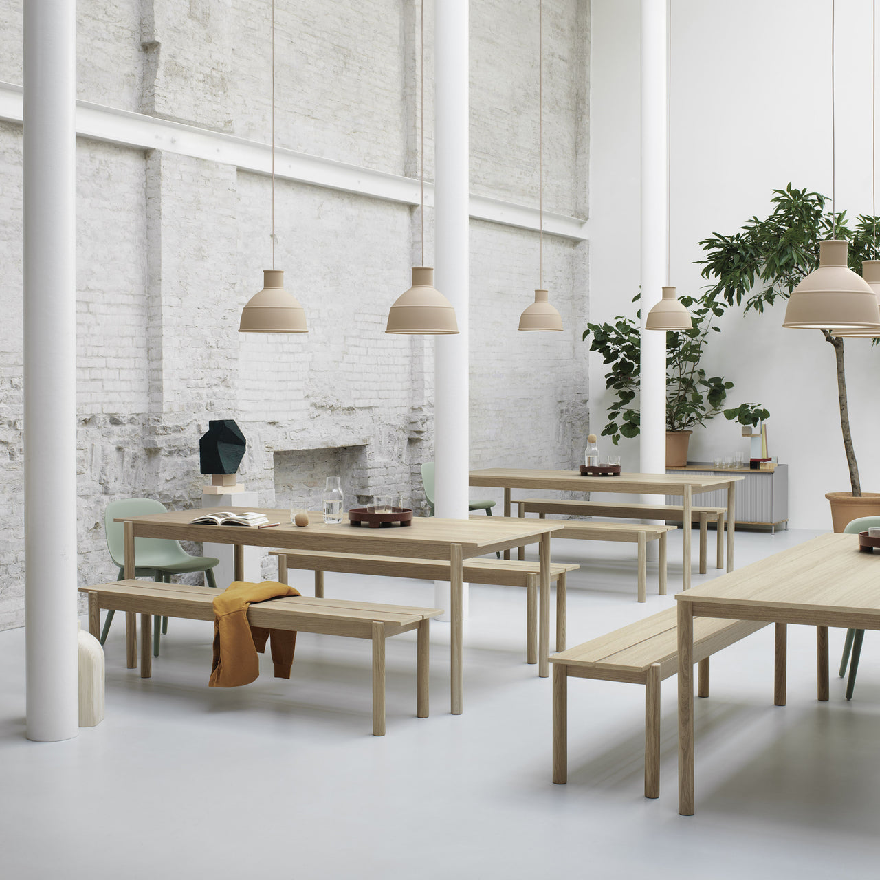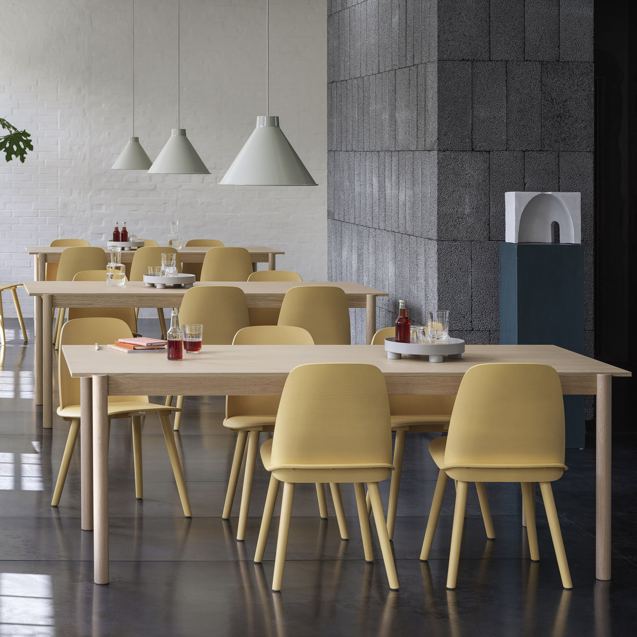 Effacing yet design-worthy, Thomas Bentzen’s wooden table anchors a dining area with subtle style. His Copenhagen influence is felt in Linear’s juxtaposition of round table legs with its straight-lined proportions. Fashioned with tabletop in oak veneer and solid oak legs, Muuto’s table readily pairs with its complementary wooden bench or allows for myriad other chair choices.