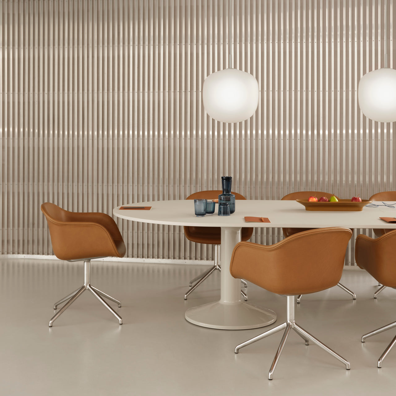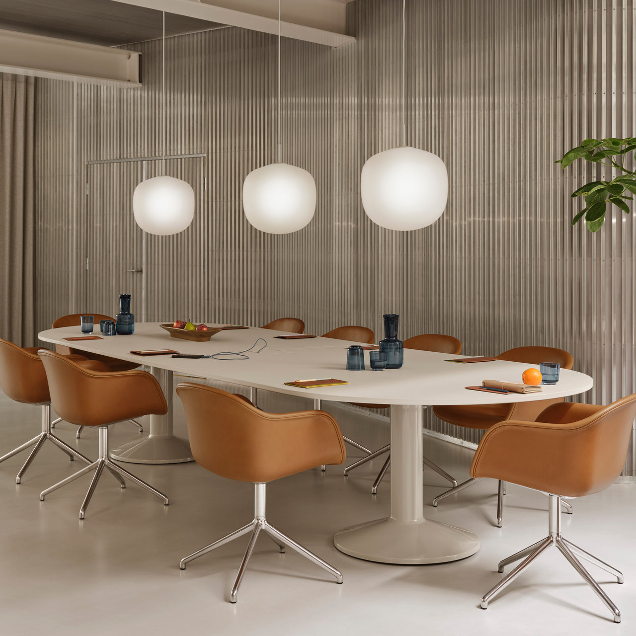 The Midst Conference Table features a broad, durable surface and integrated power options to support collaboration in professional settings. Its tabletop—available in matte linoleum or nanolaminate—resists fingerprints and daily wear, while the sculptural dual-column base in spun steel adds visual structure and stability. Offered in three sizes and monochrome finishes including Black, Dark Red, and Grey, the table adapts to a range of spatial needs. Optional power cut-outs allow for seamless integration of connectivity units, keeping devices charged and work uninterrupted.