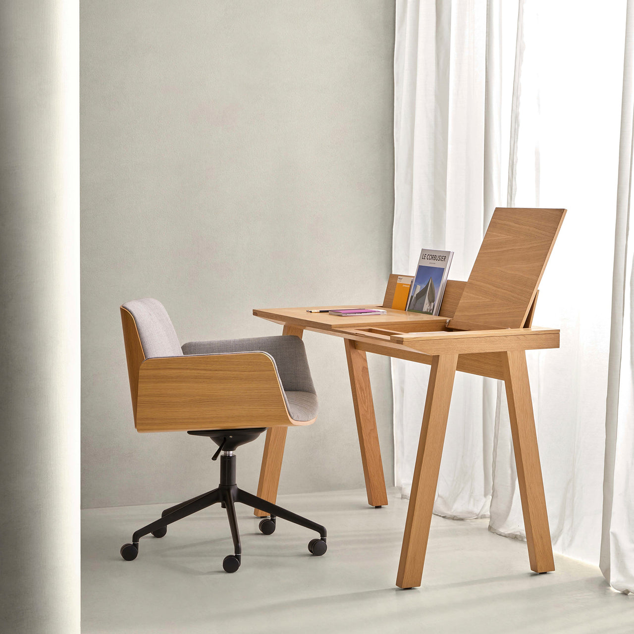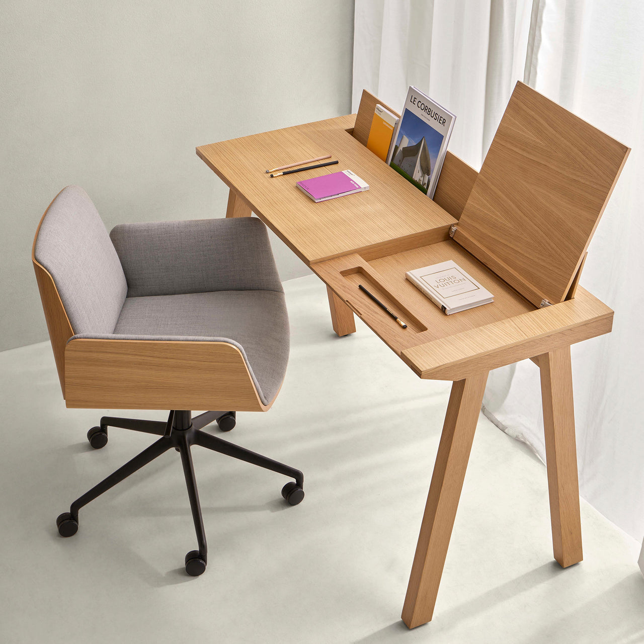 Along with its trim dimensions and airy inviting style, Ernest is a marvel of organization, with a desktop lid revealing a hidden stash for stationery, work tools and keepsakes as well as a backstop for standing up a journal or tablet. Borja Garcia’s design for Punt comes in a range of oak and walnut finishes and a nook underneath and slots allotted in the back legs also keep cords neatly controlled.