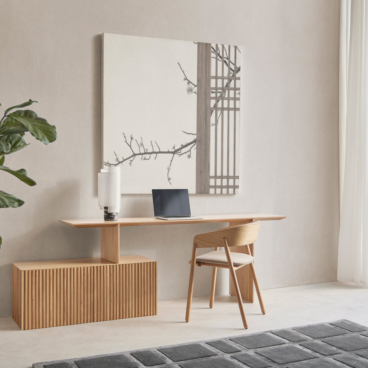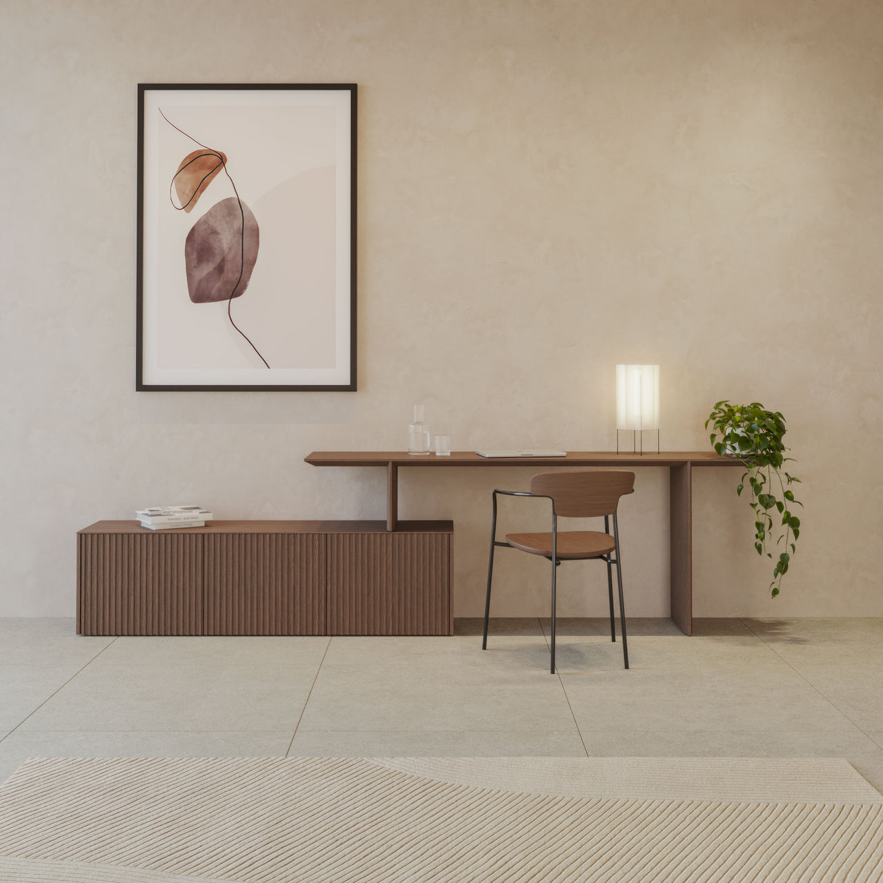 The Velasca Desk features a solid oak storage unit adorned with hand-glued vertical strips, enhancing its three-dimensional texture. An extendable top with chamfered legs offers versatility, allowing the workspace to adapt to various needs. This design not only provides ample storage but also brings warmth and architectural sophistication to both home and professional environments.
