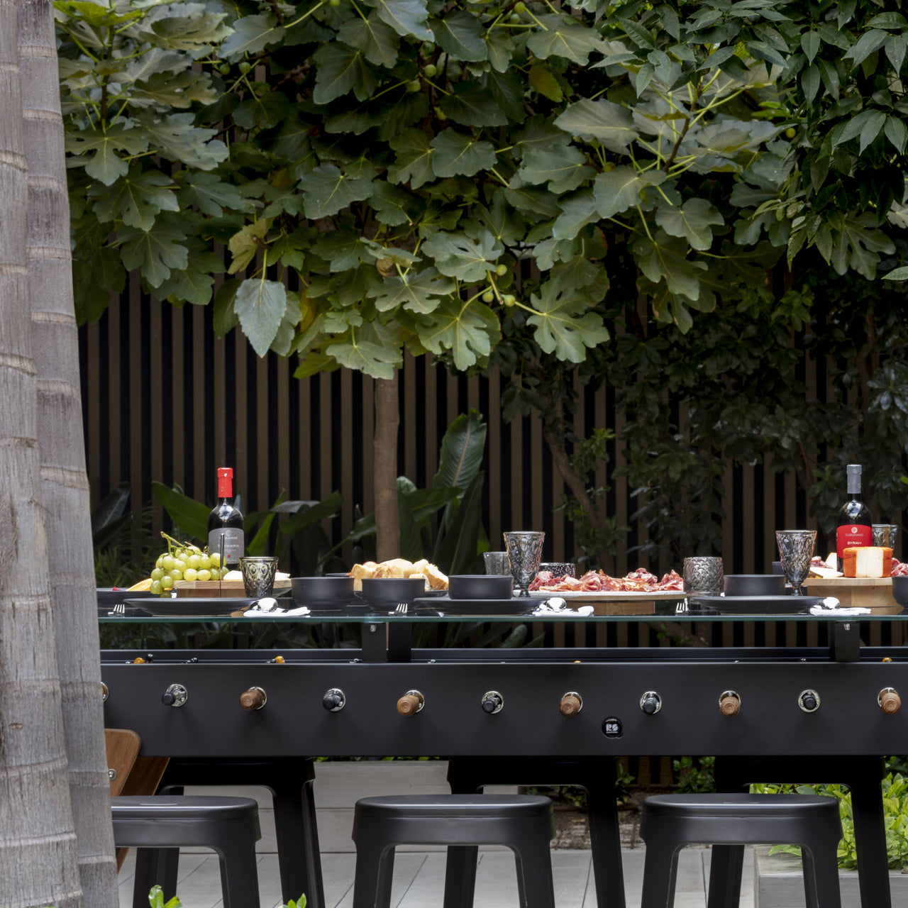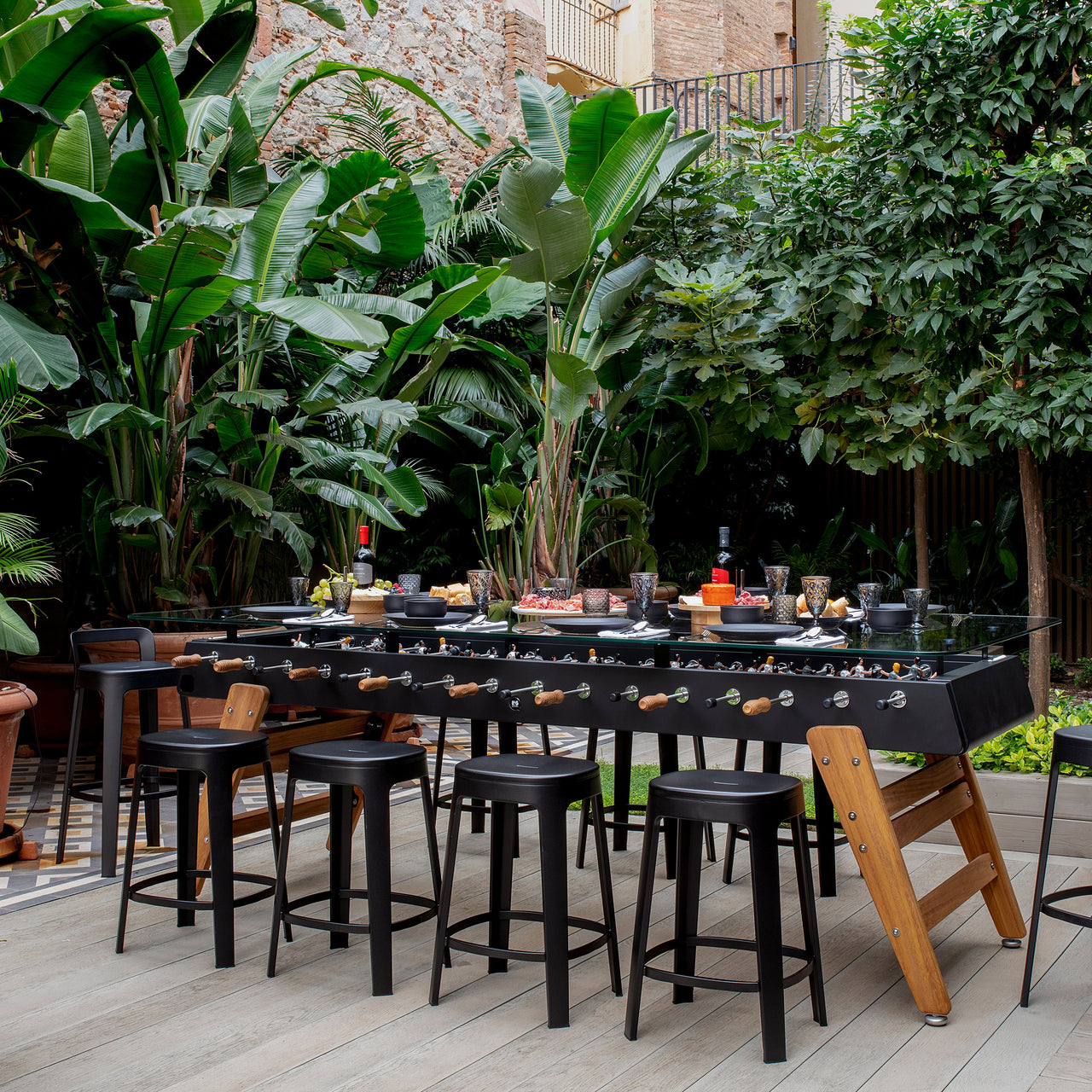 Call it the new training table. Max Dining supersizes simultaneous gameplay and mealtime for a crowd with RS Barcelona’s longest dual-purpose table. Equally suited to hospitality, office or at-home environs, designer Rafael Rodriguez adds a tempered-glass tabletop to his extended version of brother RS#3 Wood. Stretched out and resized, it doubles the fun, for 8 players instead of 4. Rated for use inside or outdoors, Max comes in white, black or green—and stands up to intense play with its steel structure and cataphoretic coating process with a polyester paint finish. Iroko wood legs and handle. Players are rendered in cast aluminum (the set includes 5 standard and 2 silent balls and 4 extra players,2 per team; customized players available).