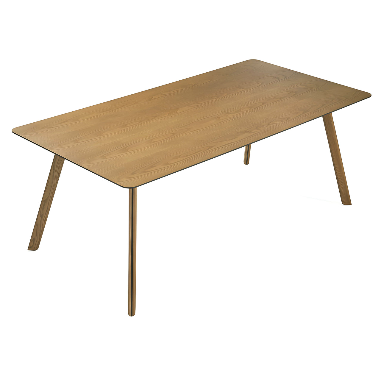 This dining table features clean lines that highlight the natural grain of ash wood. A black metal structure frames the legs, adding a subtle detail. Available with a rectangular top and in two sizes.