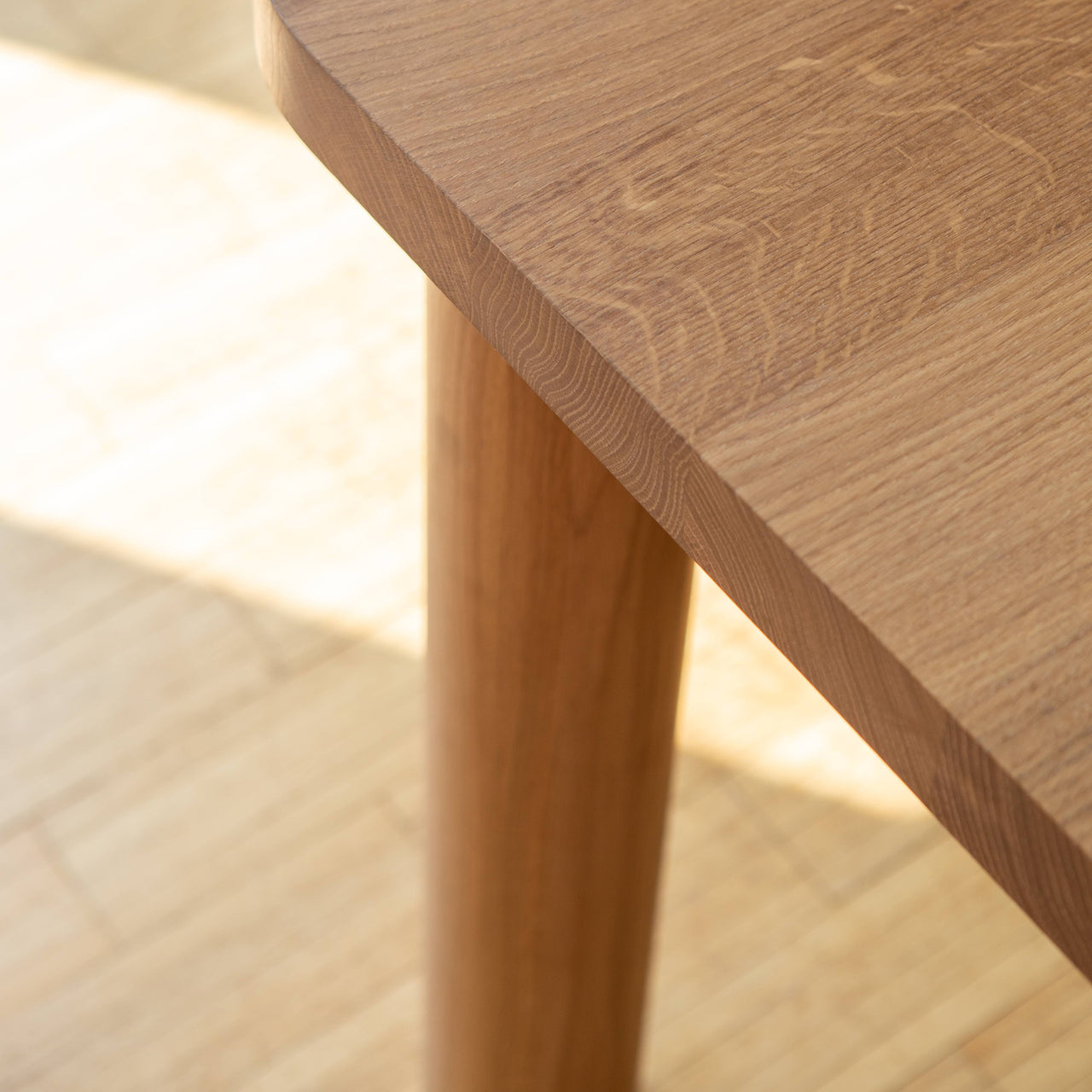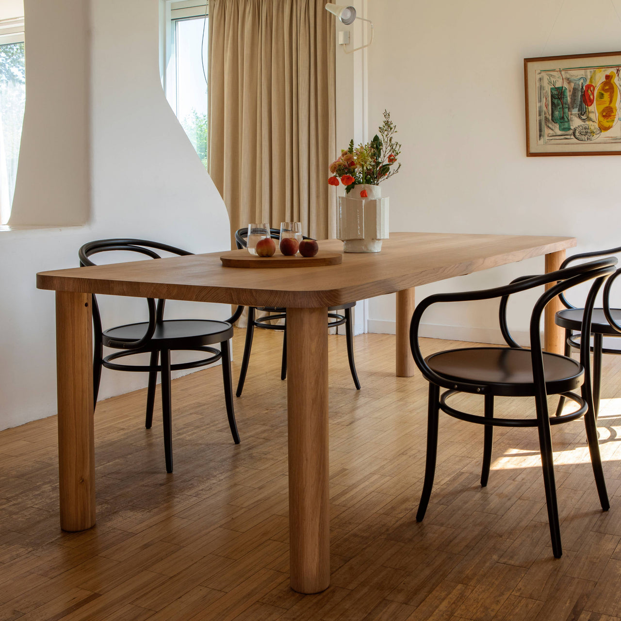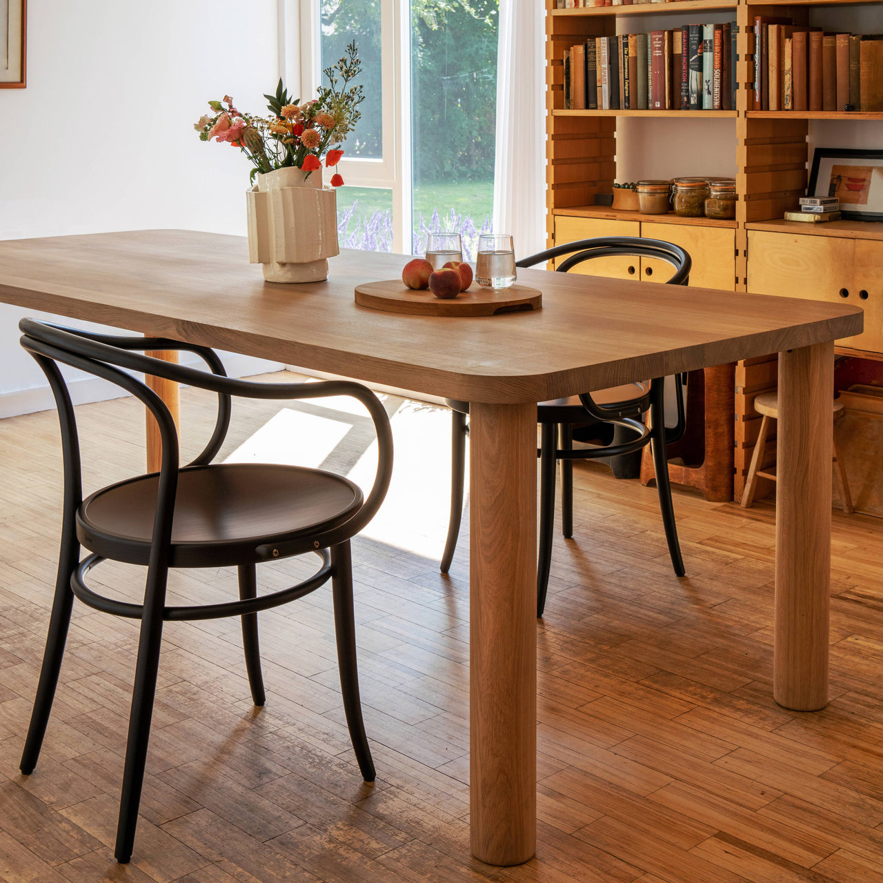 With Grove, British designer Matthew Hilton says he wanted to reduce his table down to the essential elements to increase its versatility. Crafted in solid FSC European oak, it has large cylindrical legs and a top with gently curved edges. The details are intentionally spare and give the table a modest character, with the legs at the corners inlaid a little from the edge. Cleverly engineered, a complex joint hidden underneath pairs a metal plate with custom fixings for an extremely strong connection.