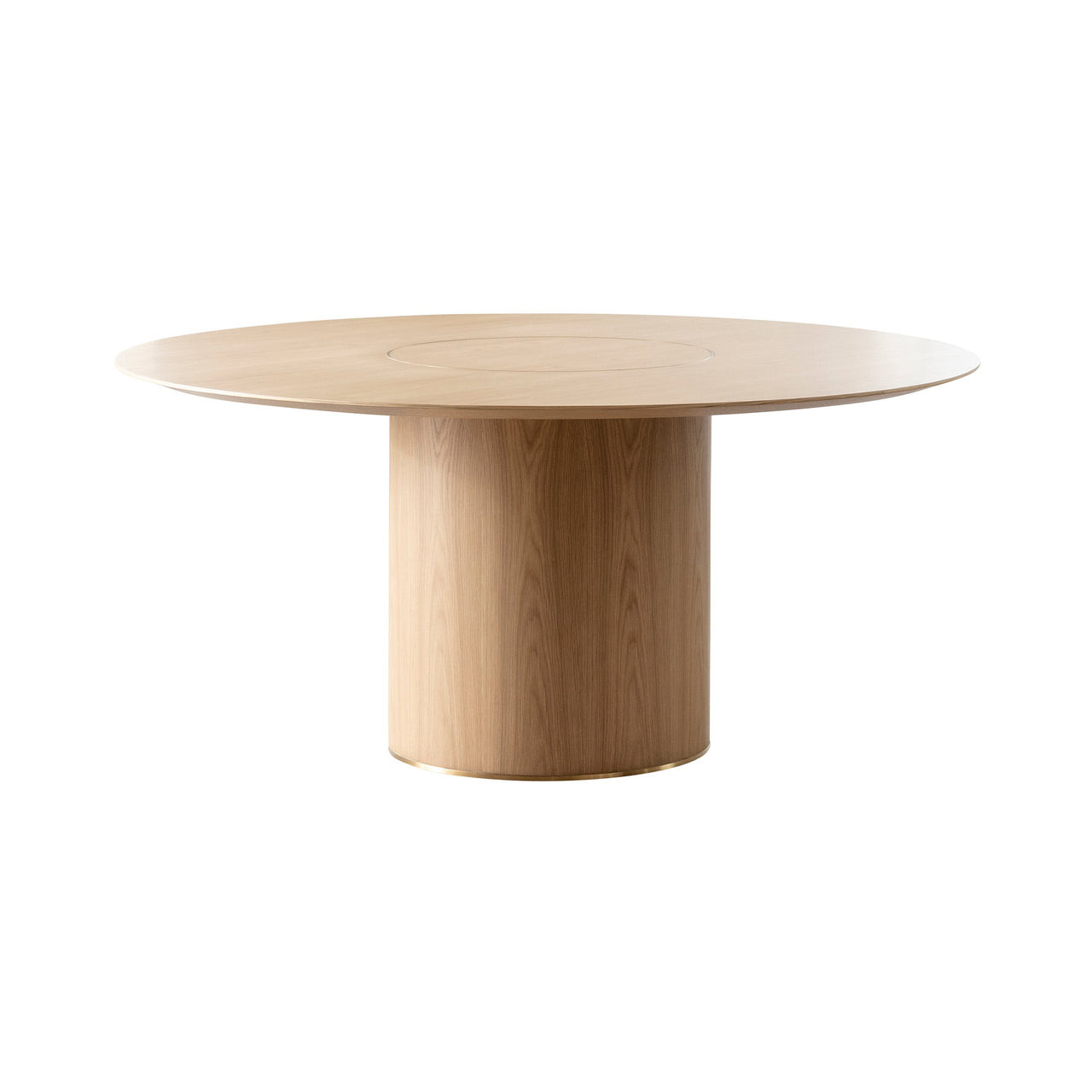 Veering away from Crawford collection's characteristic mix of wood and blackened steel, this dining table with a column base makes an an impressive statement completely fashioned in rich veneer. Graced by a brass-finished stainless ring detail inset on the round tabletop and at the base, designer Tom Fereday offers this piece in a delectable range of woodgrain finishes. Sourced from FSC-certified sources, it's a masterful addition to any dining environ— a forever choice, painstakingly crafted and timeless in its appeal.