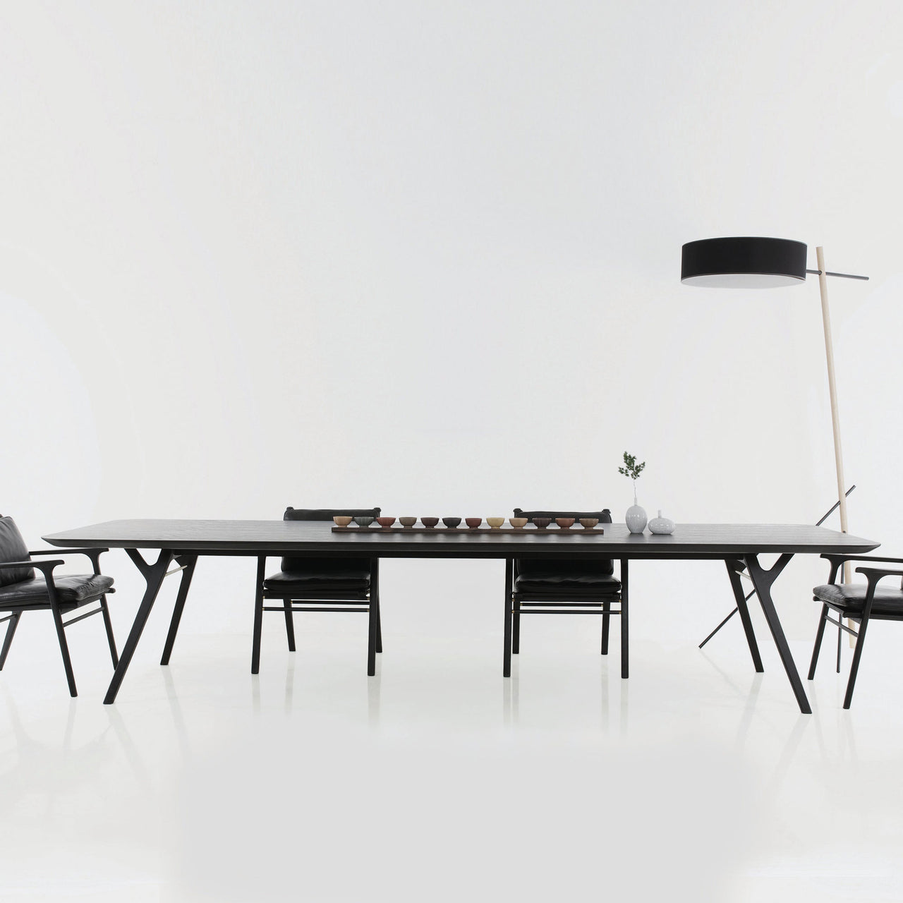 Resoundingly handsome but not overdesigned, this superb conference table embodies both the Danish Modern tradition and an eloquent Asian simplicity. Spanning more than 11 feet in length, it is crafted in solid ash with brass-plated detail and graced with a veneer laminate tabletop with an elegantly angled edge. Space Copenhagen designers Signe Bindslev Henriksen and Peter Bundgaard Rutzou aim for a global sensibility—also reflected in the maker Stellar Works, which combines state-of-the-art production expertise based in Shanghai with an international slate of acclaimed designers.